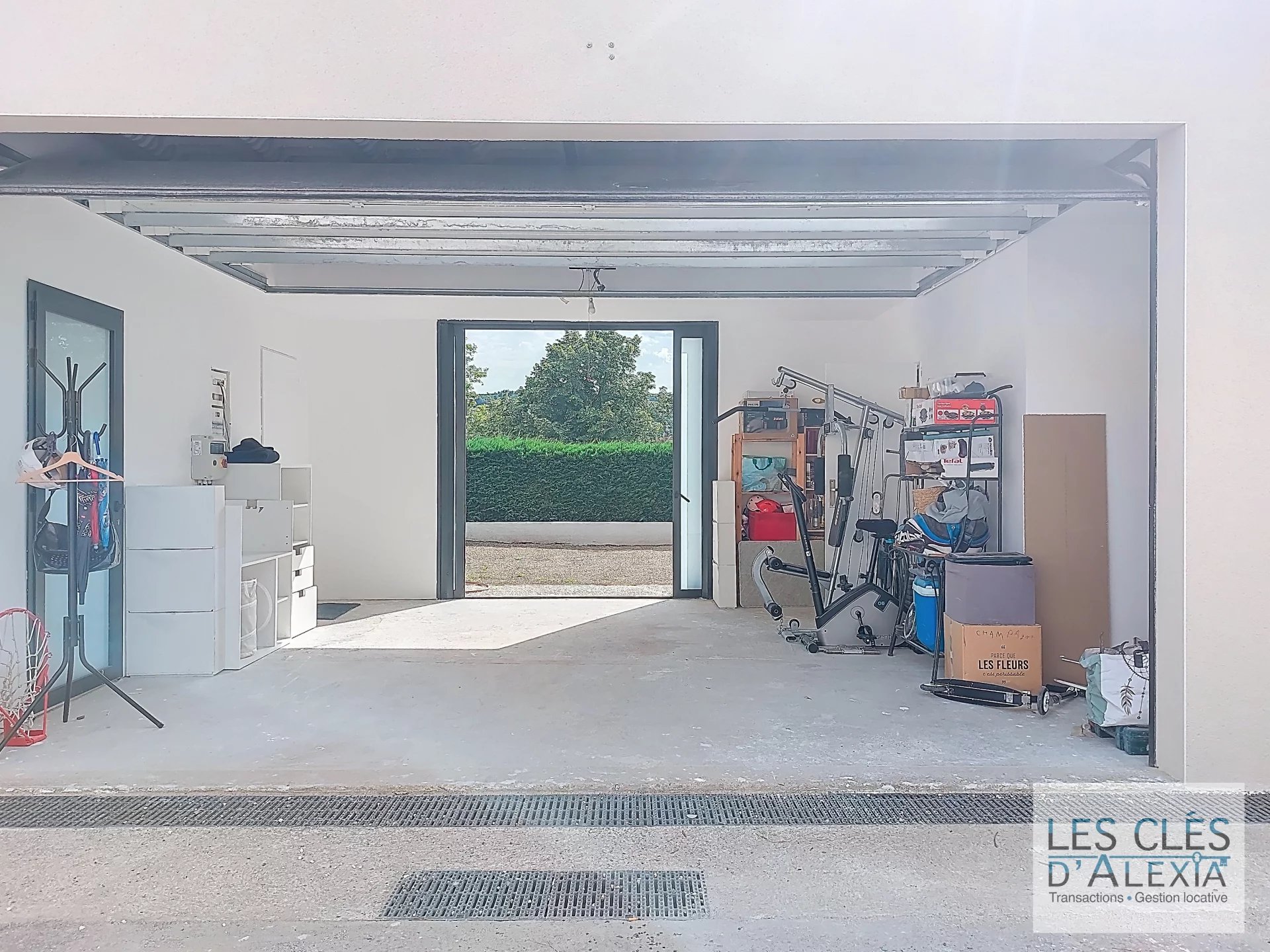 Garage double traversant de 5 m de large, accessible via porte sectionnelle, facile à utiliser et sécurisé.