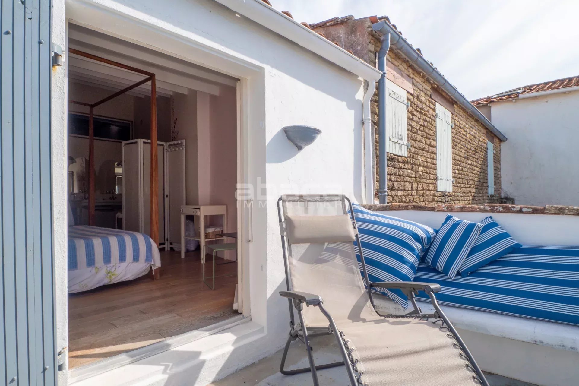 A quelques pas du marché, nichée dans une venelle typique des Portes en ré; Jolie maison de village élevée sur deux niveaux et comprenant au rez de chaussée : entrée dans séjour avec cheminée, cuisine séparée, dégagement vers salle d'eau + wc, bureau/cabine. A l'étage, palier desservant une chambre principale avec salle d'eau et toilettes ouvrant sur une charmante terrasse avec vue sur le village, 2 autres chambres complètent l'étage. La maison dispose d'une cour et d'un local vélos. C'est un bien rare, à découvrir avec l'agence ABACA Les informations sur les risques auxquels ce bien est exposé sont disponibles sur le site Géorisques : www.georisques.gouv.fr