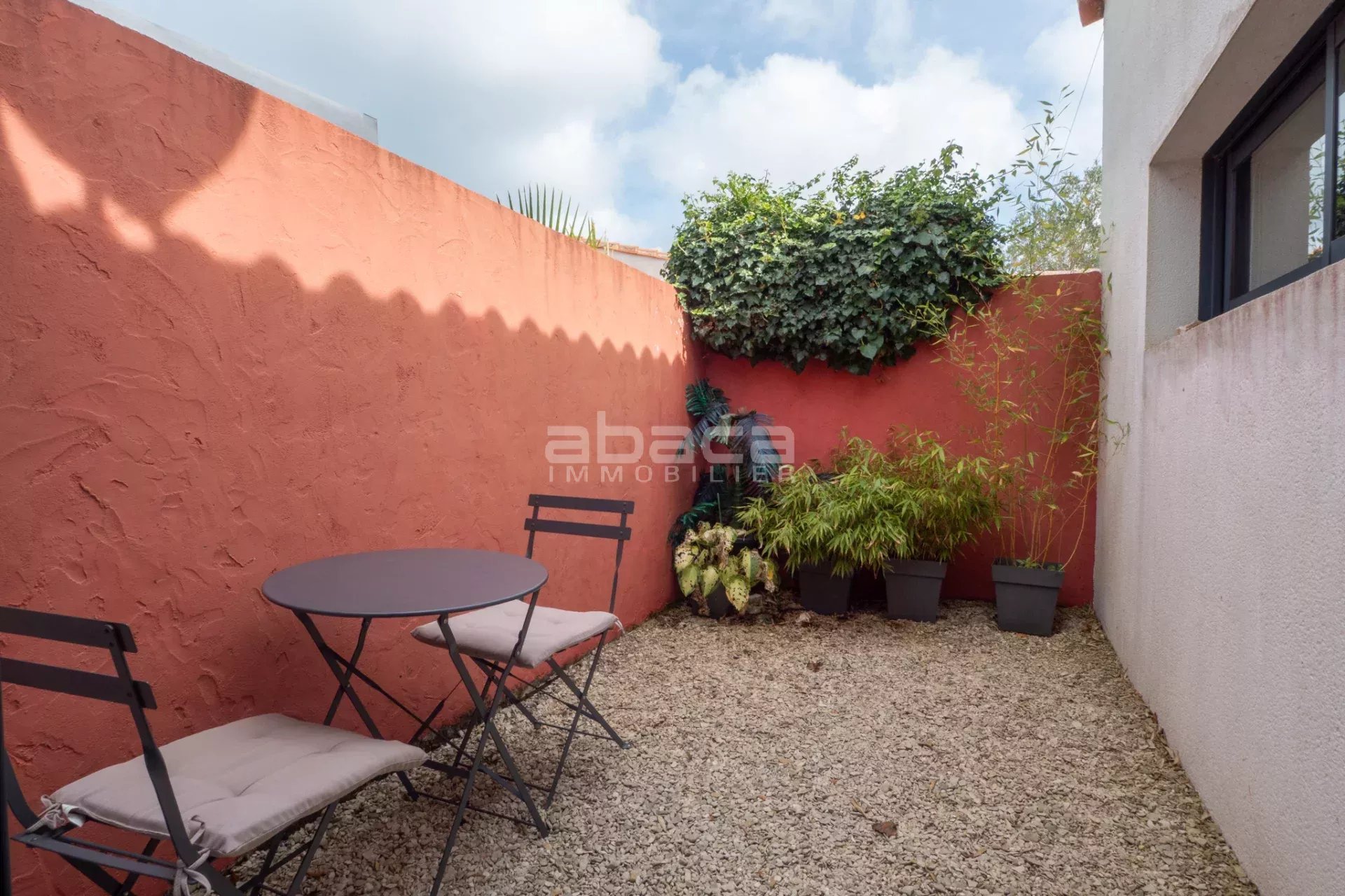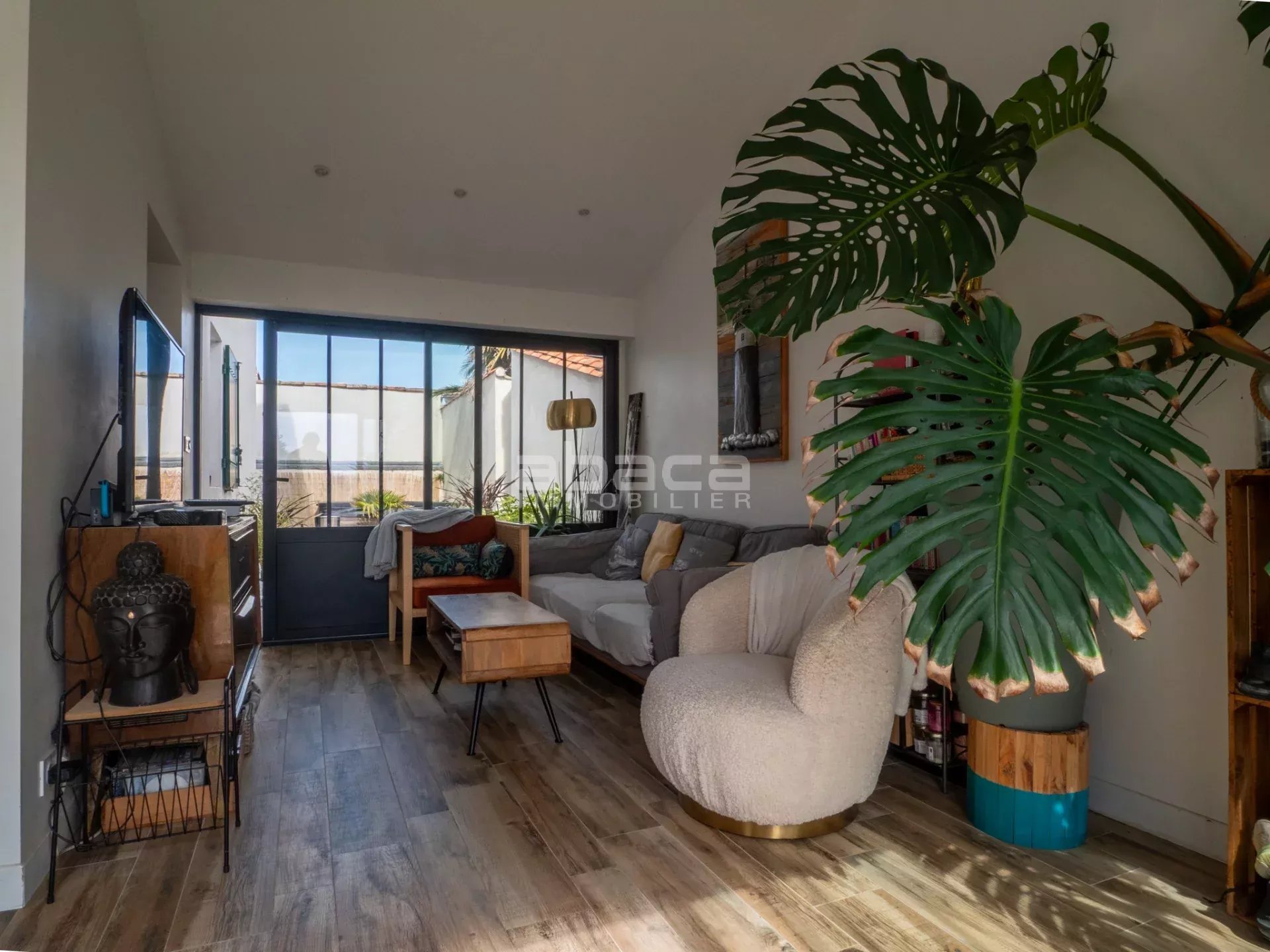 Enfin, en mitoyenneté se trouve une autre maison de type 2 avec cuisine équipée, séjour, chambre, salle d'eau et toilettes, le tout ouvrant à la fois sur un petit jardin à l'arrière et sur un joli jardin avant avec stationnement couvert.