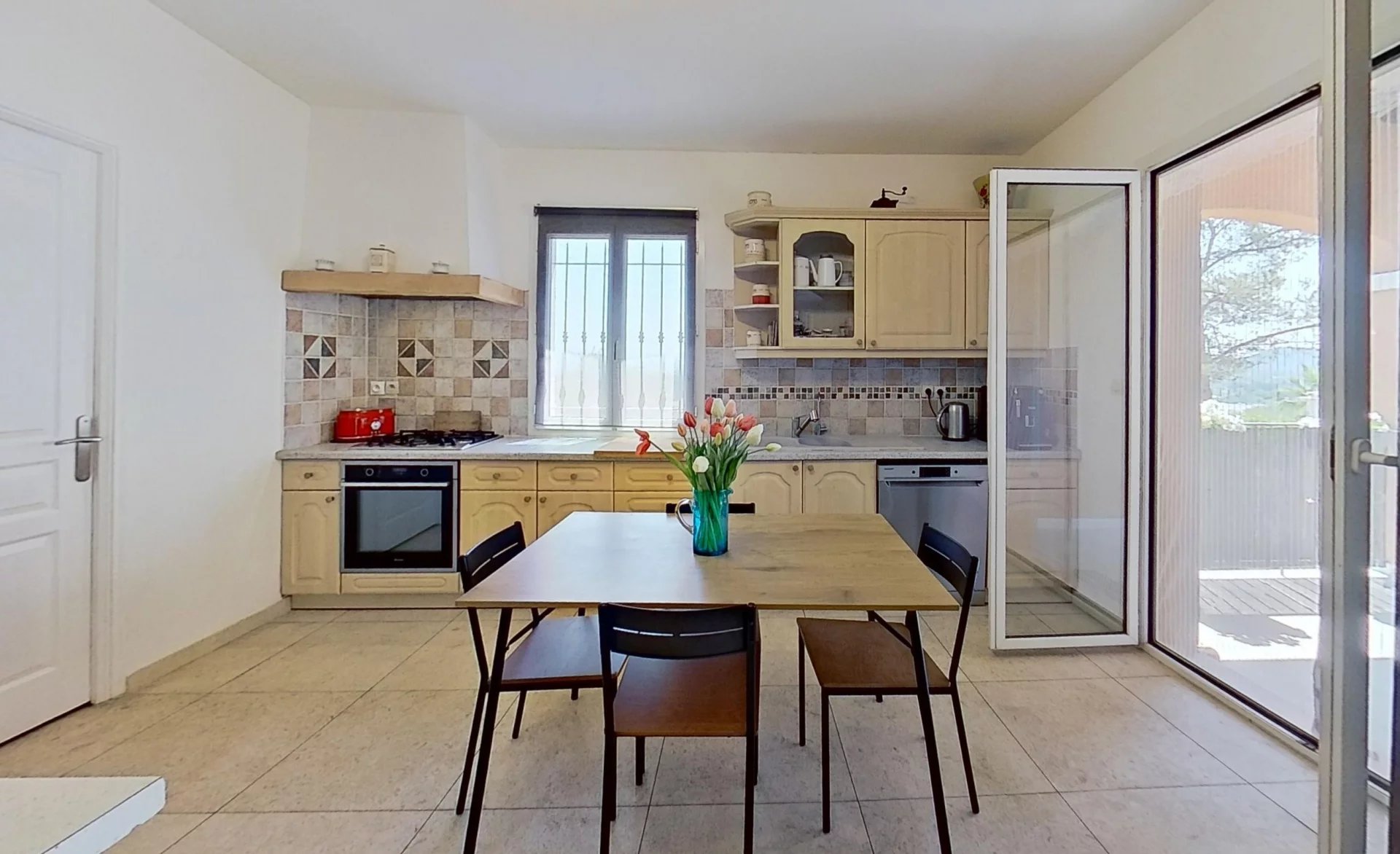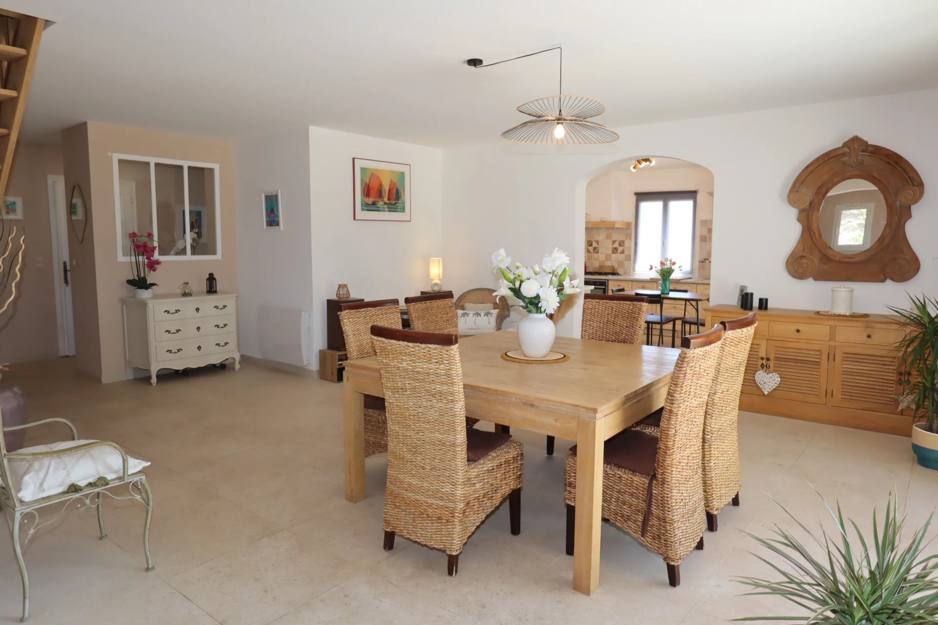 Salle à manger + Salon indépendant avec cheminée insert (pouvant devenir une cinquième chambre) - Cuisine ouverte aménagée et équipée + cellier.