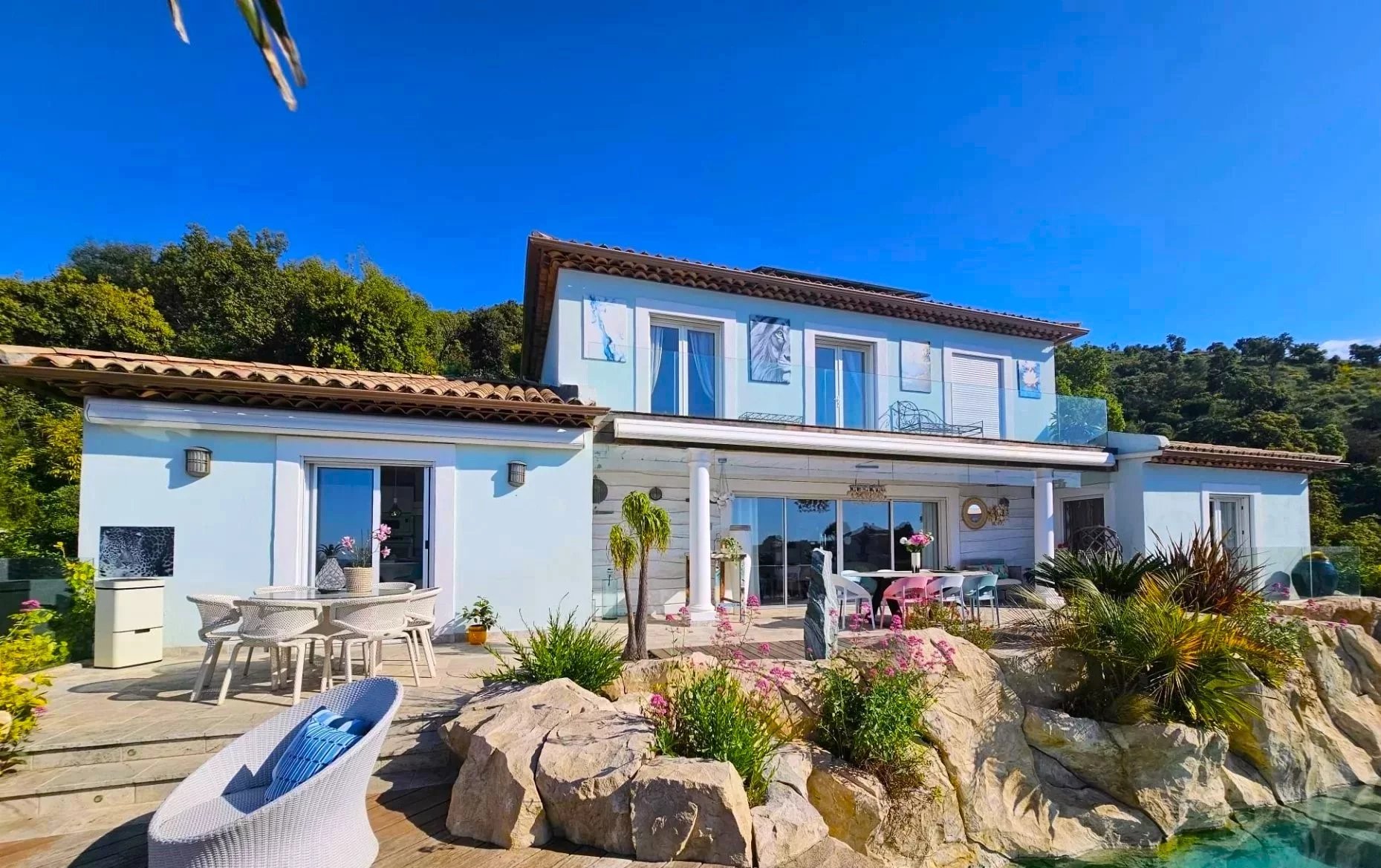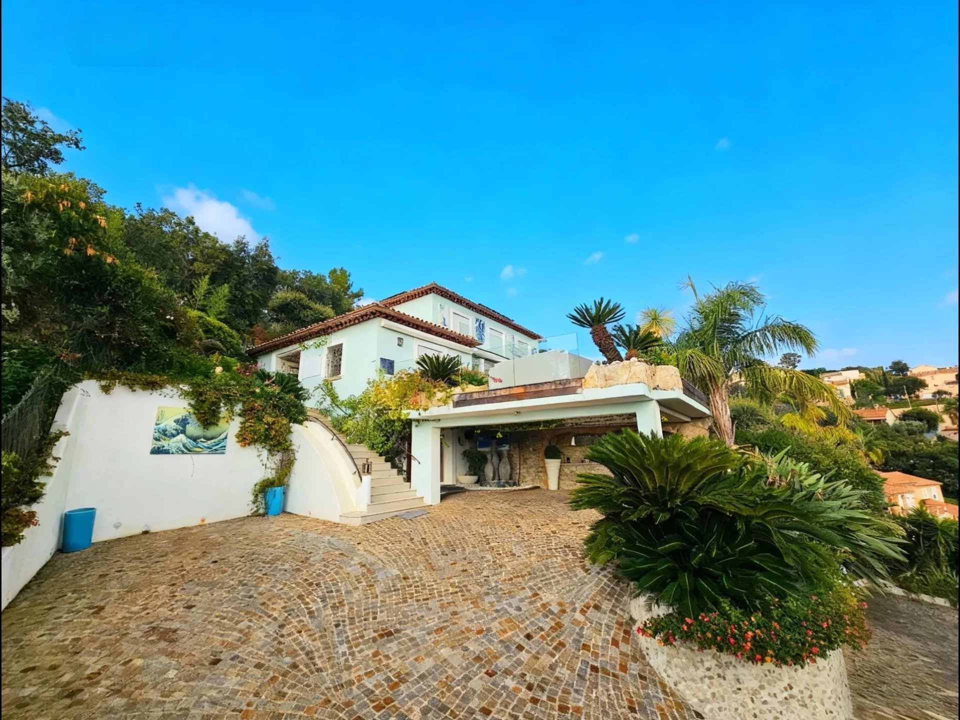 L’accès à la propriété lui-même esquisse l’expérience : une allée serpente entre les essences tropicales et méditerranéennes, avant de révéler la demeure élégante suspendue entre ciel et mer.