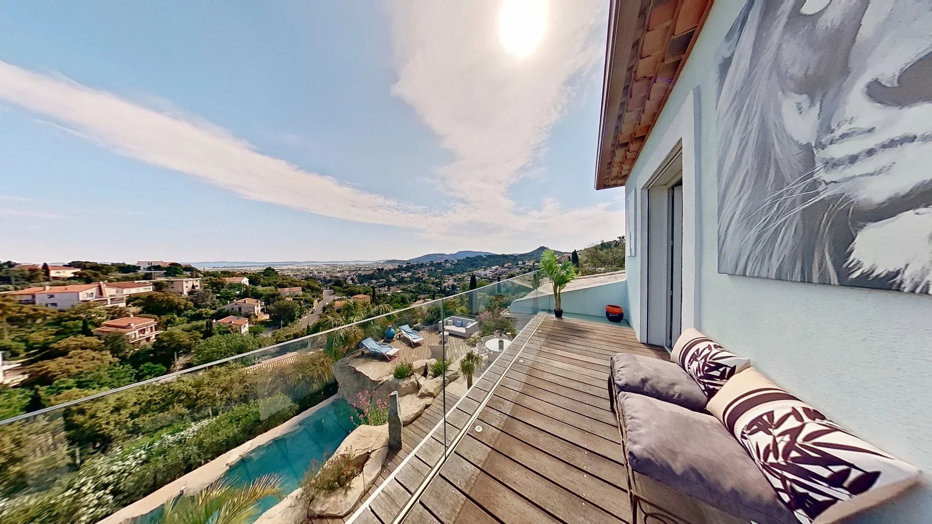 Surplombant Hyères et la Méditerranée, la villa offre une échappée à 180° sur le Tombolo, la presqu’île de Giens, les Îles d’Or ainsi que sur les vestiges du château médiéval et la Villa Noailles.