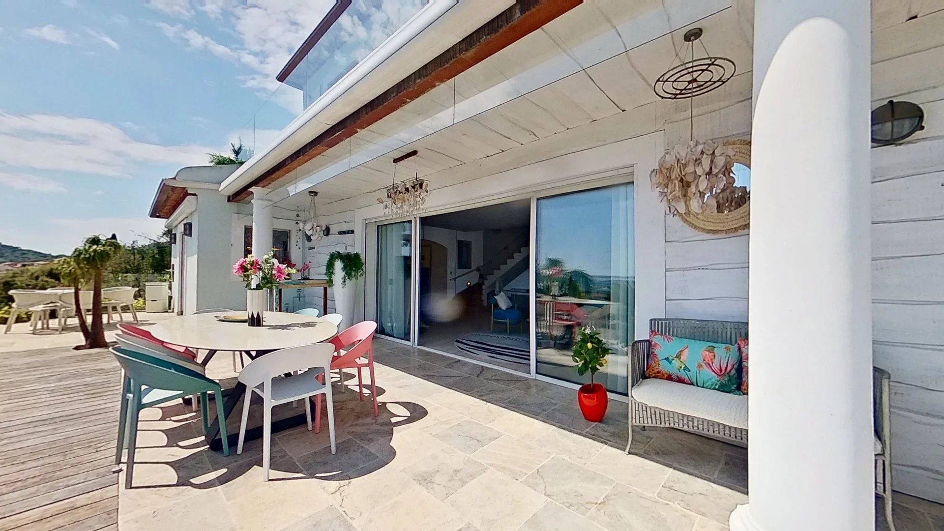 À l’étage, trois pièces claires s’ouvrent sur une magnifique terrasse filante offrant une vue dégagée sur la mer et la végétation, dans une atmosphère douce et aérienne.