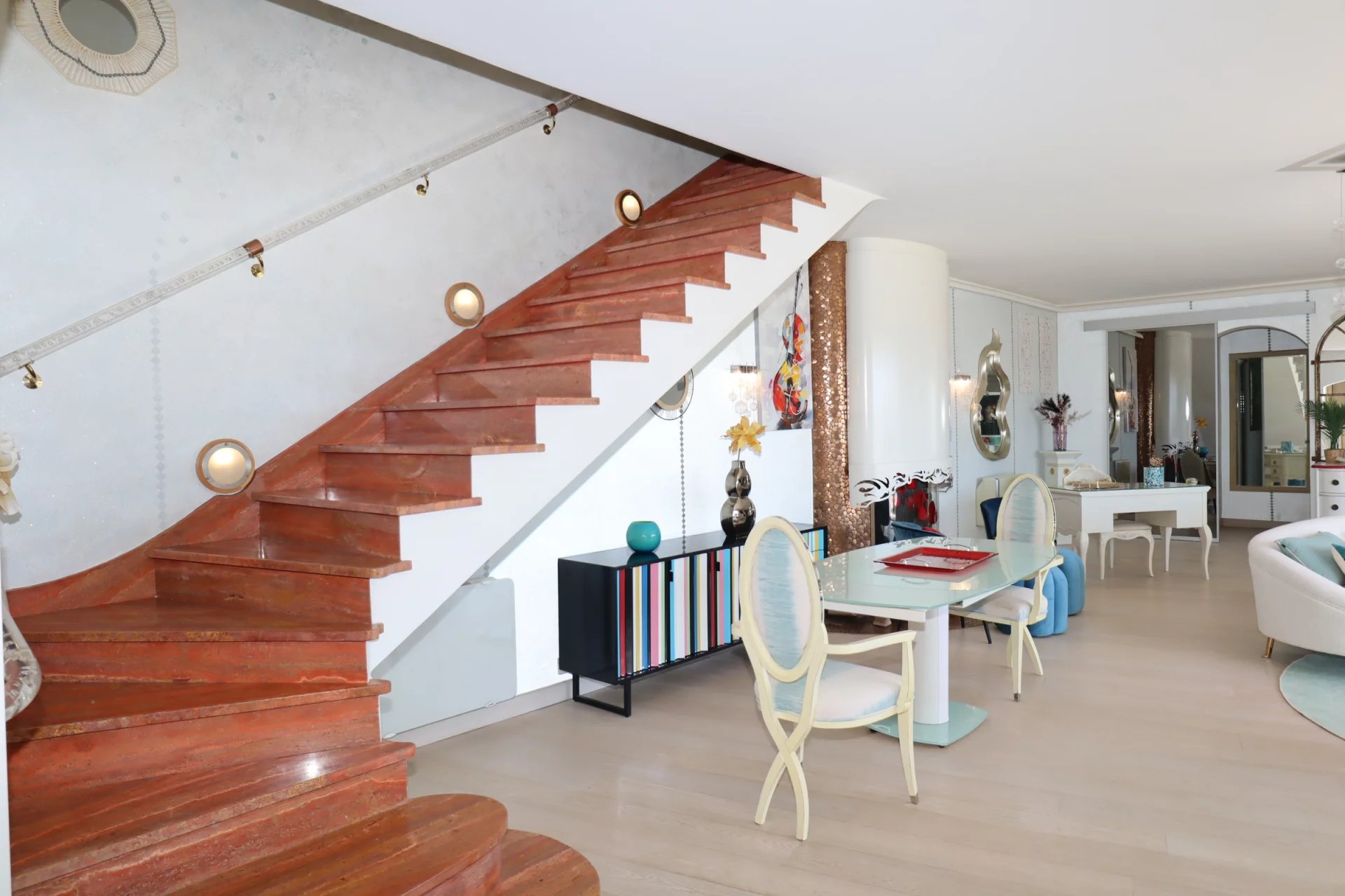 L’escalier, orné d’une rampe en verre bullé et laiton, relie les étages comme un fil de lumière.