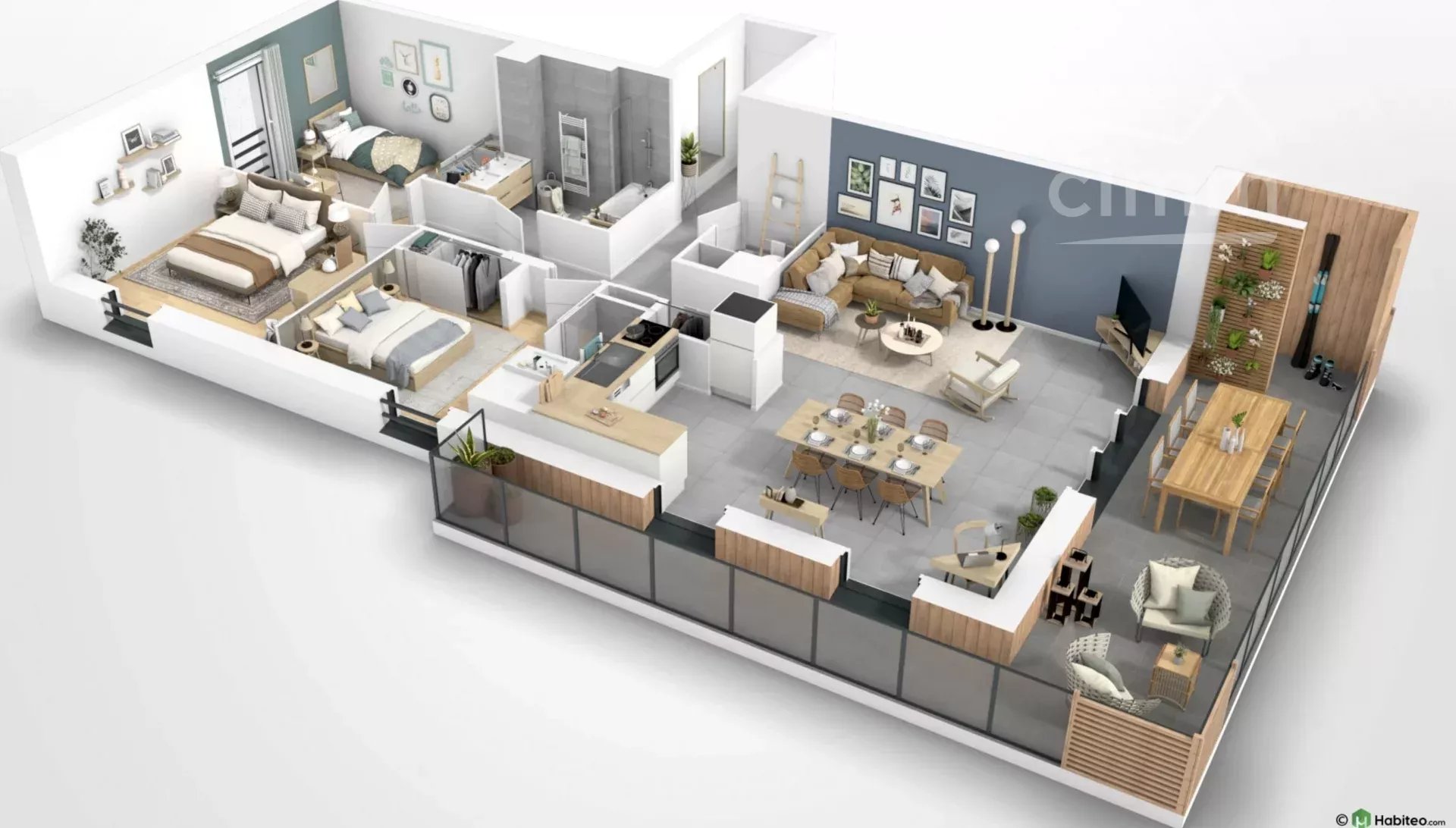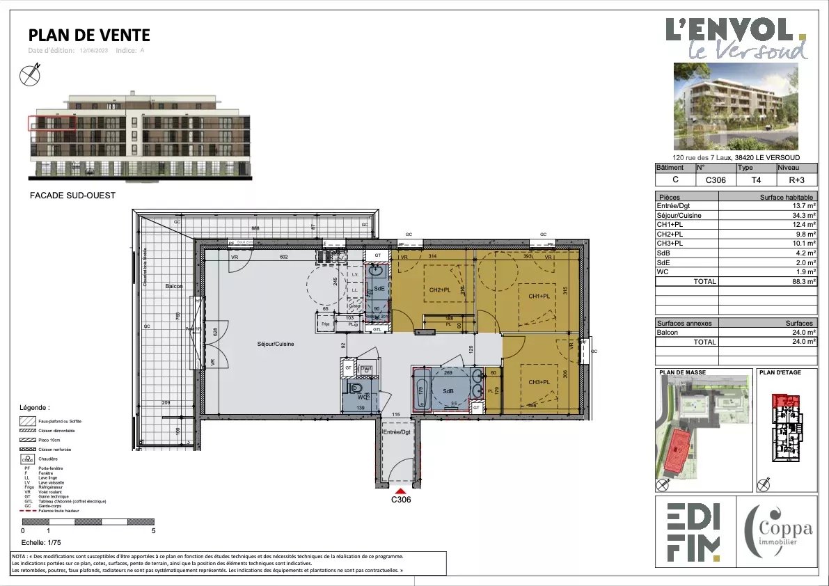 - Séjour / cuisine de 34m² avec porte fenêtre en accès direct sur la terrasse de 24m²