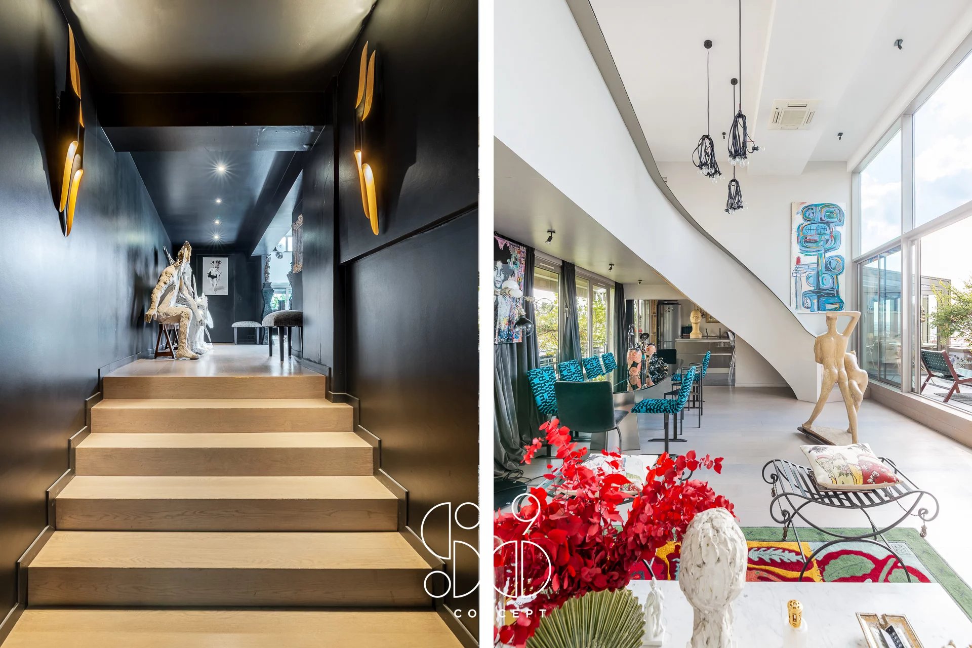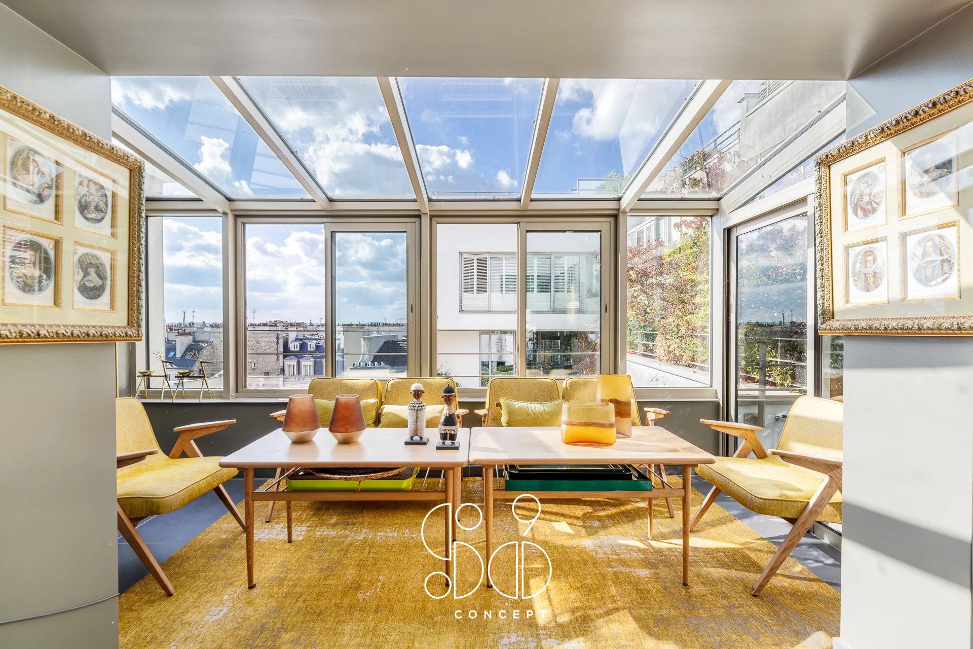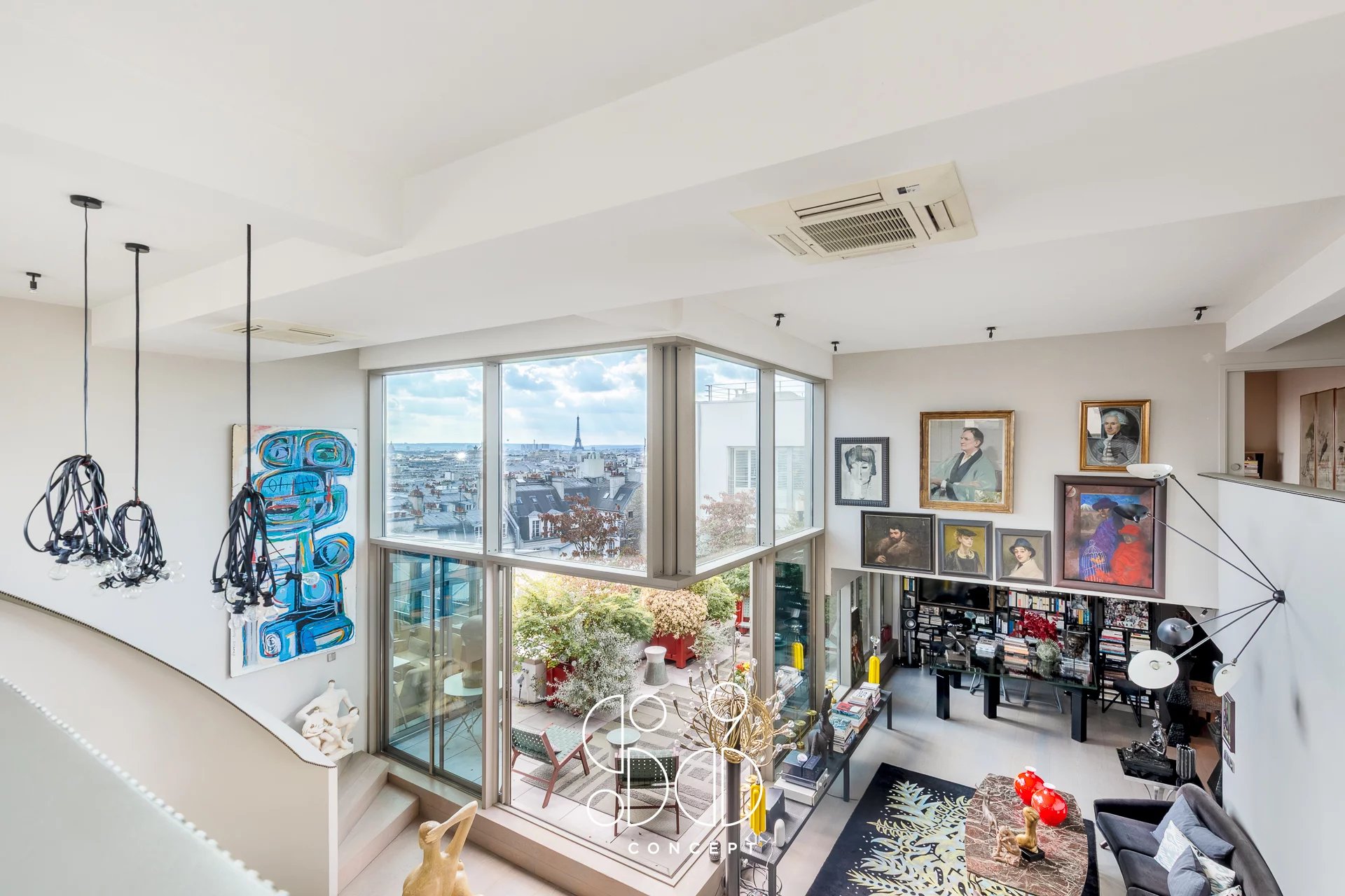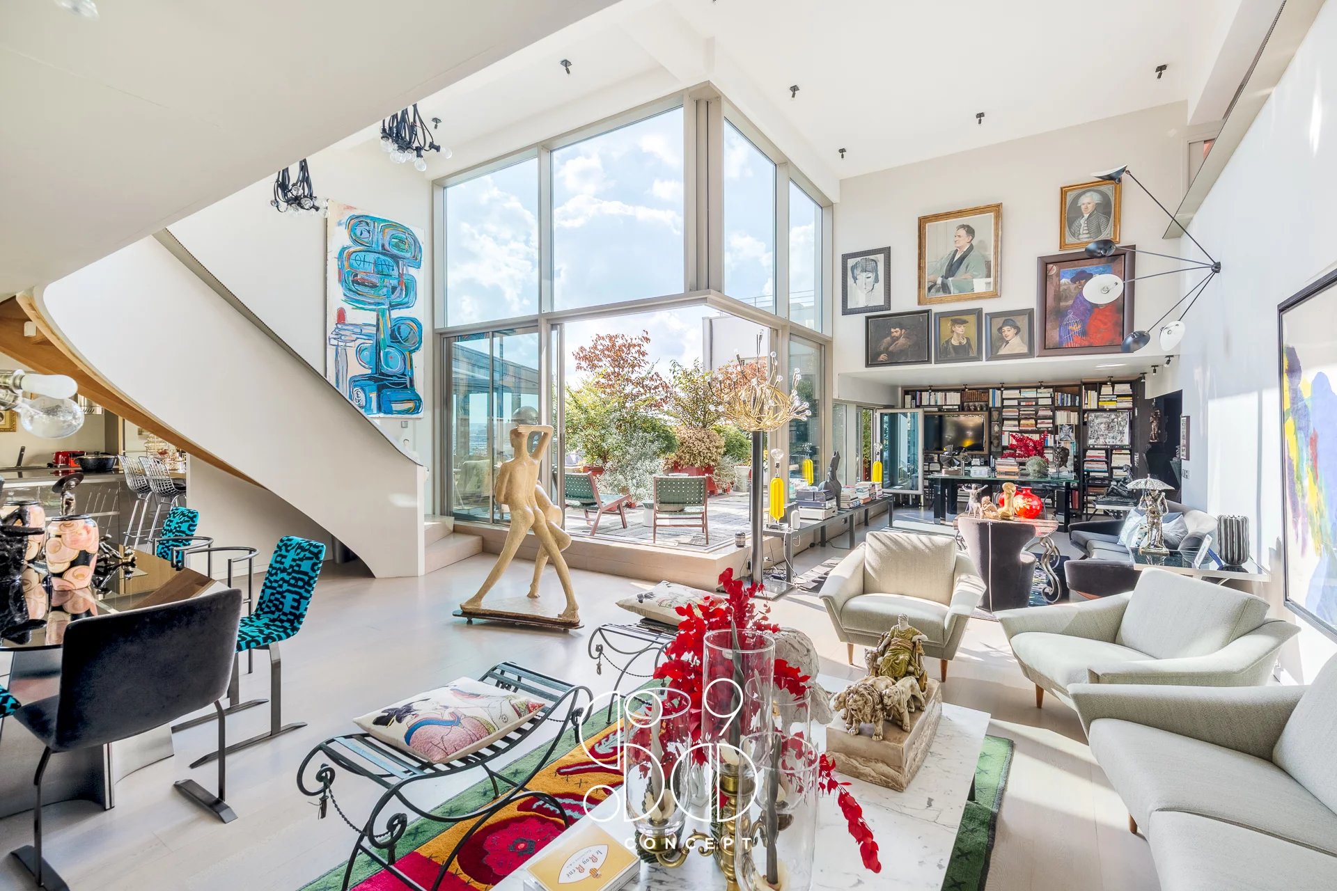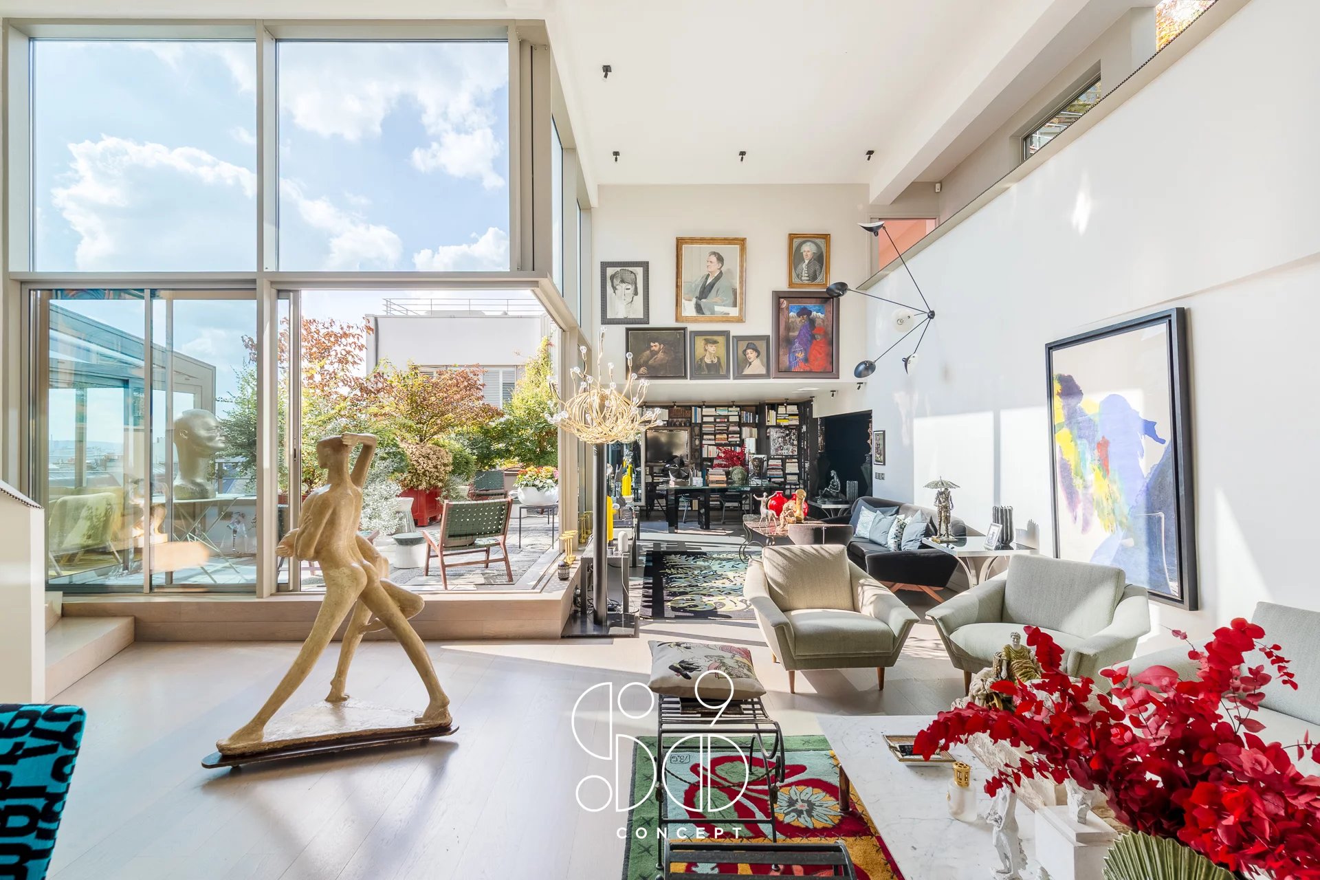 Il se compose d’un salon de plus de 60 m², aux 5 mètres de hauteur sous plafond, baigné de lumière et ouvrant sur une terrasse de 25 m² avec vue dégagée sur la capitale.