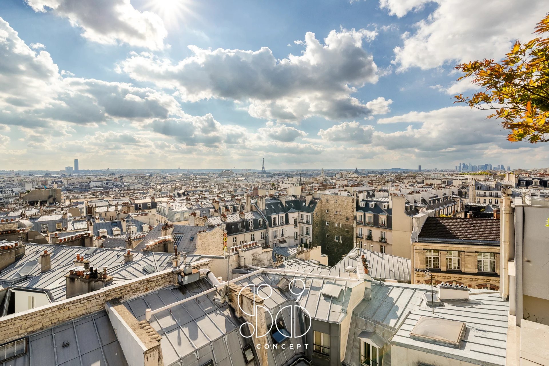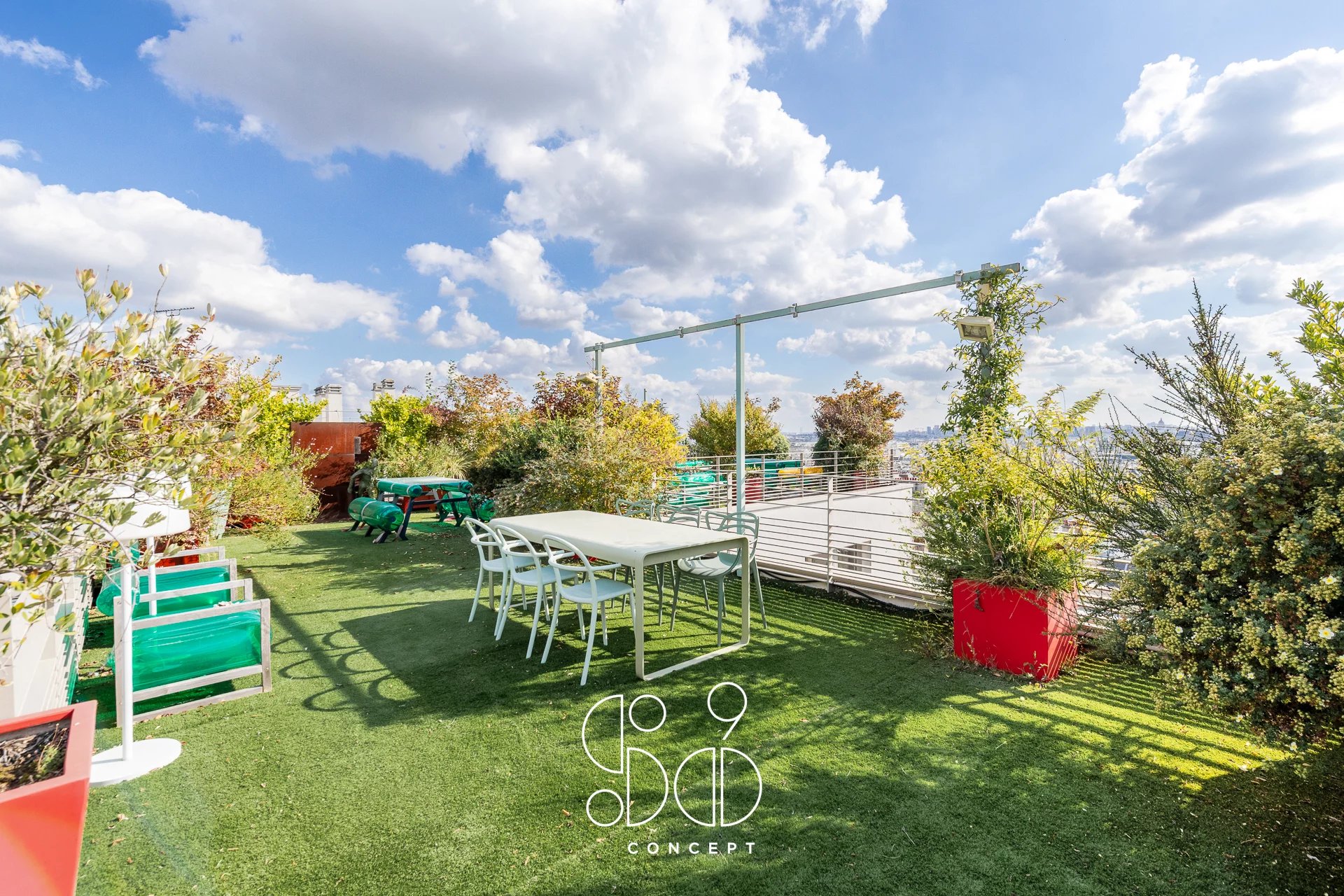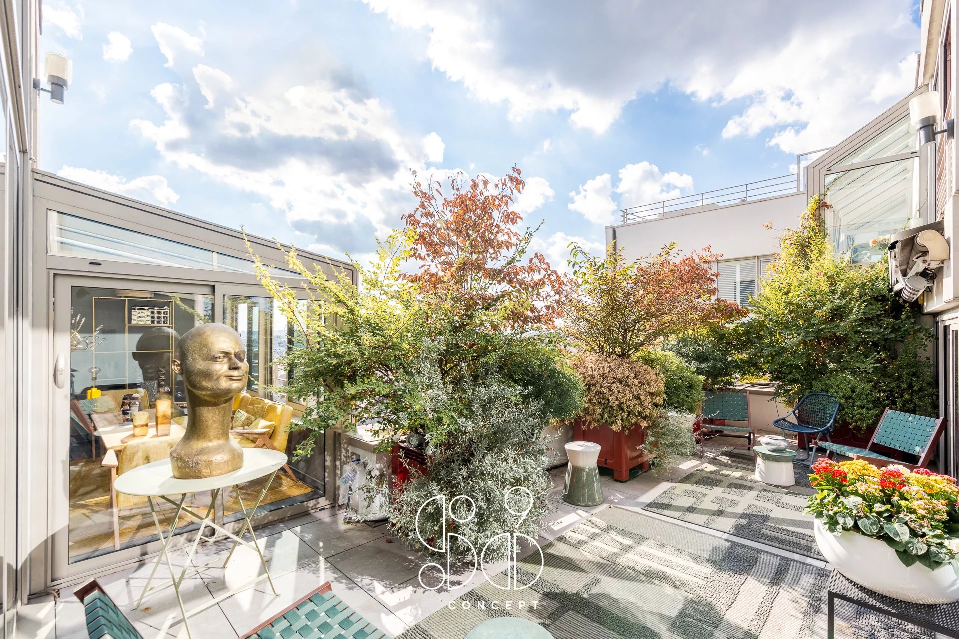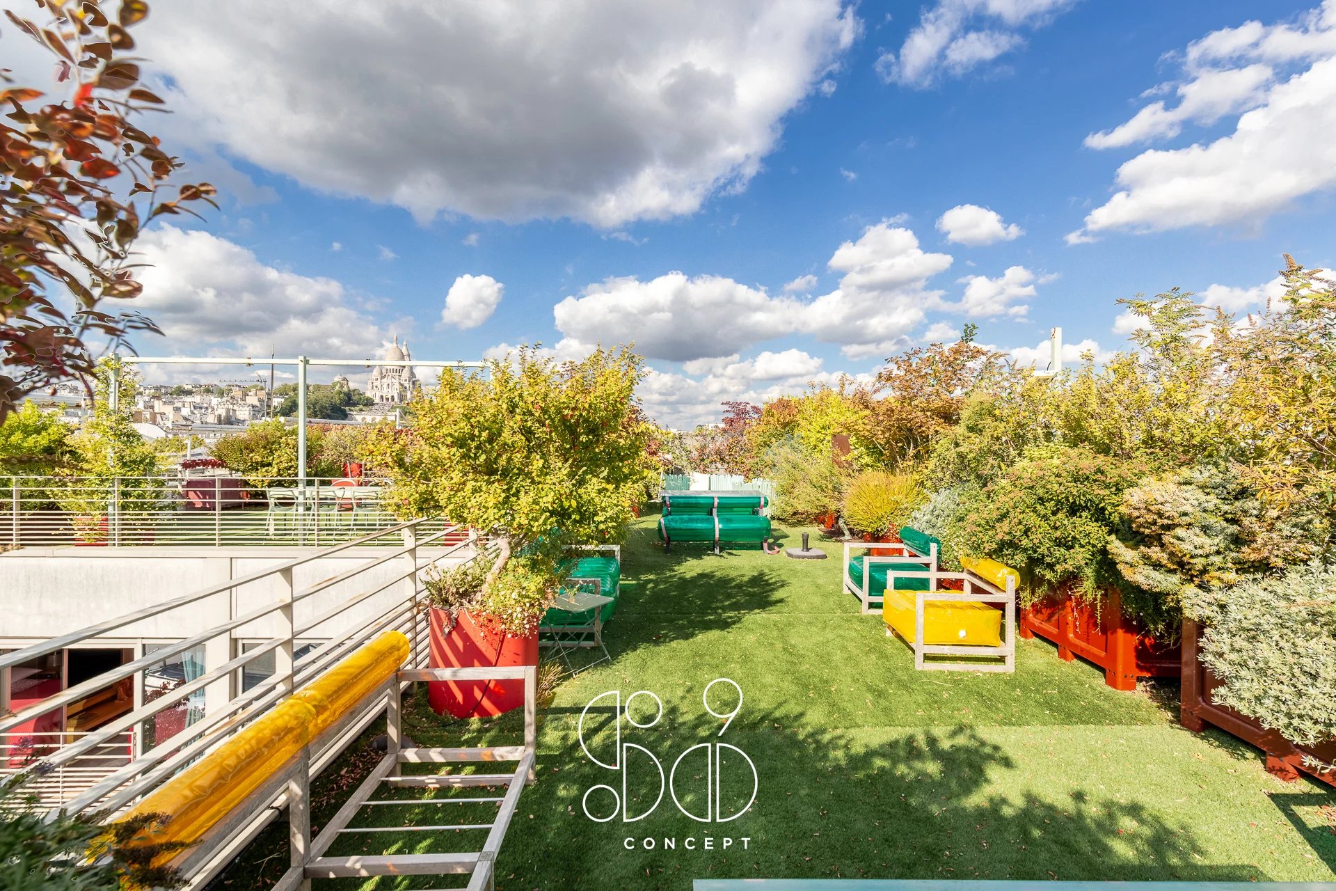 Enfin une terrasse exceptionnelle de 130 m², véritable écrin de verdure en plein cœur de Paris offre une vue sur tous les momuments de la capitale, à l'abri des regards et au calme.