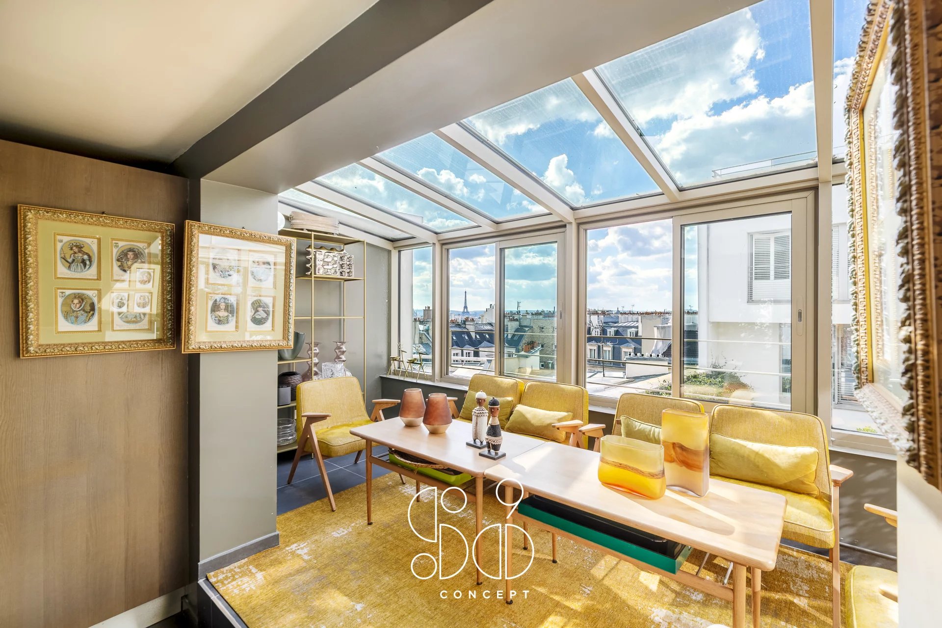Une cuisine équipée avec véranda, profite d’une vue directe sur la Tour Eiffel.