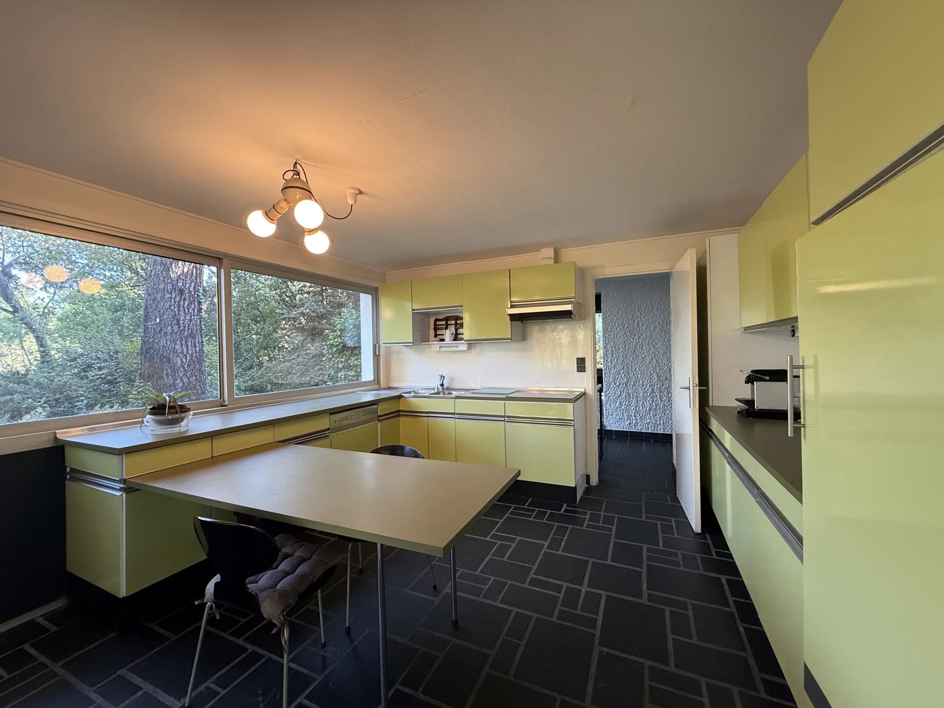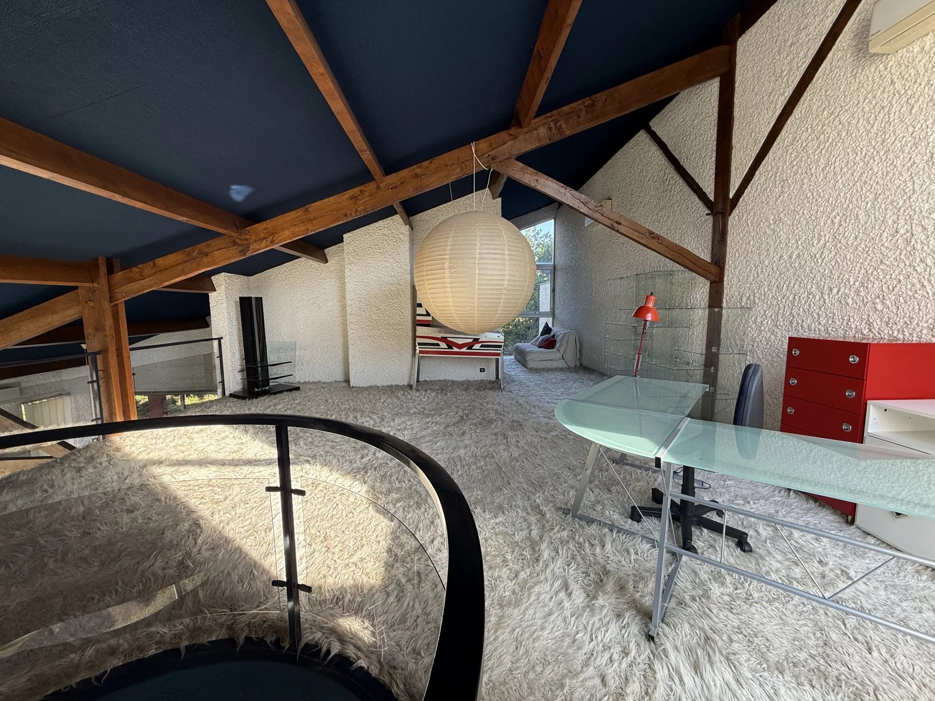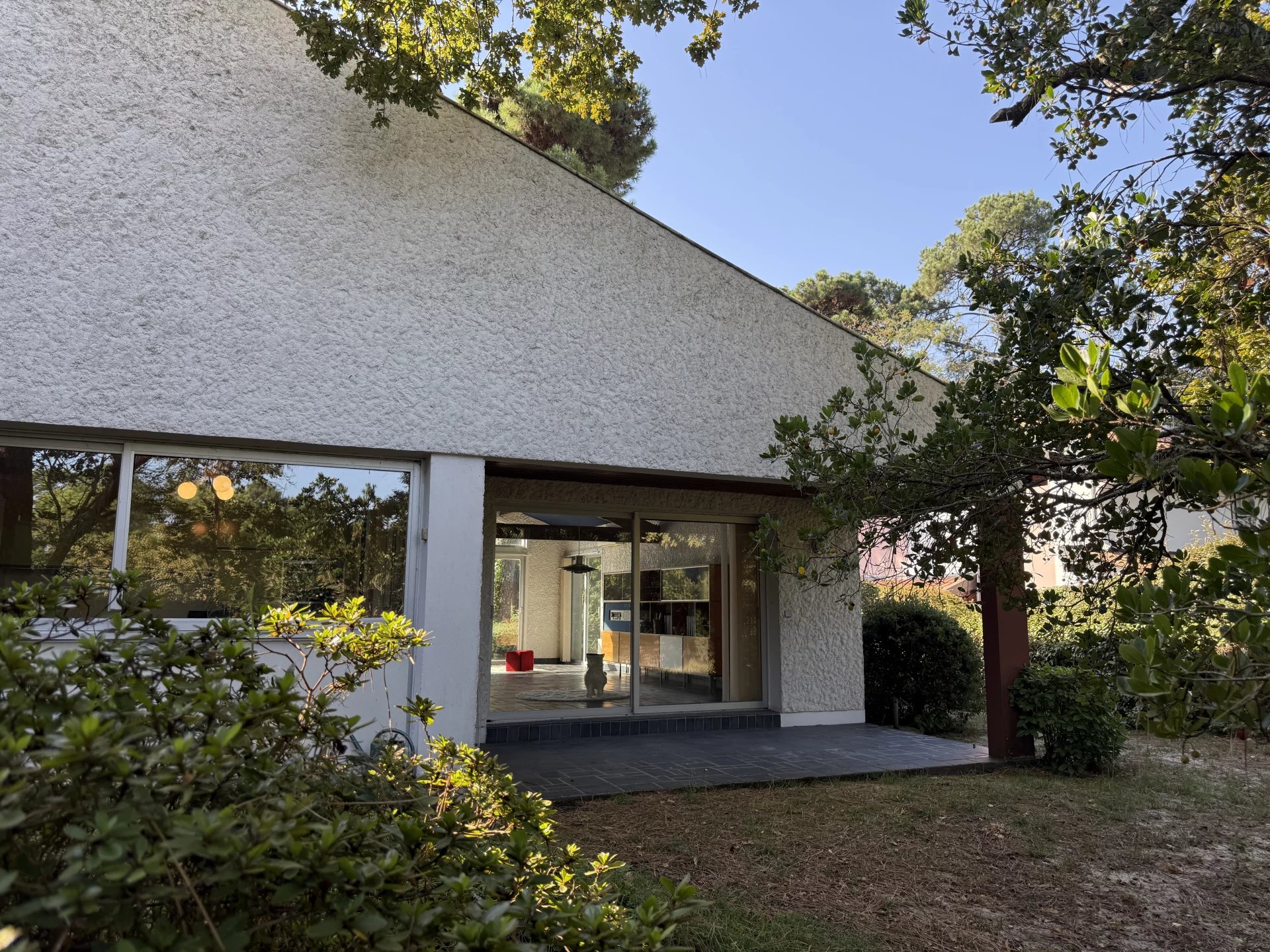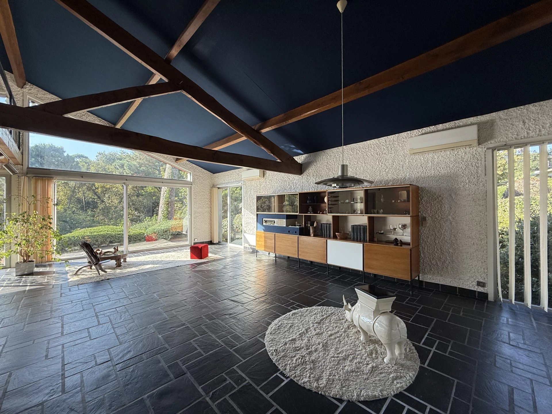So Seventies ! Surplombant la cime des pins, une signature architecturale aux arêtes vives flanquée de volumes impressionnants baignés de lumière. C’est le parti pris de cette maison au design audacieux ancrée au sommet de l’historique quartier Pereire et dont les espaces intérieurs ont autant de souffle que la façade a de caractère. Plein sud, l’espace de réception de plus de 65m² est posé sur un opus d’ardoise au rythme des années 70. A une hauteur hors norme, la charpente traditionnelle vient souligner un volume atypique auquel s’accroche une mezzanine de près de 60m². Un escalier hélicoïdal de designer vient connecter les deux niveaux tel une liane de métal. La cuisine aux couleurs acidulées s’ouvre sur une terrasse arborée et un petit chemin de traverse qui permet d’accéder à la plage en quelques minutes à pied. Une suite avec salle d’eau privative, 2 chambres, une salle de bain et des toilettes invités complètent le rez-de-chaussée. La mezzanine de très grande hauteur pourrait accueillir une suite parentale ou conserver sa fonction actuelle de pièce de divertissements. Le sous-sol intègre un garage, une cave à vin et une réserve. Le temps s’est arrêté dans les années 70, cristallisant un style de vie rythmé par des volumes uniques et une partition des pièces très fonctionnelle. Pour autant, la conception de cette villa permettrait une réinterprétation moderne sans dénaturer le caractère affirmé de son architecture. Les informations sur les risques auxquels ce bien est exposé sont disponibles sur le site https://errial.georisques.gouv.fr/#/