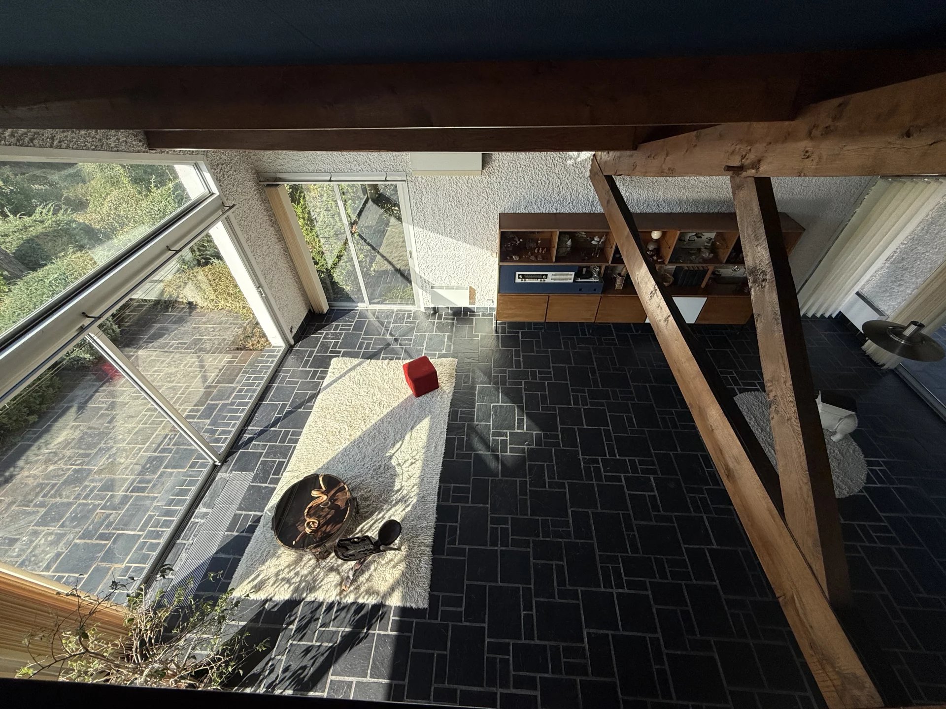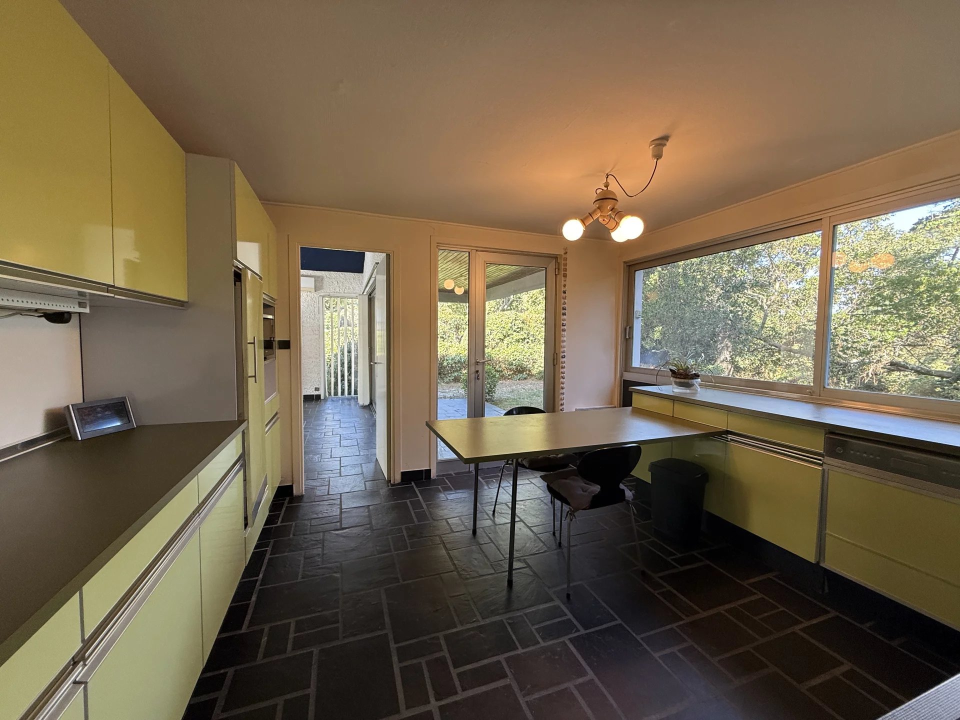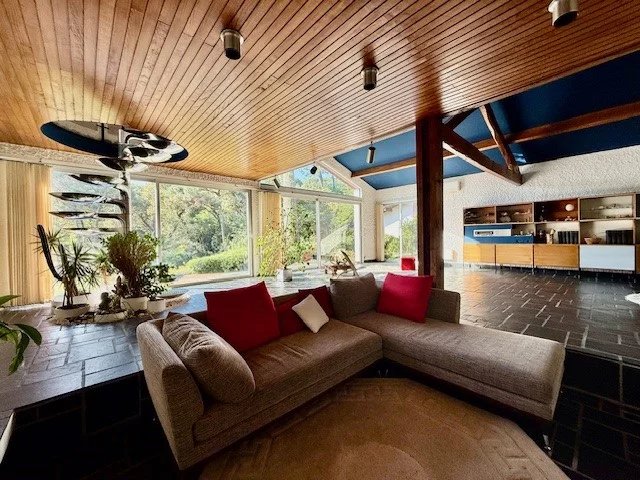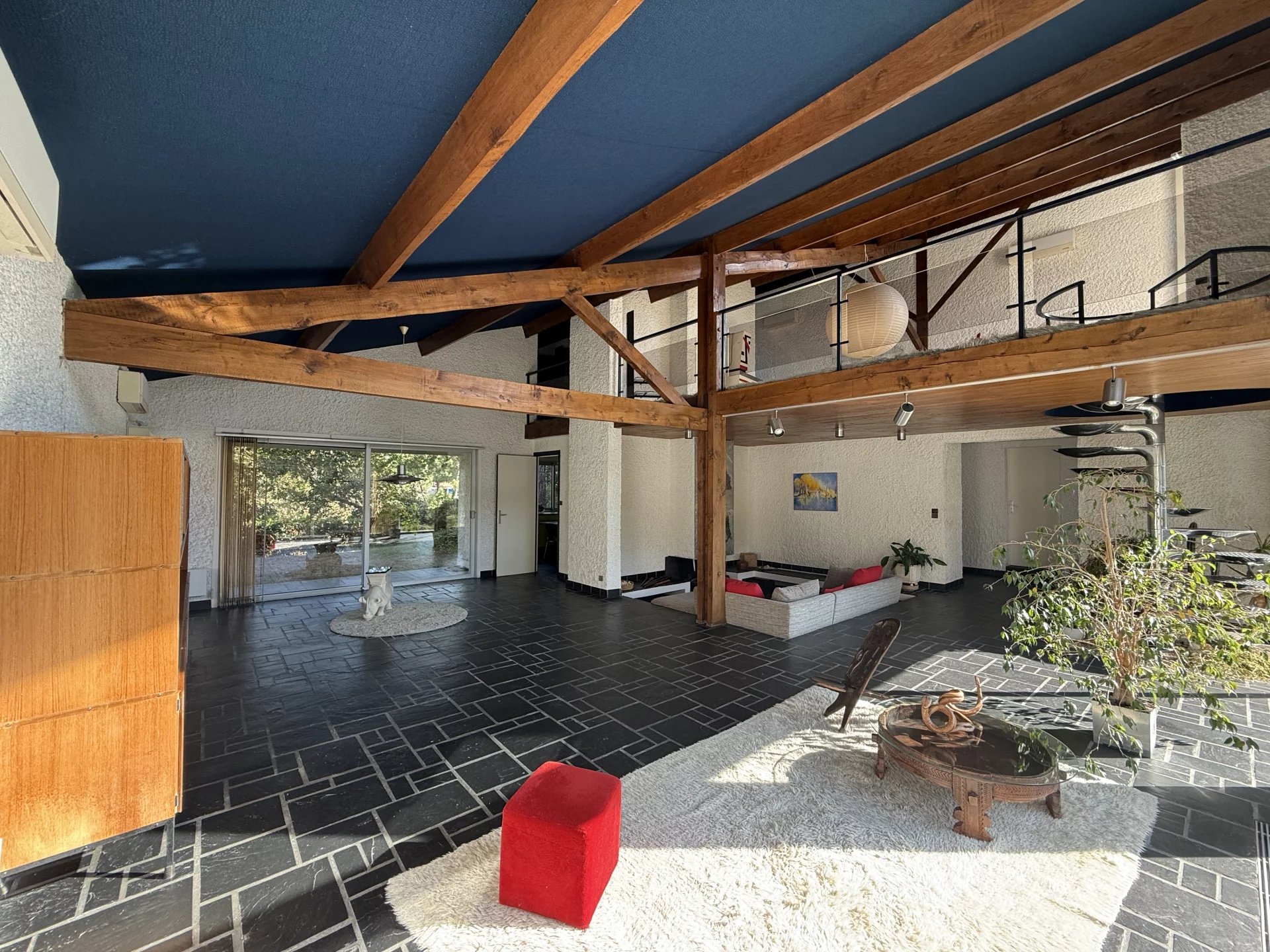 So Seventies ! Surplombant la cime des pins, une signature architecturale aux arêtes vives flanquée de volumes impressionnants baignés de lumière. C’est le parti pris de cette maison au design audacieux ancrée au sommet de l’historique quartier Pereire et dont les espaces intérieurs ont autant de souffle que la façade a de caractère. Plein sud, l’espace de réception de plus de 65m² est posé sur un opus d’ardoise au rythme des années 70. A une hauteur hors norme, la charpente traditionnelle vient souligner un volume atypique auquel s’accroche une mezzanine de près de 60m². Un escalier hélicoïdal de designer vient connecter les deux niveaux tel une liane de métal. La cuisine aux couleurs acidulées s’ouvre sur une terrasse arborée et un petit chemin de traverse qui permet d’accéder à la plage en quelques minutes à pied. Une suite avec salle d’eau privative, 2 chambres, une salle de bain et des toilettes invités complètent le rez-de-chaussée. La mezzanine de très grande hauteur pourrait accueillir une suite parentale ou conserver sa fonction actuelle de pièce de divertissements. Le sous-sol intègre un garage, une cave à vin et une réserve. Le temps s’est arrêté dans les années 70, cristallisant un style de vie rythmé par des volumes uniques et une partition des pièces très fonctionnelle. Pour autant, la conception de cette villa permettrait une réinterprétation moderne sans dénaturer le caractère affirmé de son architecture. Les informations sur les risques auxquels ce bien est exposé sont disponibles sur le site https://errial.georisques.gouv.fr/#/