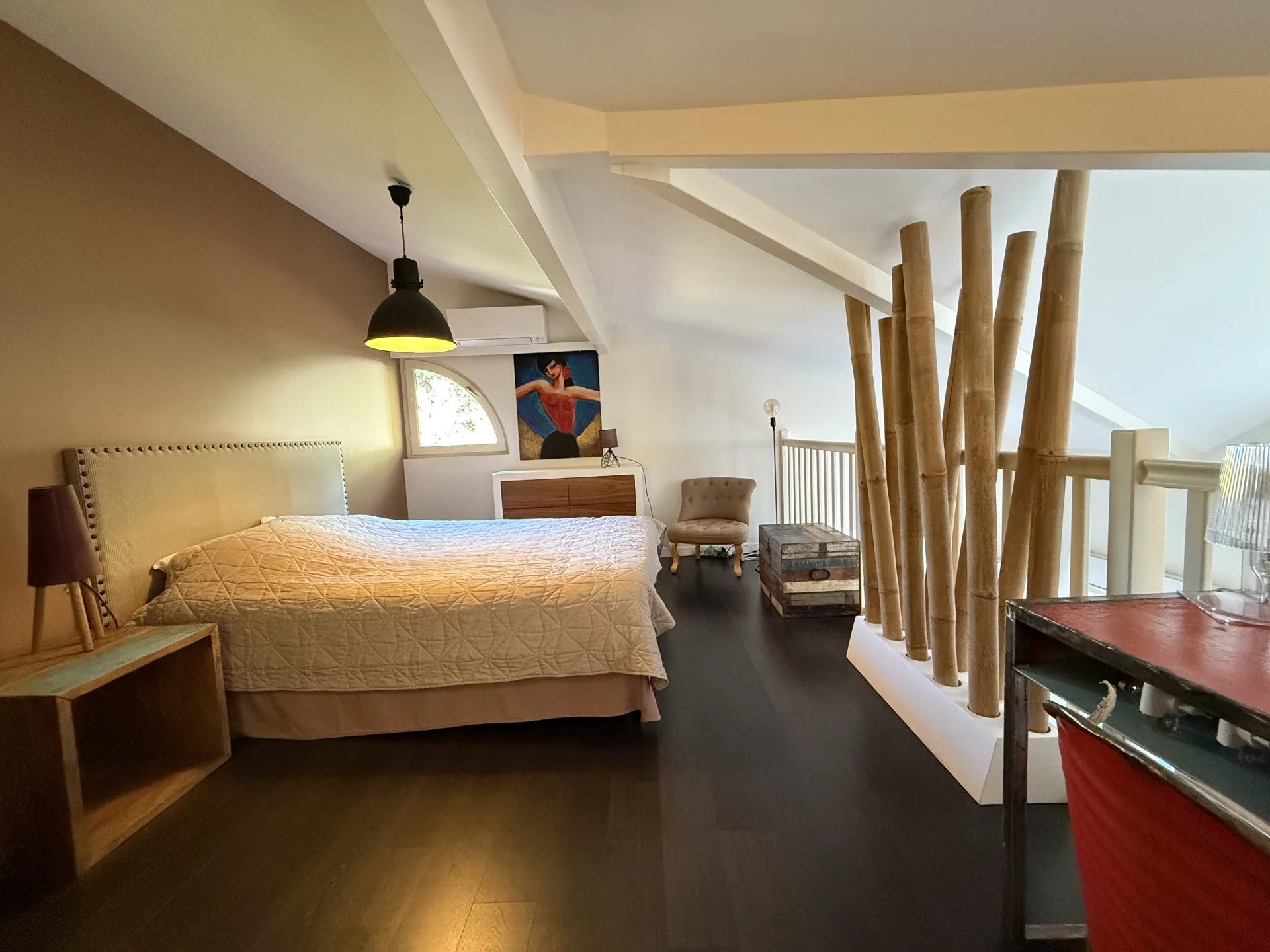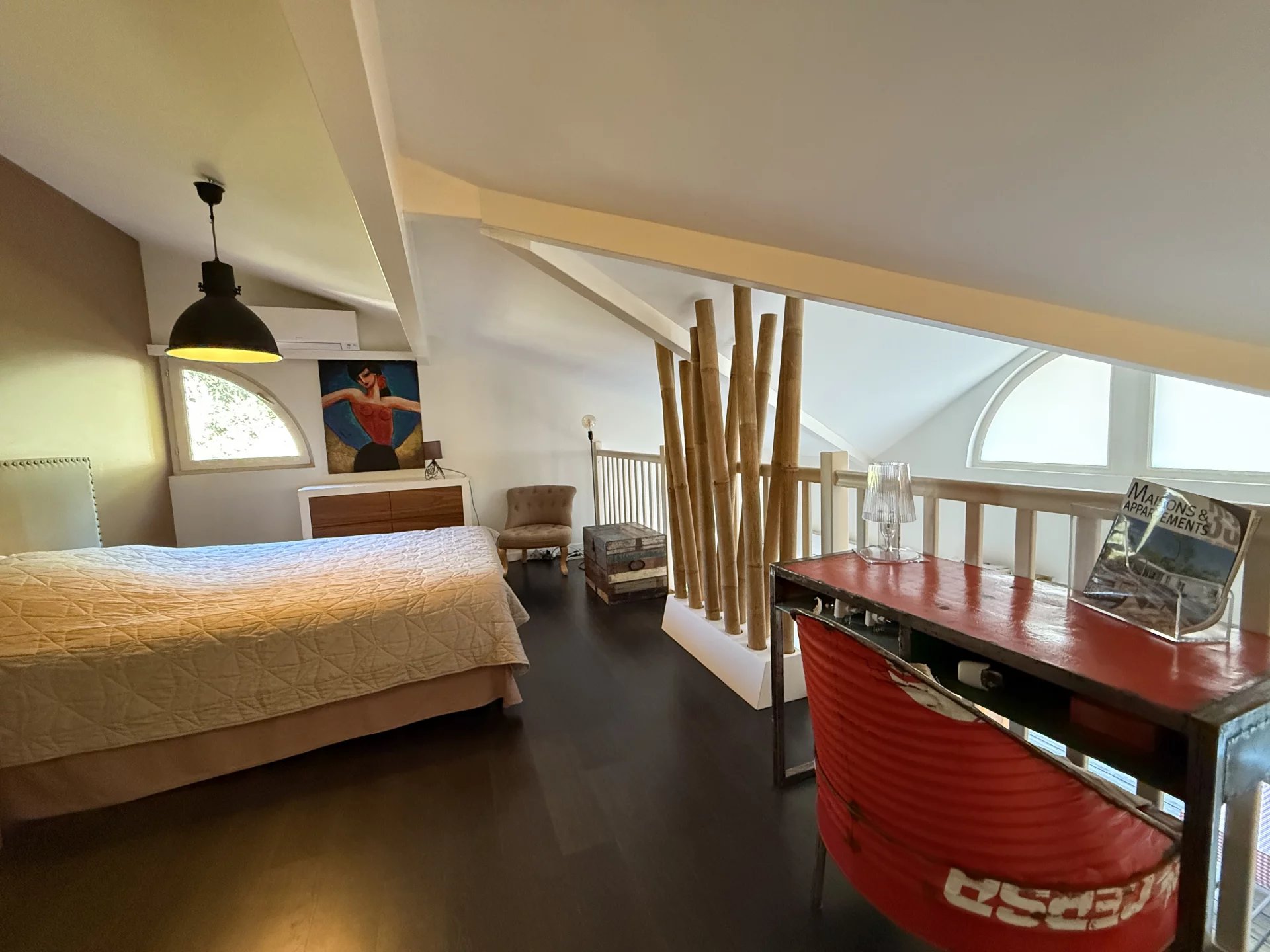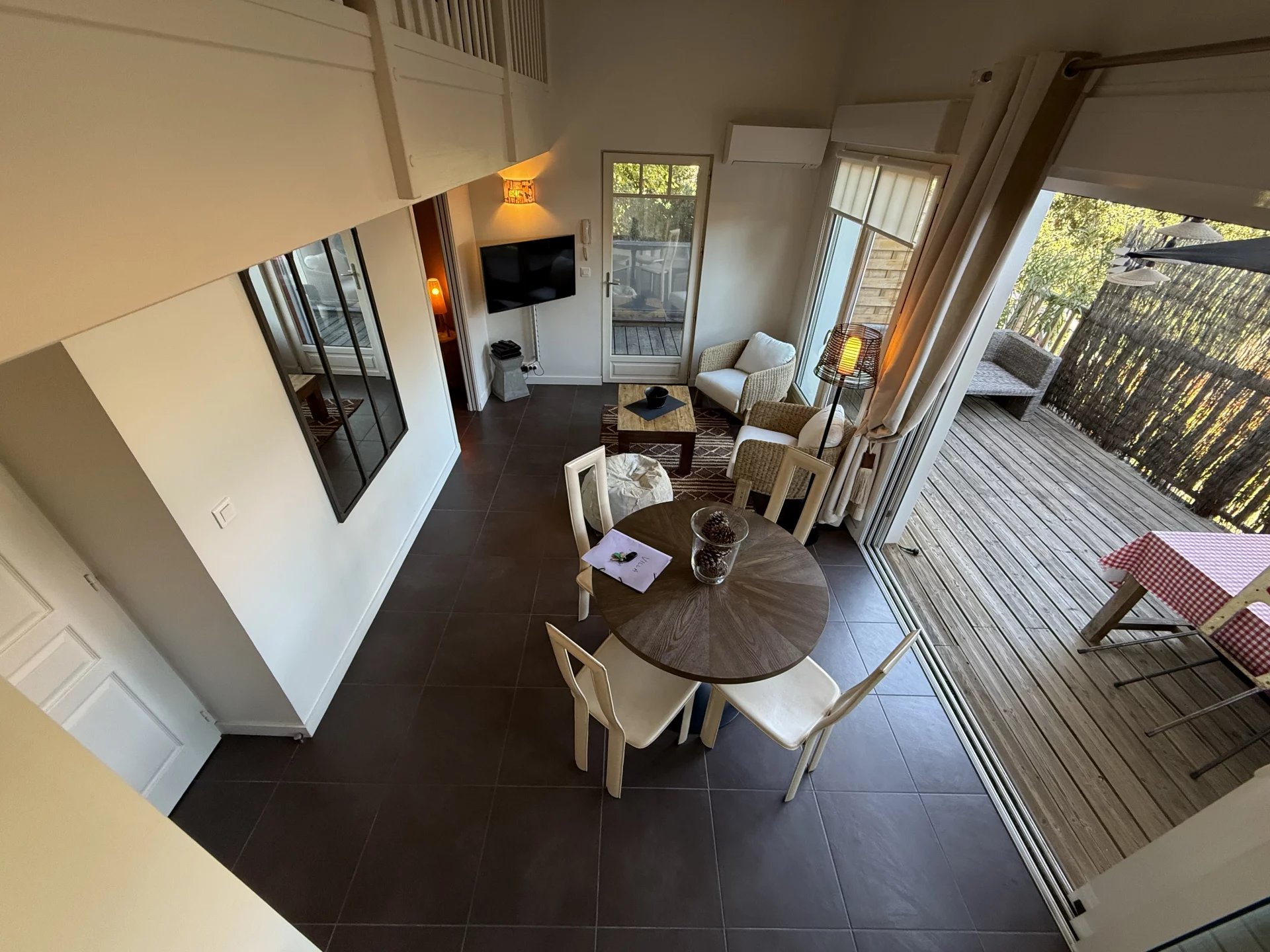 Situé en plein cœur du Moulleau et à seulement 2mn à pied de la plage, cet appartement de 50 m² vous séduira par ses volumes, sa grande terrasse extérieure de plus de 16 m² et la quiétude de sa situation. Le salon cathédral climatisé s’ouvre par deux grandes baies vitrées sur la terrasse orientée à l’Est, véritable pièce de vie supplémentaire. Ce niveau intègre une cuisine ouverte optimisée, des toilettes séparées et une chambre avec sa salle d’eau privative. La suite parentale nichée en mezzanine et à laquelle s’adosse une deuxième salle d’eau, vient surplomber l’espace du salon et profite, elle aussi, d’une climatisation. Une place de parking sécurisée et un cellier viennent compléter ce bien parfaitement entretenu et à l’emplacement rare. Les informations sur les risques auxquels ce bien est exposé sont disponibles sur le site https://errial.georisques.gouv.fr/#/