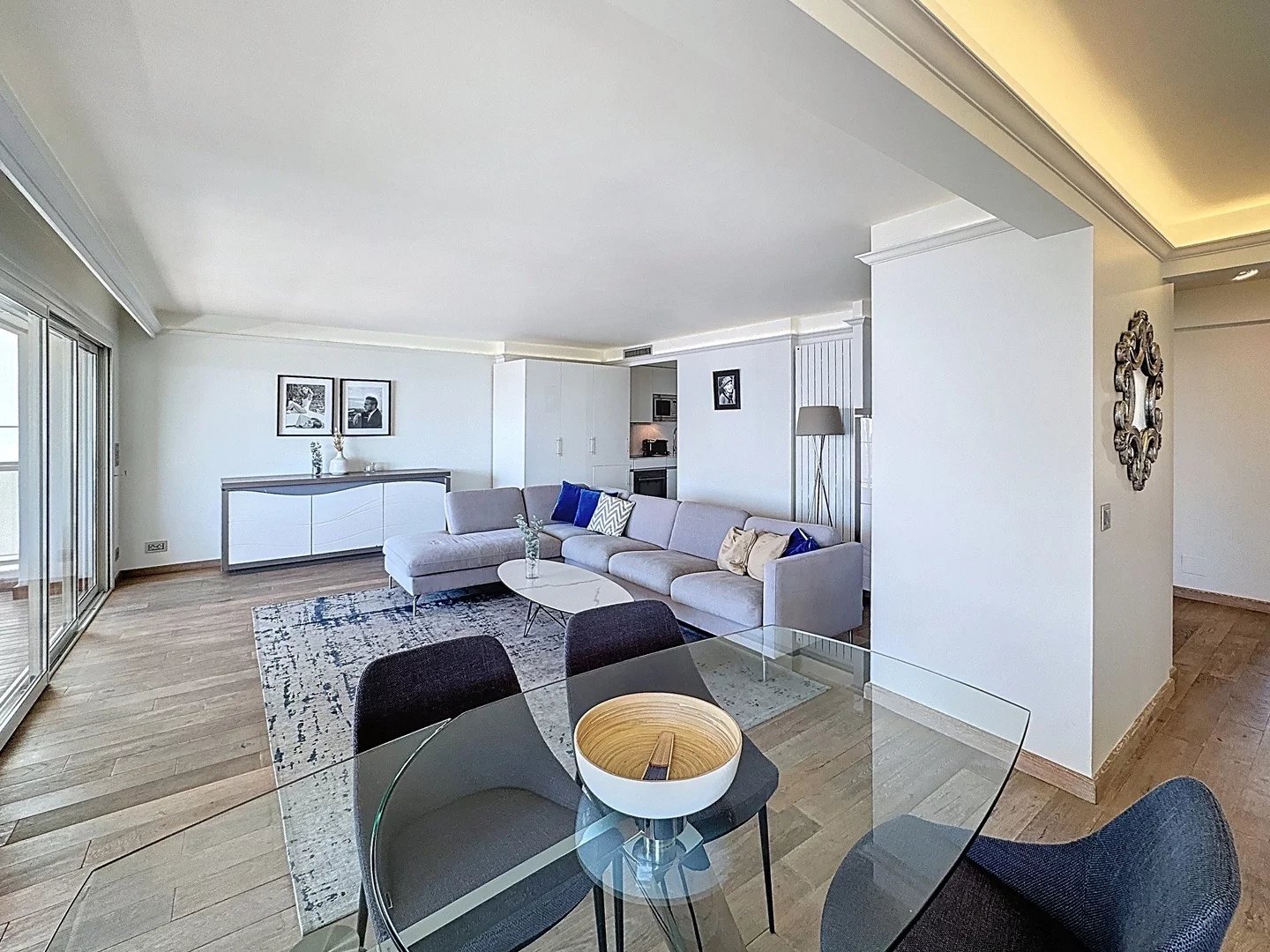 L’appartement s’ouvre sur une entrée majestueuse, menant à un vaste séjour avec salle à manger et cuisine ouverte — un superbe espace de réception de 42 m², baigné de lumière naturelle et offrant une vue mer imprenable. De grandes baies vitrées prolongent l’espace vers une terrasse de 11 m² face à la mer, idéale pour recevoir ou admirer les vues emblématiques de Cannes.
