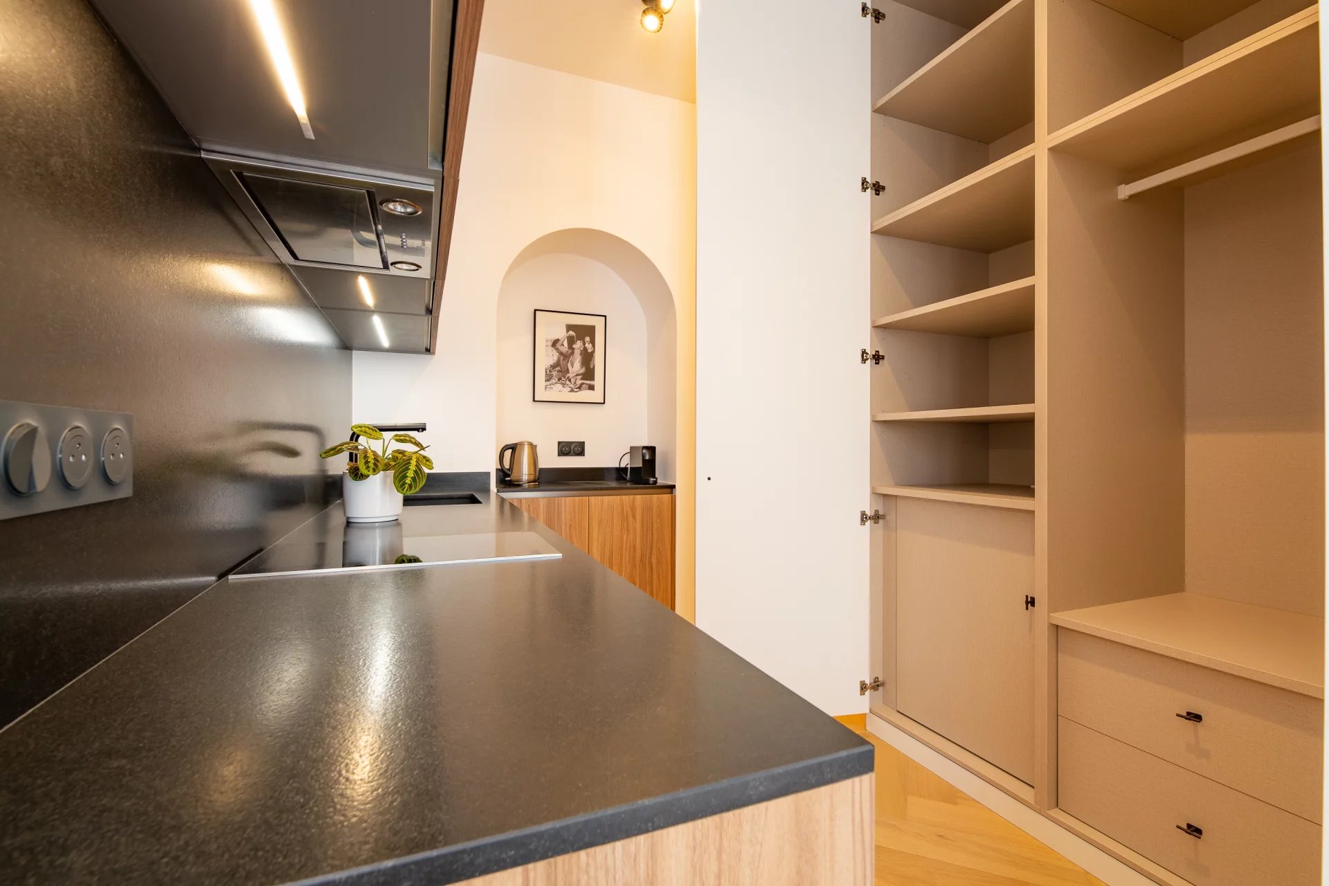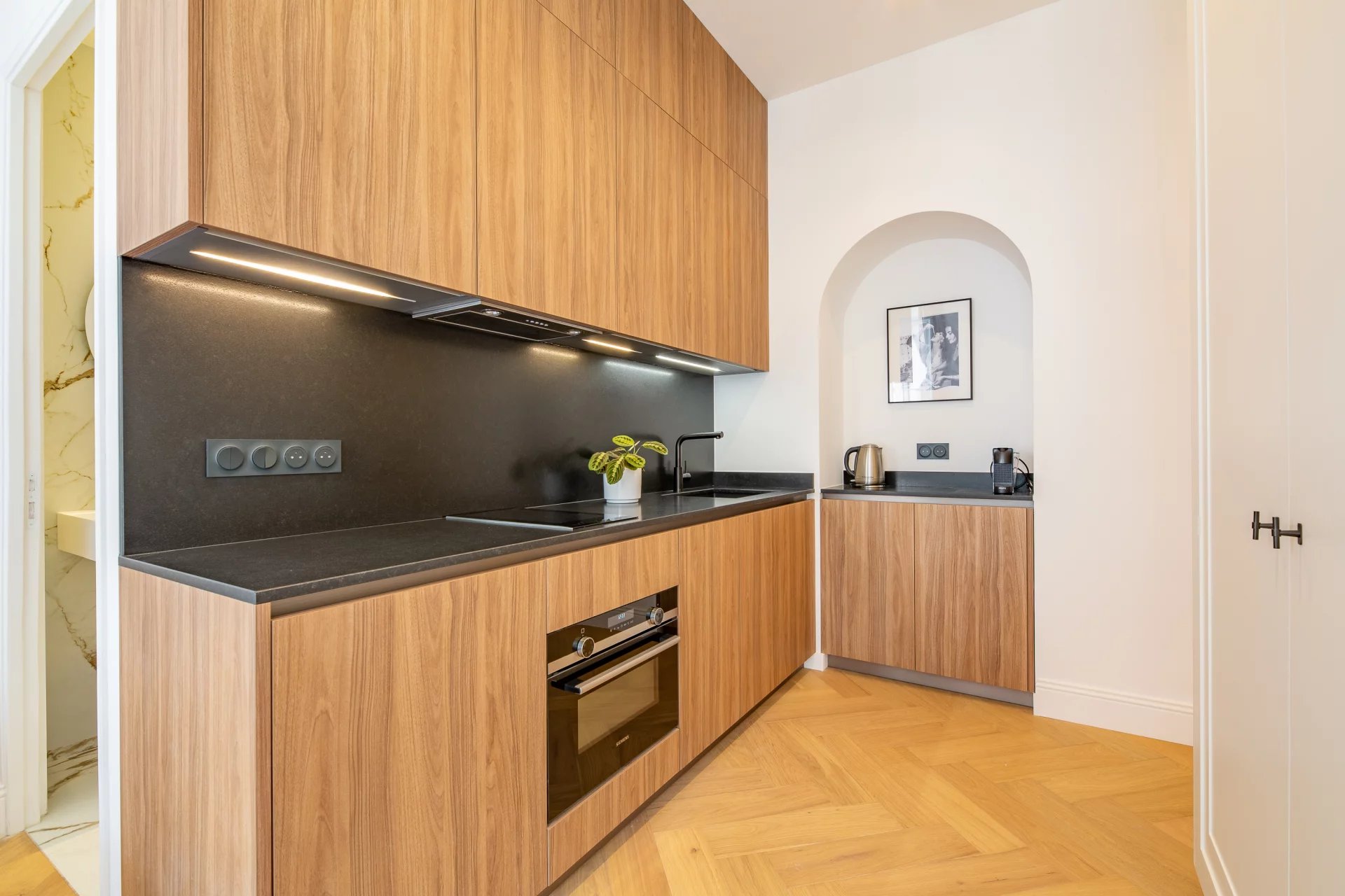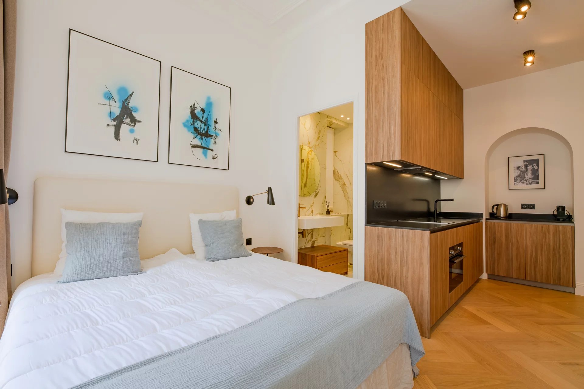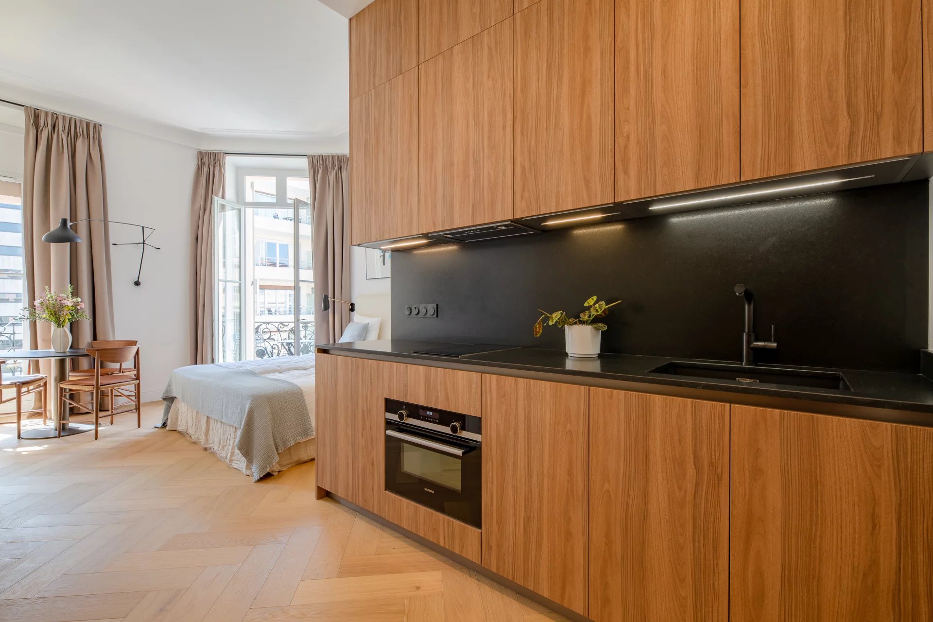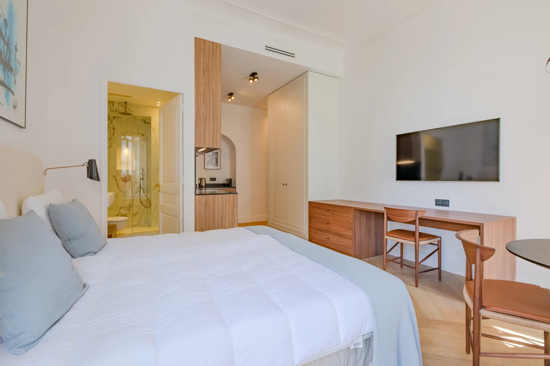 Entièrement rénové en 2024 par le très réputé M-P Design, ce studio est aménagé dans un style scandinave moderne. Lumineux, aéré et d’une élégance exceptionnelle, il présente des qualités rares pour un studio de cette taille.