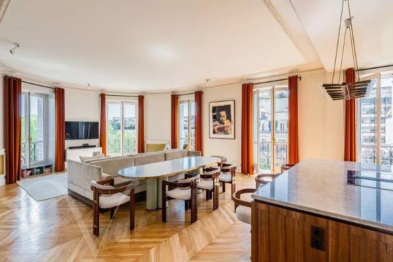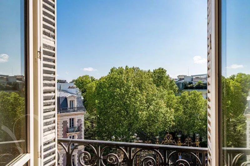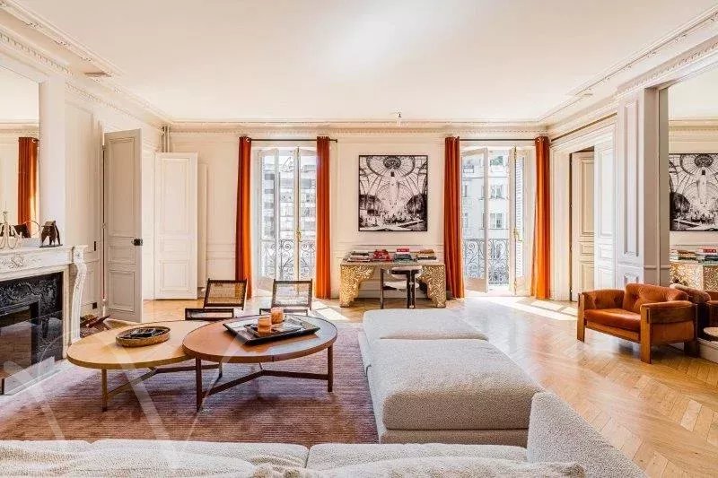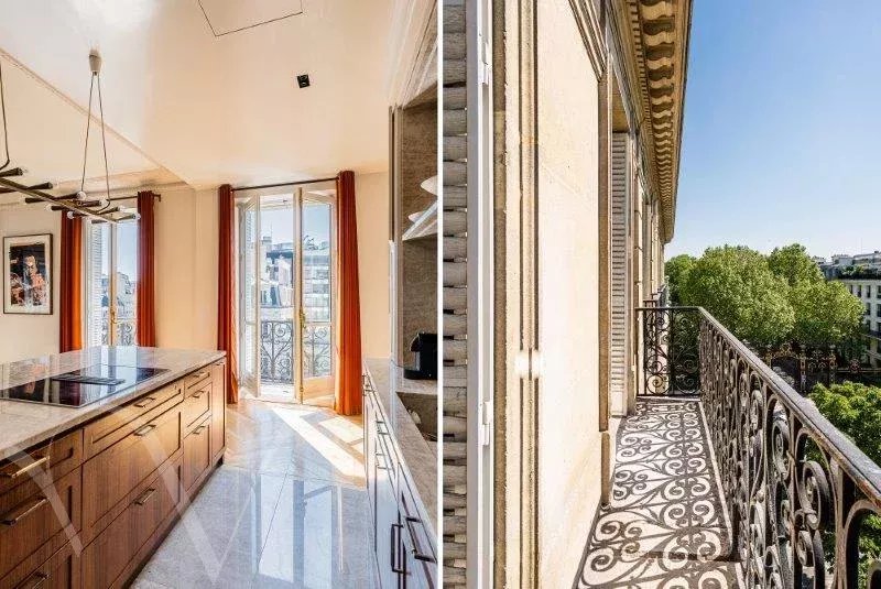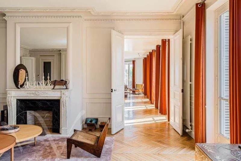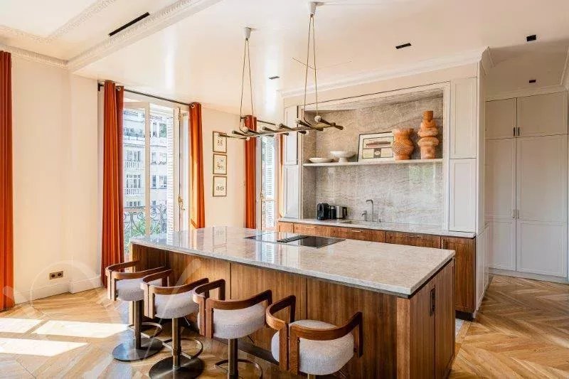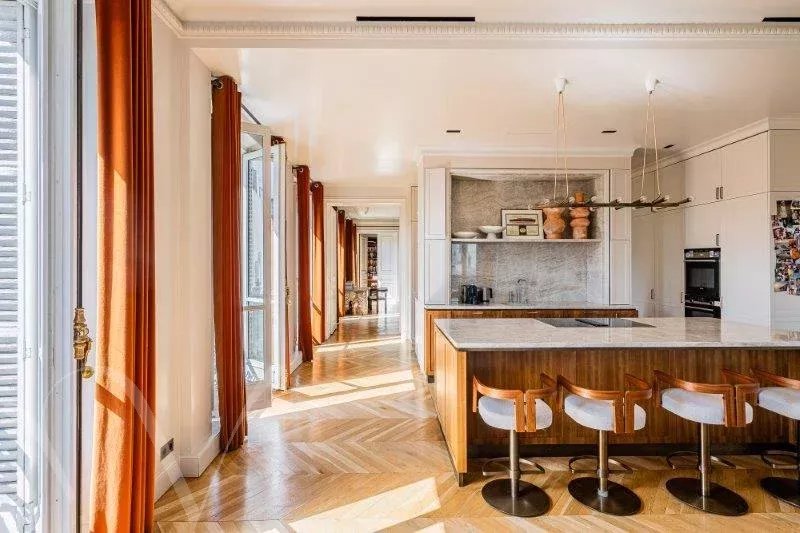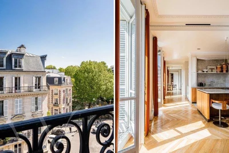 Au 4e étage d'un bel immeuble en pierre de taille, cet appartement de 385 m² entièrement rénové dans un style contemporain se compose d'un hall d'entrée, d'une réception, d'une magnifique cuisine dinatoire de 72 m² ouvrant sur le séjour avec cheminée, d'une grande suite parentale avec dressing et salle de bains, de quatre chambres avec salles de bains, d'une salle de jeux et d'un bureau. État exceptionnel. Très jolies vues sur les grilles du Parc Monceau et l'avenue Hoche vers l'Étoile. Climatisé