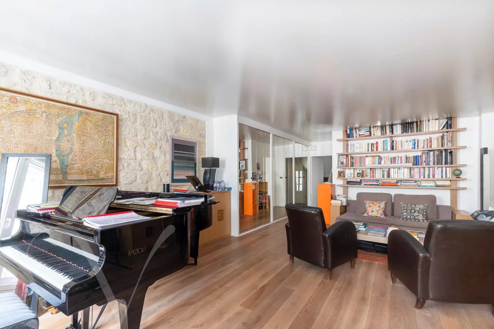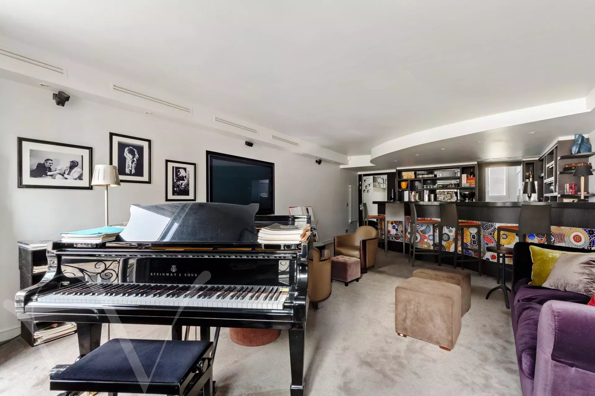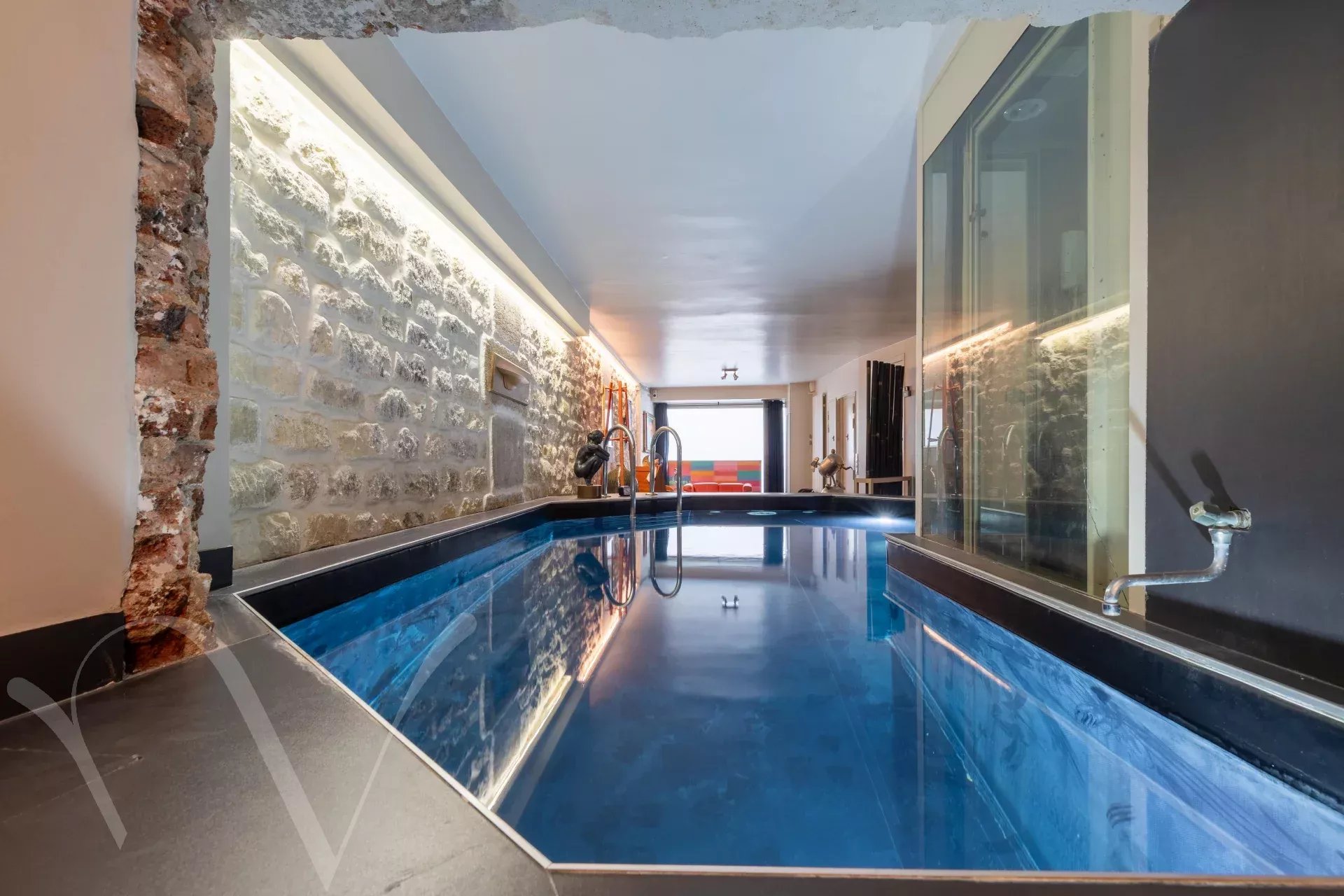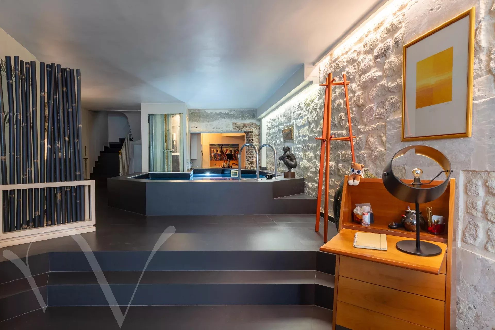 A quelques pas du jardin du Luxembourg, cette maison de ville de 427 m² au sol, et 324 m² habitables, est édifiée sur 5 niveaux desservis par ascenseur, ainsi que 2 sous-sols aménagés. Chaque étage mesure 60 m² environ. Au rez-de-chaussée, l’entrée de la maison dessert la piscine de nage à contre-courant ainsi que l’ascenseur et l’escalier qui dessert tous les niveaux. Premier, deuxième et troisième étages desservent chacun une grande chambre ou bureau, avec salle de bains et toilettes. Au quatrième étage, le salon de musique est aménagé à la manière d'un "piano bar". Au cinquième étage se situe une superbe pièce de réception "cathédrale" organisée en salon avec cuisine ouverte très conviviale. En sous-sol, une buanderie et une grande cave à vins.