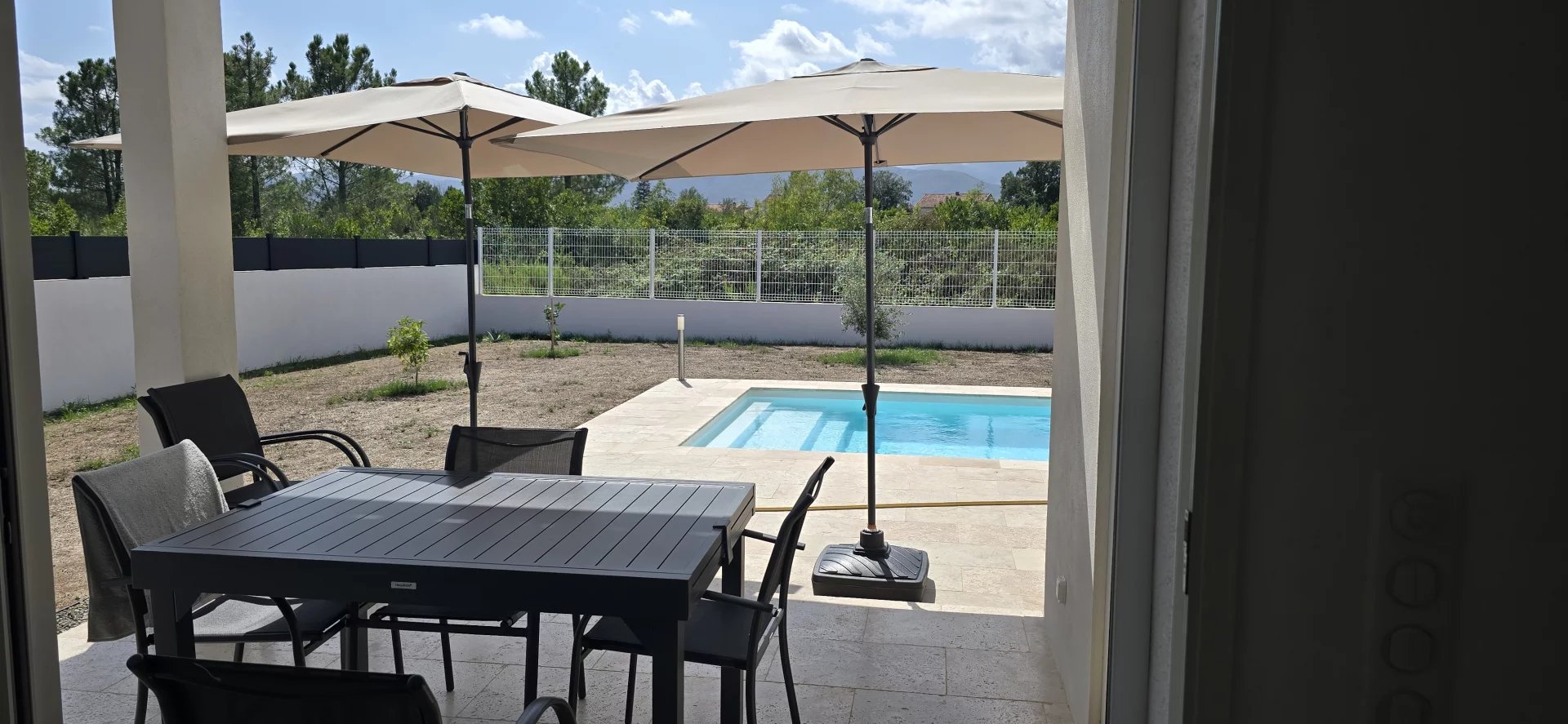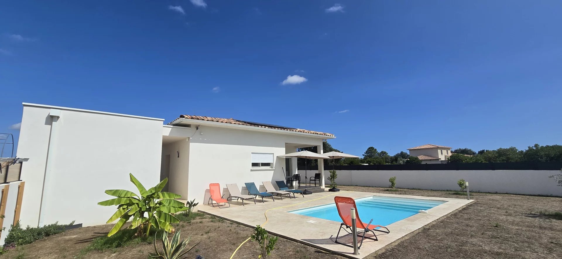 Une exclusivité de vente Panoramer Très belle villa type 4 avec Piscine et Garage. La maison se compose d'un hall entrée desservant une cuisine équipée et sa sortie terrasse couverte, trois chambre dont une avec une salle de douche, un wc, un séjour, deux chambres, une salle de douche et un wc. Un terrain clôt et arboré de 730 m². Belle opportunité d'achat, villa soignée.