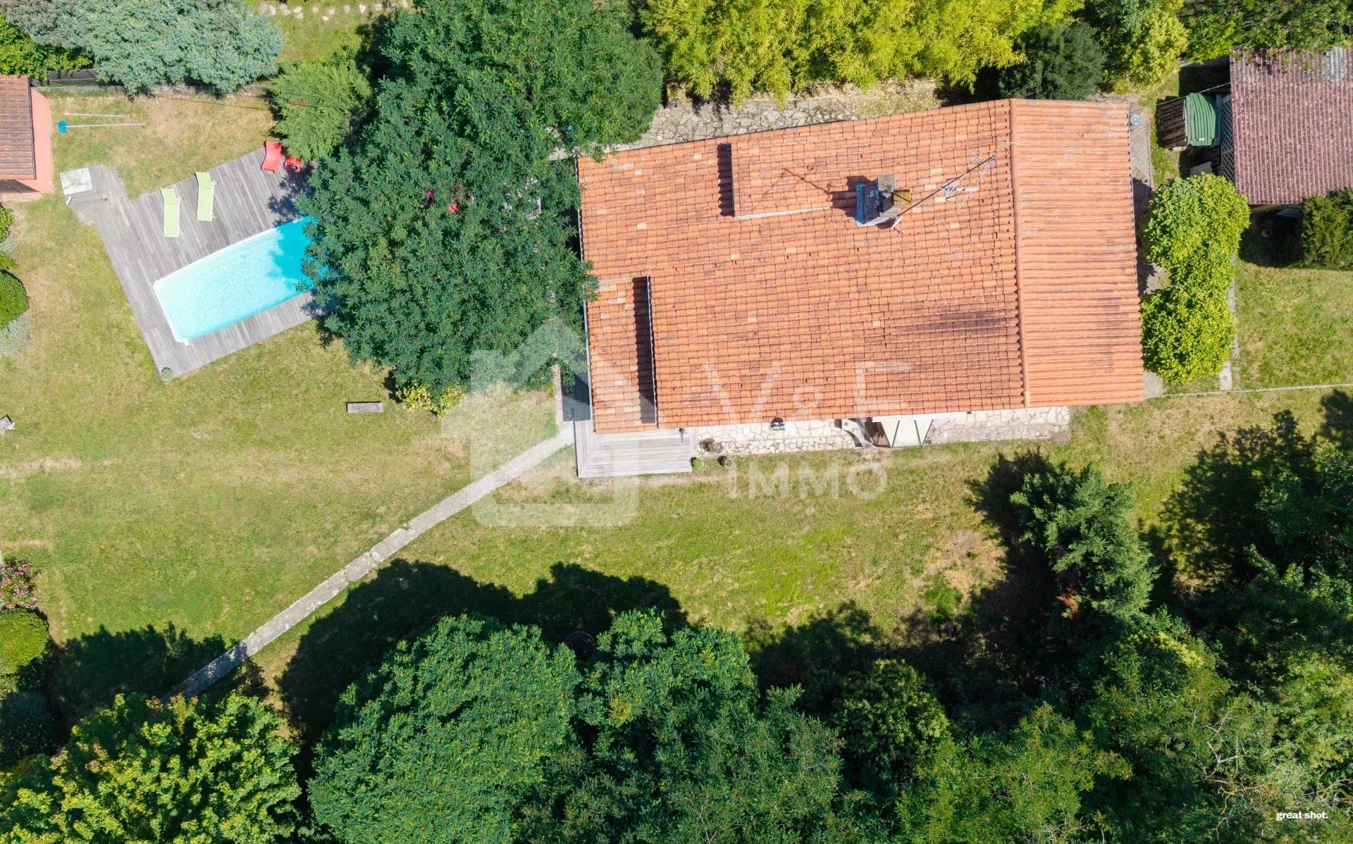 Cette maison possède aussi de nombreux rangements (salon, chambres et dégagements), pour les amateurs, une cave en ssol complètera les nombreux atouts de cette belle demeure. Le jardin de 1500m² clos et arboré invitera au repos côté piscine et pool-house et aux bons repas partagés sous le chêne centenaire côté terrasse en bois.