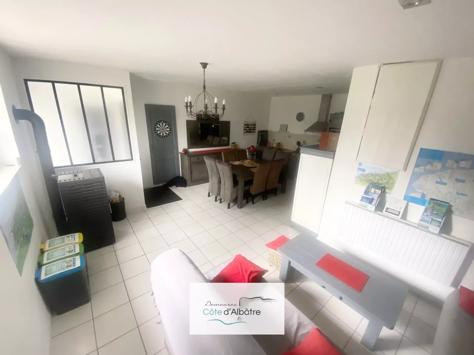 - Pièce de vie lumineuse de 60 m² avec cuisine équipée, salle à manger et salon