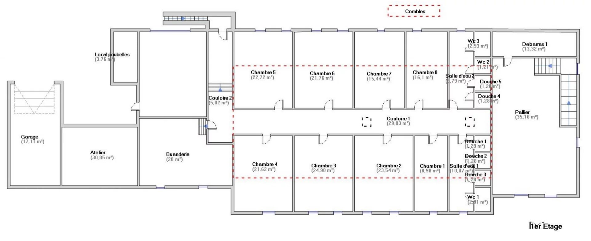 A l’étage, un grand palier vous accueille et mène à 8 grandes chambres, deux pôles sanitaires ainsi qu’à une buanderie.