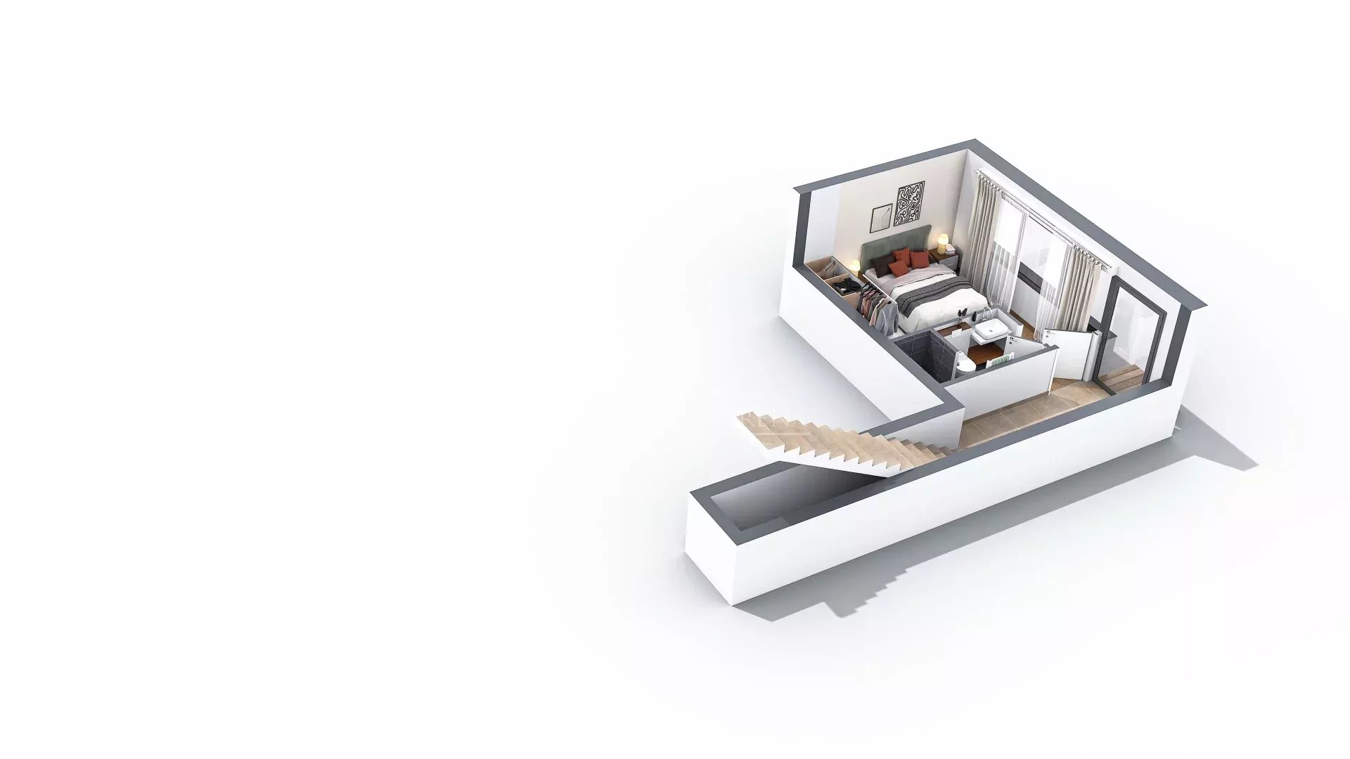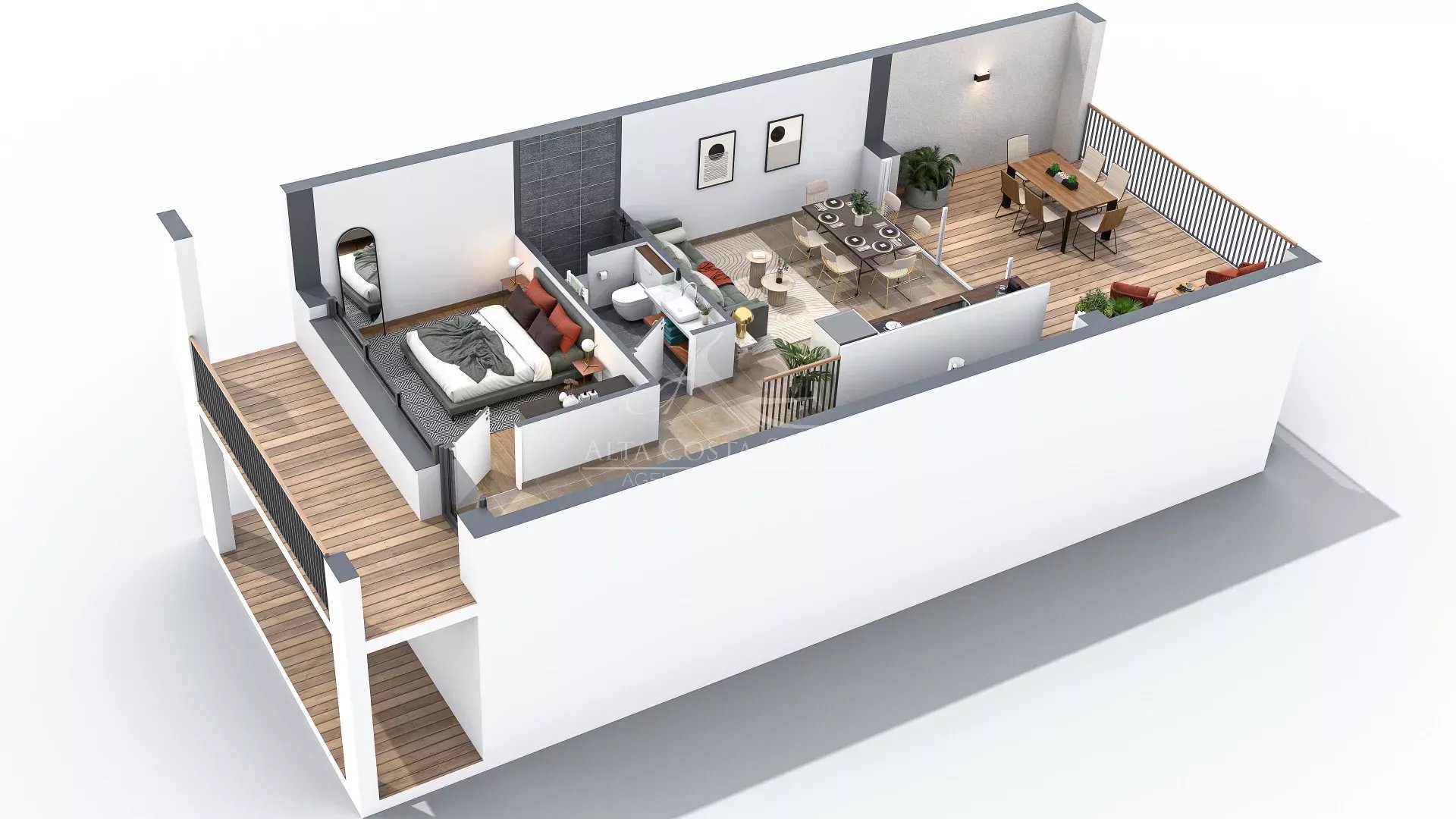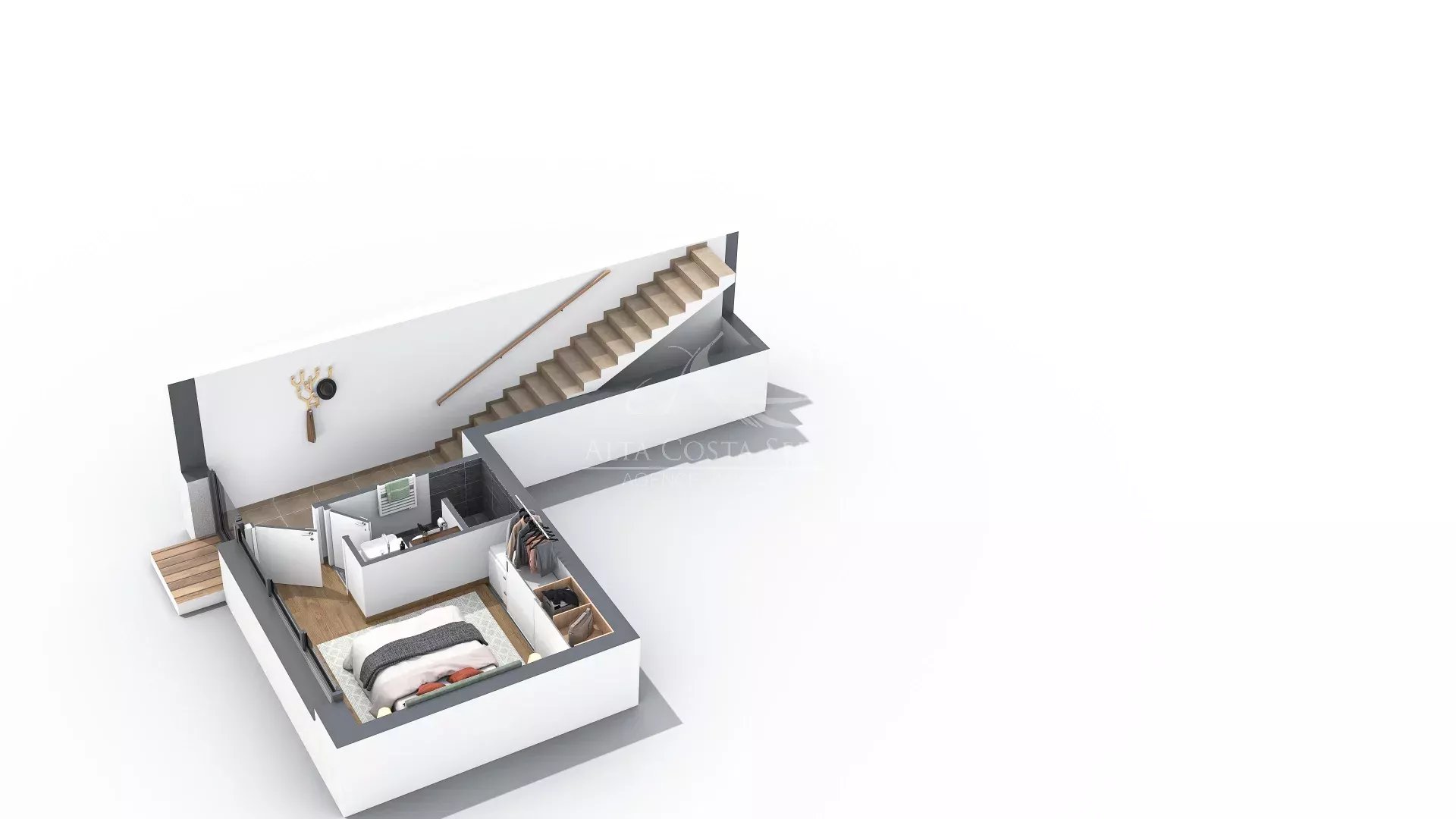 Au 1er étage, d'une chambre, d'une salle d'eau avec WC et d'un séjour ouvrant sur une terrasse de 21m² exposée EST.