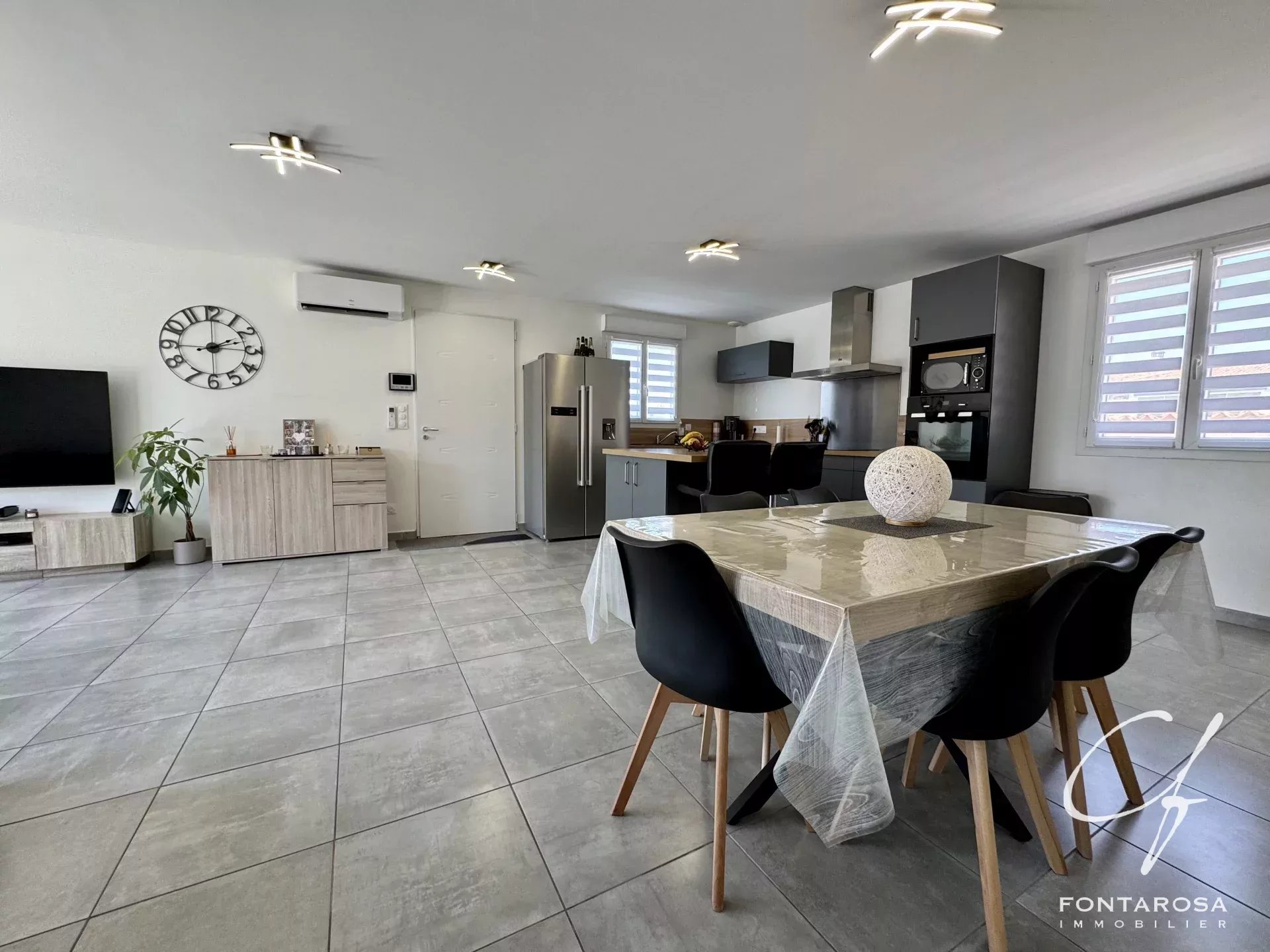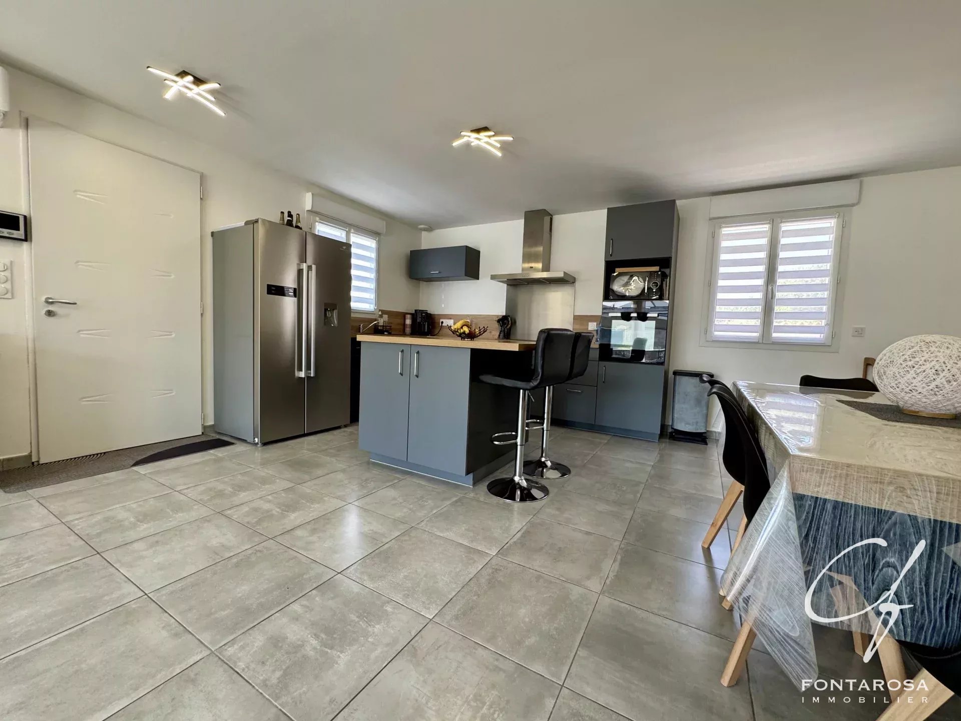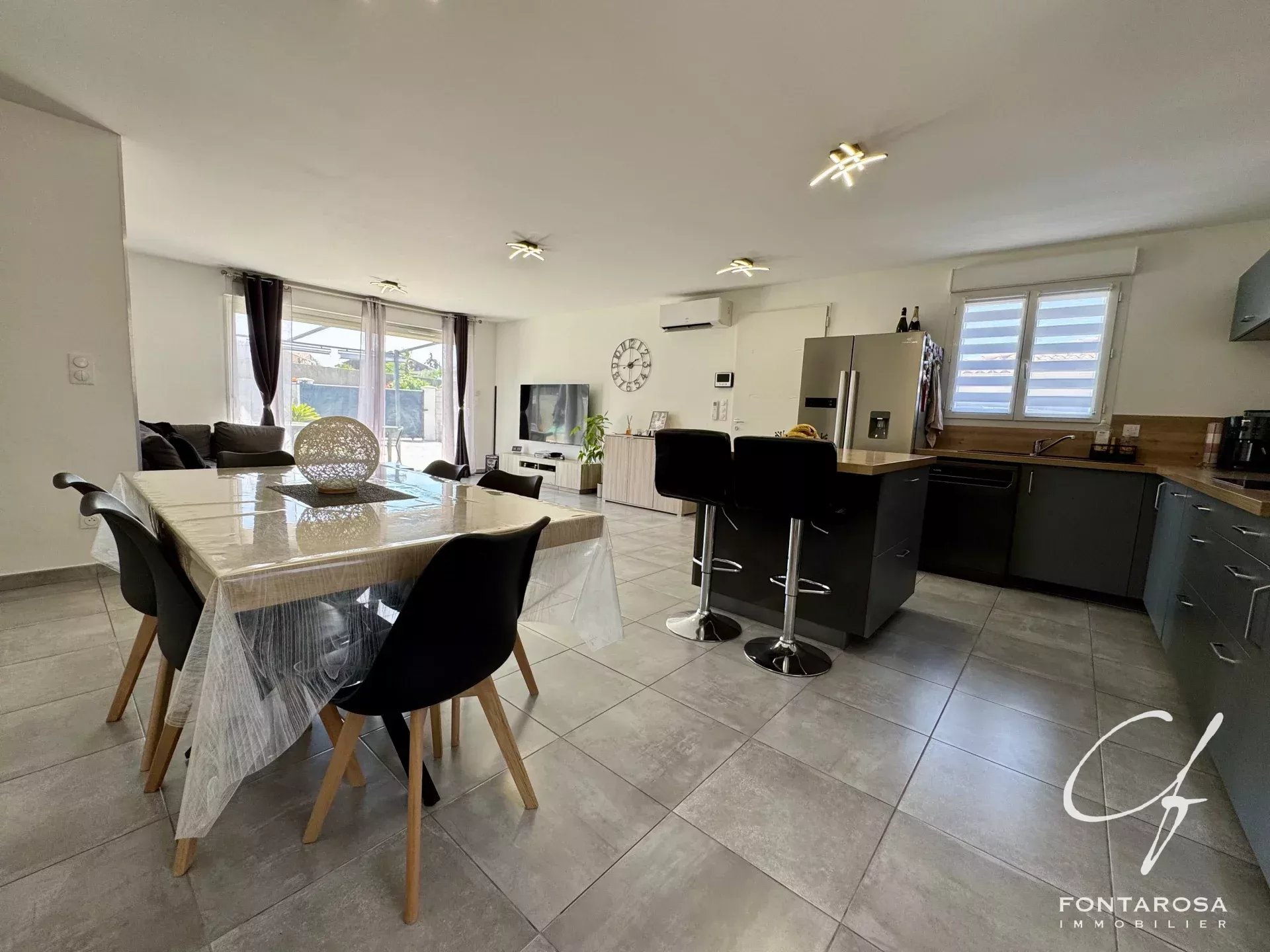 La maison s’organise autour d’une belle pièce de vie de 43 m², lumineuse grâce à son exposition plein sud, avec une cuisine ouverte entièrement équipée.