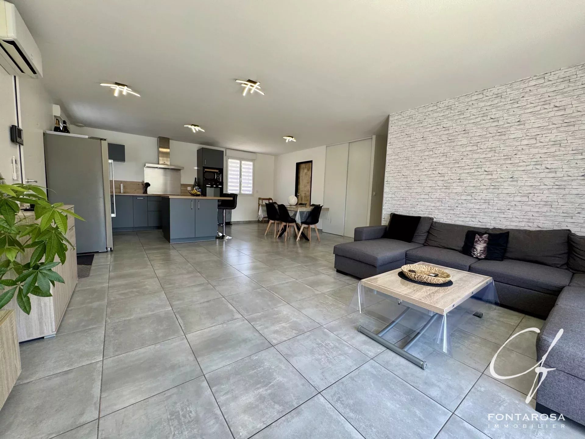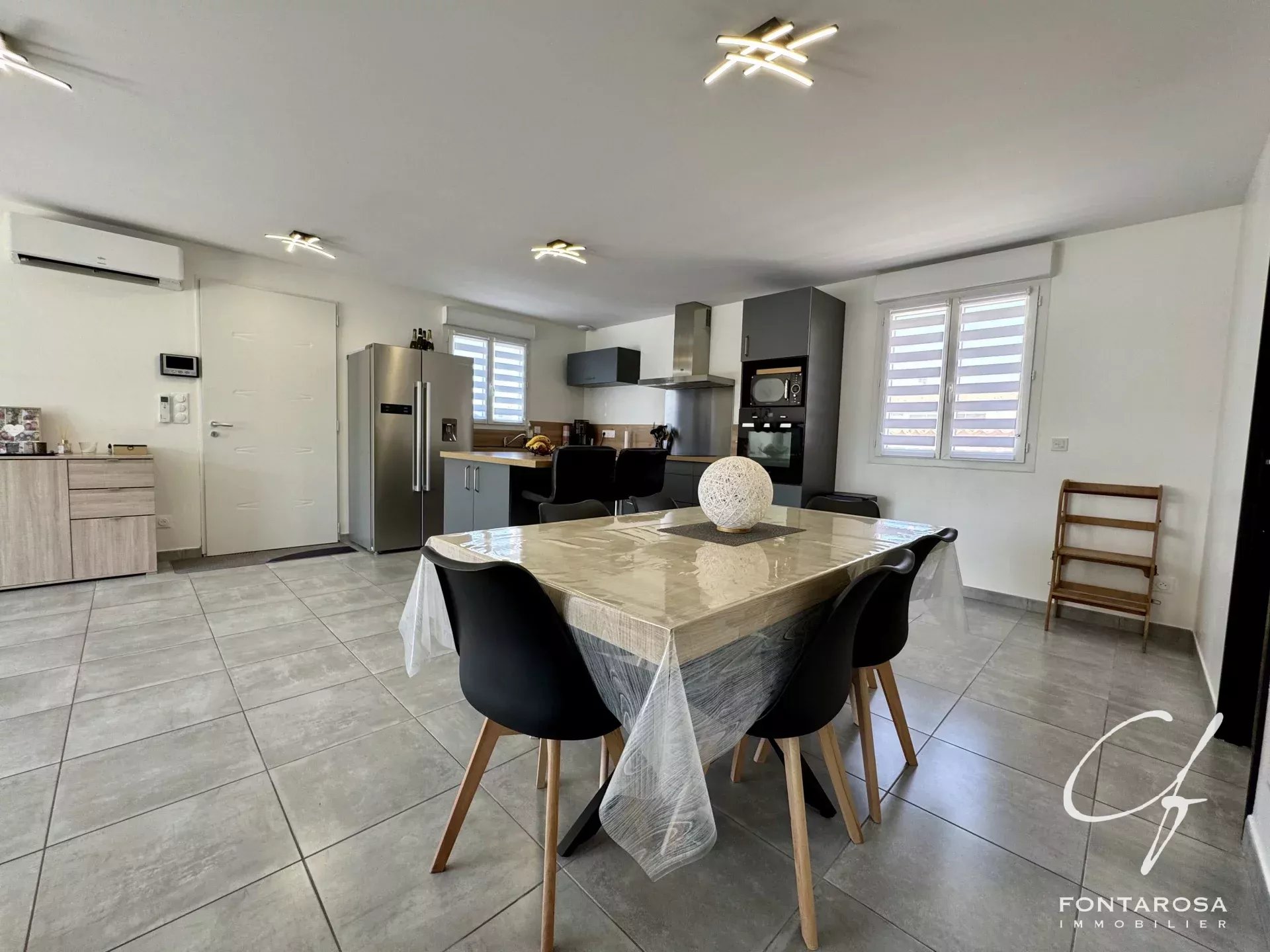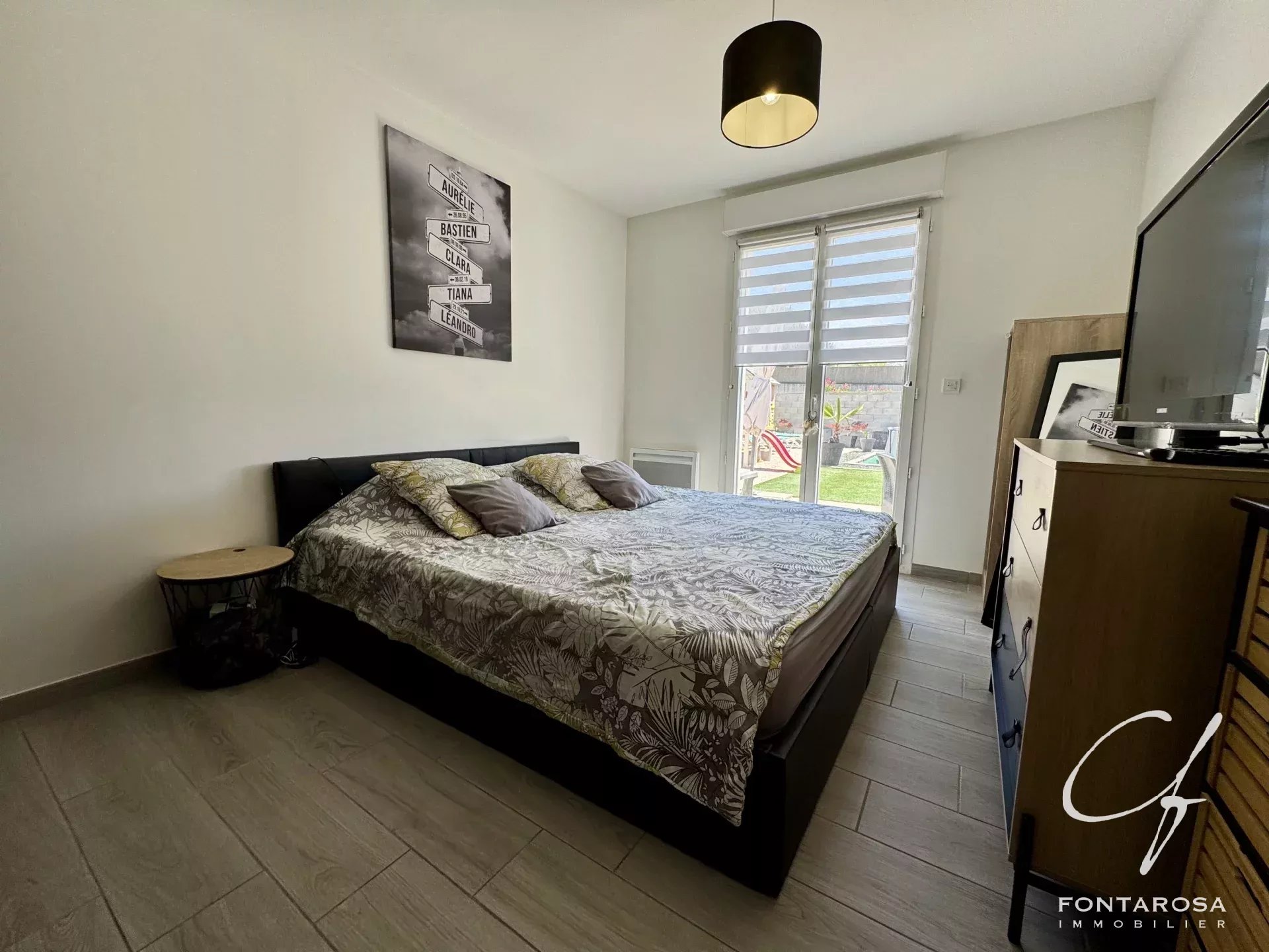 La maison s’organise autour d’une belle pièce de vie de 43 m², lumineuse grâce à son exposition plein sud, avec une cuisine ouverte entièrement équipée.