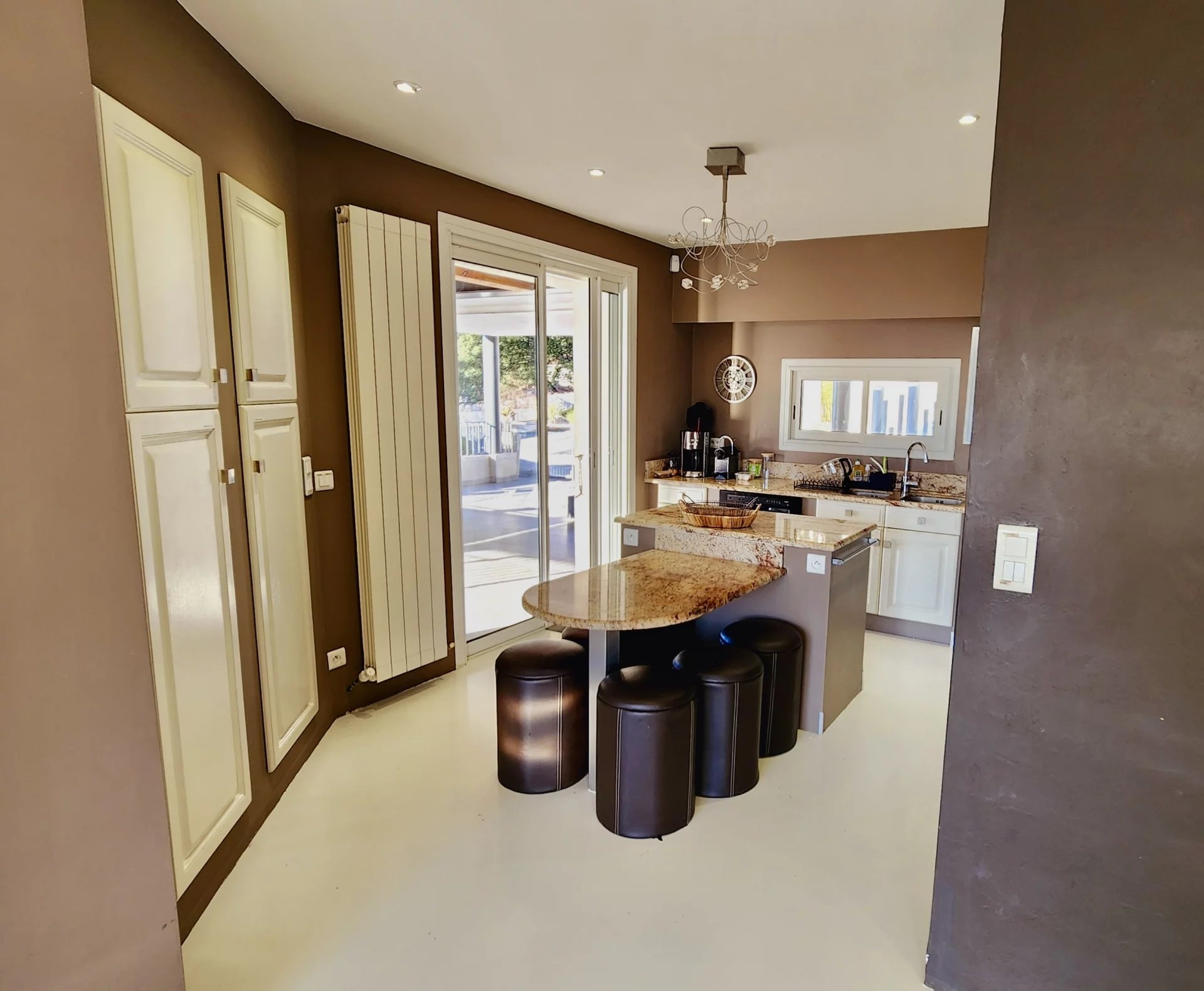 Un vaste séjour lumineux ouvert sur une terrasse ensoleillée, menant à la piscine de 11x5 parfaitement sécurisée et chauffée, entourée d'une belle plage en bois et avec une cuisine d'été.