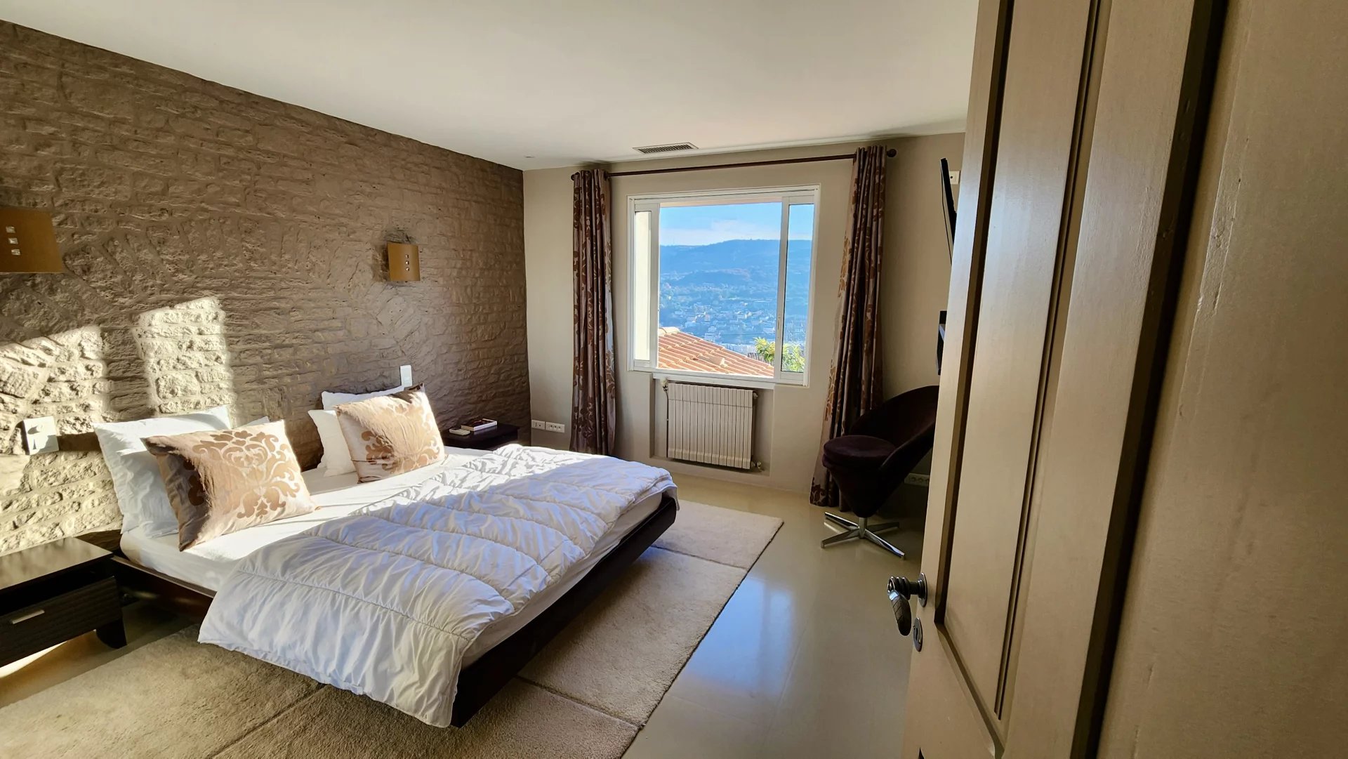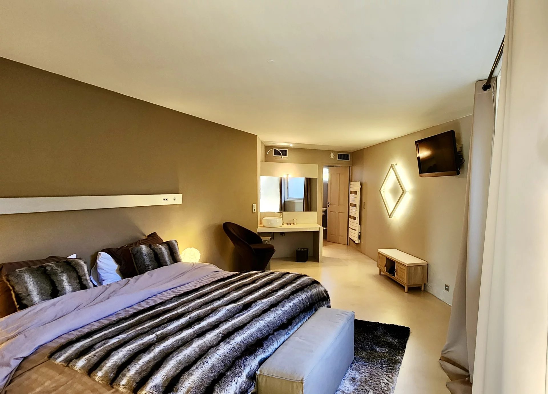 Une suite parentale élégante avec dressing et salle d’eau moderne, dotée d’une grande douche à l’italienne et d’éclairages intimistes.