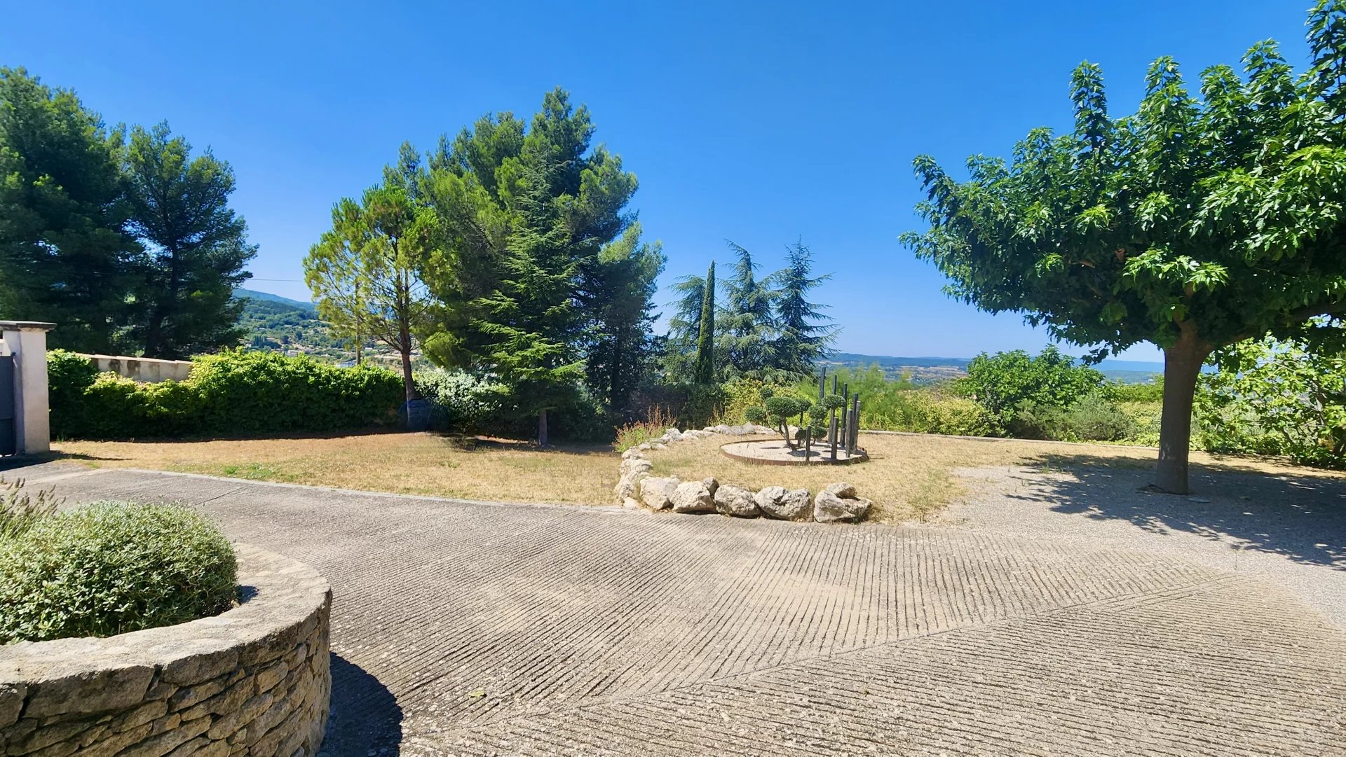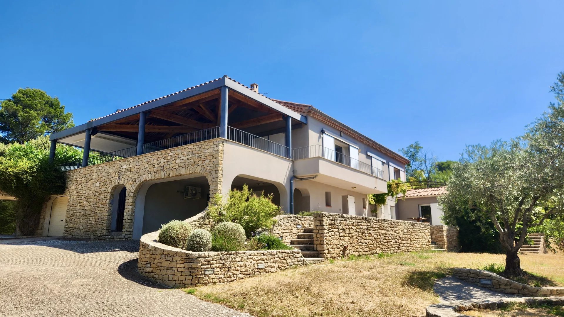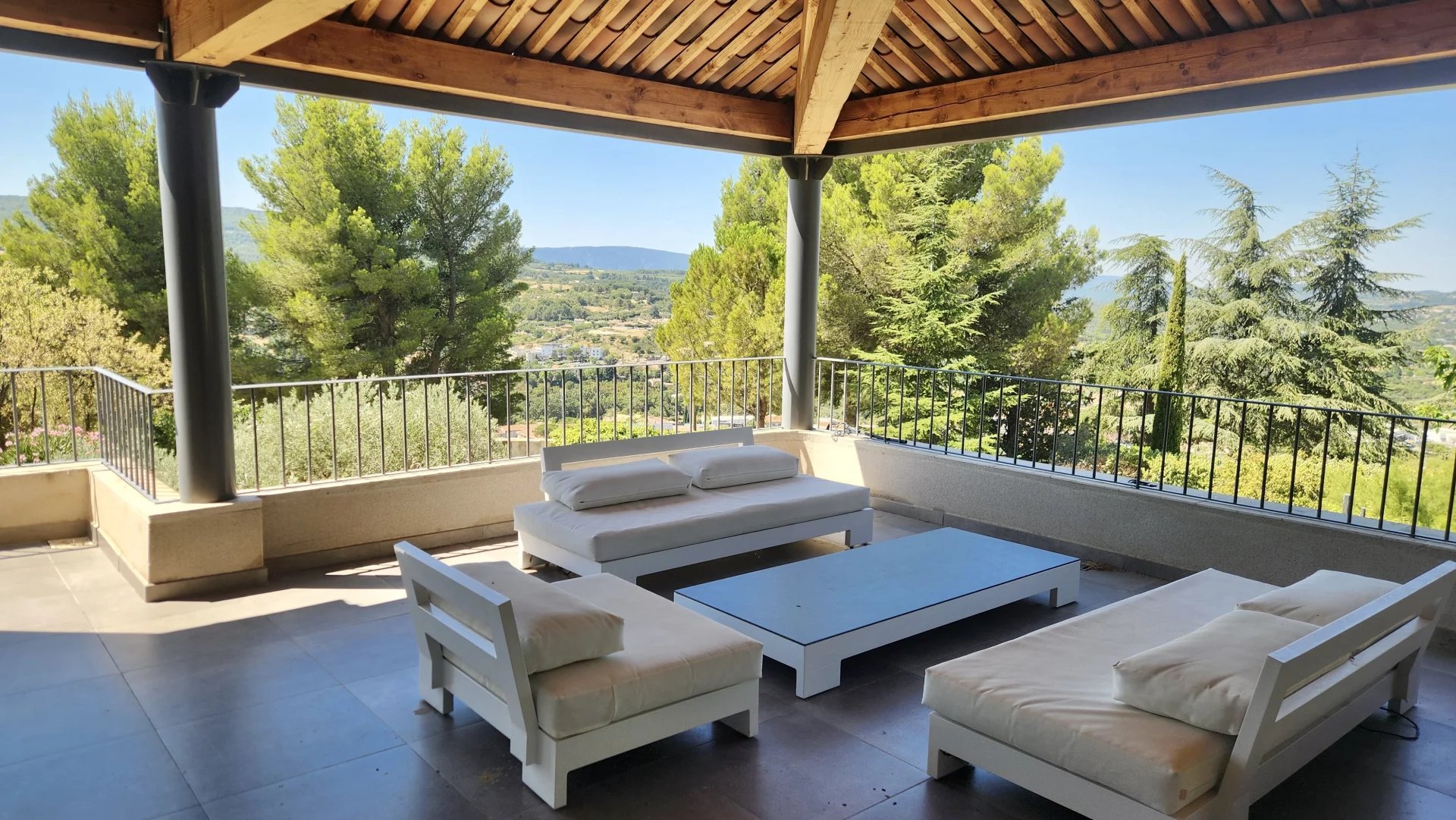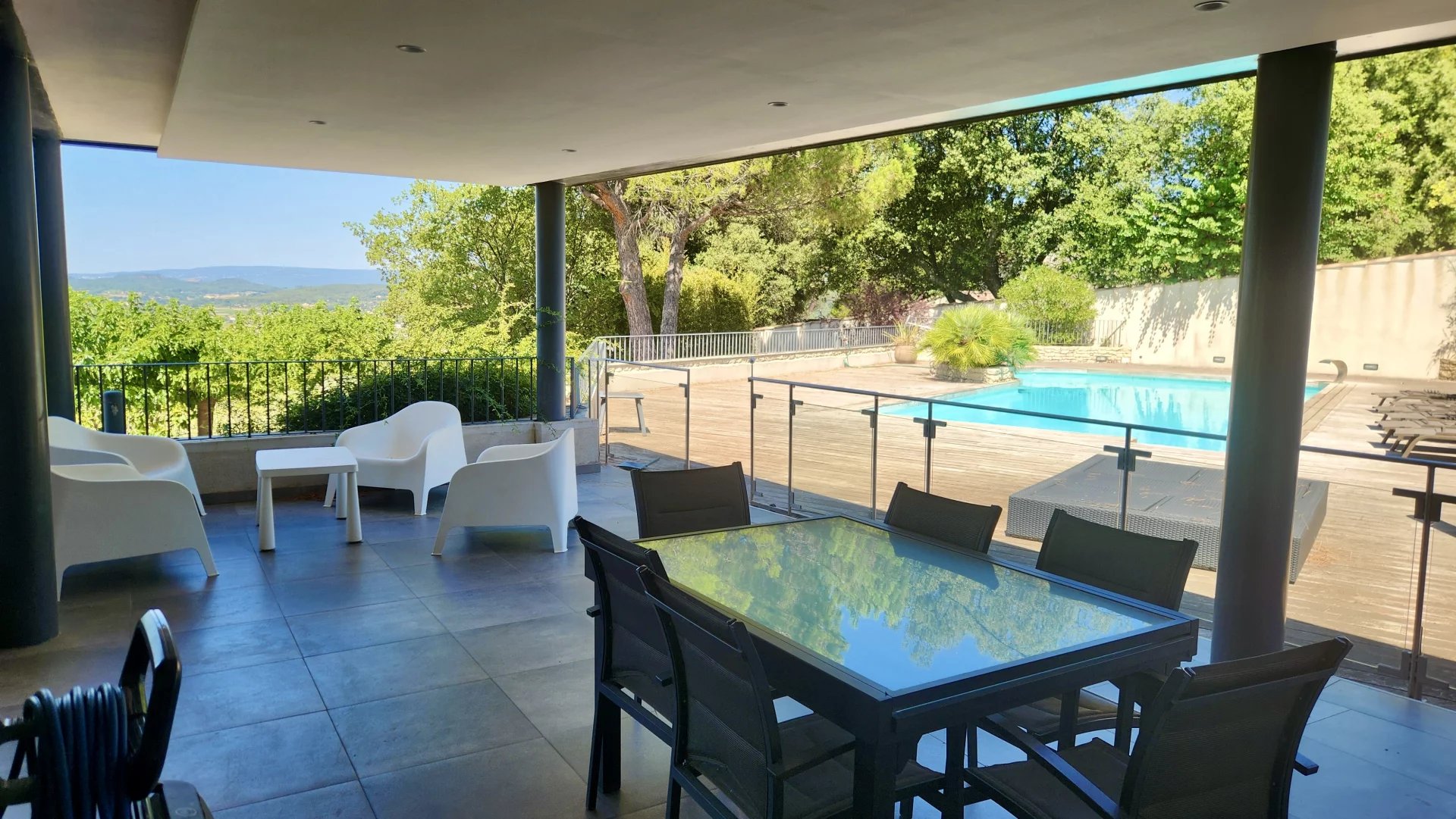 Nichée à flanc de colline, à l’abri des regards derrière de hauts murs et une végétation luxuriante, cette magnifique propriété contemporaine vous offre un havre de paix avec une vue dégagée imprenable sur les paysages du Luberon.