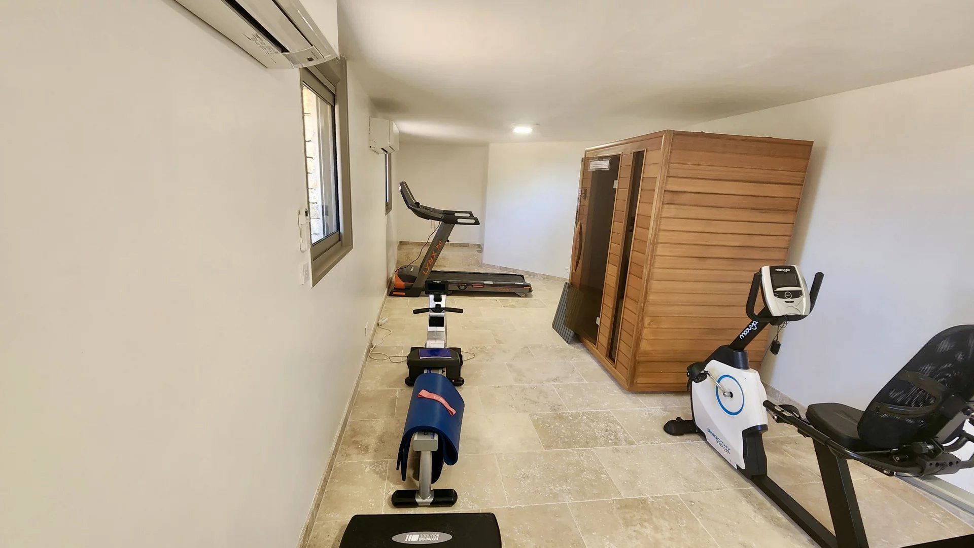 Salle de sport avec sauna et jacuzzi.