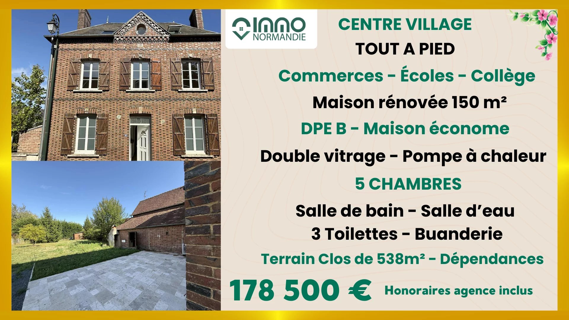 À 15 MINUTES DE BERNAY ET DE SA GARE (Paris/St-Lazare) - TOUT À PIEDS - CENTRE VILLAGE - - Commerces - Écoles - Collège - Services - - MAISON DE CARACTÈRE - 5 CHAMBRES - RÉNOVÉE - - DPE B (ÉCONOME) - TOUT À L'ÉGOUT - Vous apprécieriez au RDC, son côté convivial : - ESPACE DE VIE de 40m², lumineux et ouvert avec SALON avec une cheminée insert et CUISINE DÎNATOIRE avec sa baie vitrée ouvrant sur une TERRASSE (30m²) Toujours au RDC, son côté pratique : -TOILETTES avec lave-mains, BUANDERIE et CHAUFFERIE (pompe à chaleur air/eau). Un bel escalier dessert 2 étages. - 1er étage : Un Palier distribuant 3 CHAMBRES (15m²- 13.90m²-10.23m²), une SALLE D'EAU spacieuse avec grande fenêtre (Double vasques - Belle douche - Sèche serviettes), Toilettes séparées avec lave-mains ; - 2ème étage : Un Palier desservant 2 belles CHAMBRES (15m² - 20m²) , une SALLE DE BAIN (Double Vasque - Baignoire - Toilettes) Sur un TERRAIN CLOS de 538m² avec DÉPENDANCES. MAISON ÉCONOME - PRÊTE A VIVRE - TOUT À PIEDS - Agence IMMO-NORMANDIE 4 agences Pour vous accompagner dans votre Projet immobilier -- LA BARRE EN OUCHE -- BEAUMONT LE ROGER -- -- BRIONNE -- THIBERVILLE -- Retrouvez toutes nos annonces et vidéos sur notre site www.immonormandie.fr Contact : Benjamin ROMUALD -06.33.72.85.24- entrepreneur individuel (E.I.) agissant en sa qualité d'agent commercial, inscrit au Registre Spécial des Agents Commerciaux sous le numéro RSAC 812 264 455 00013