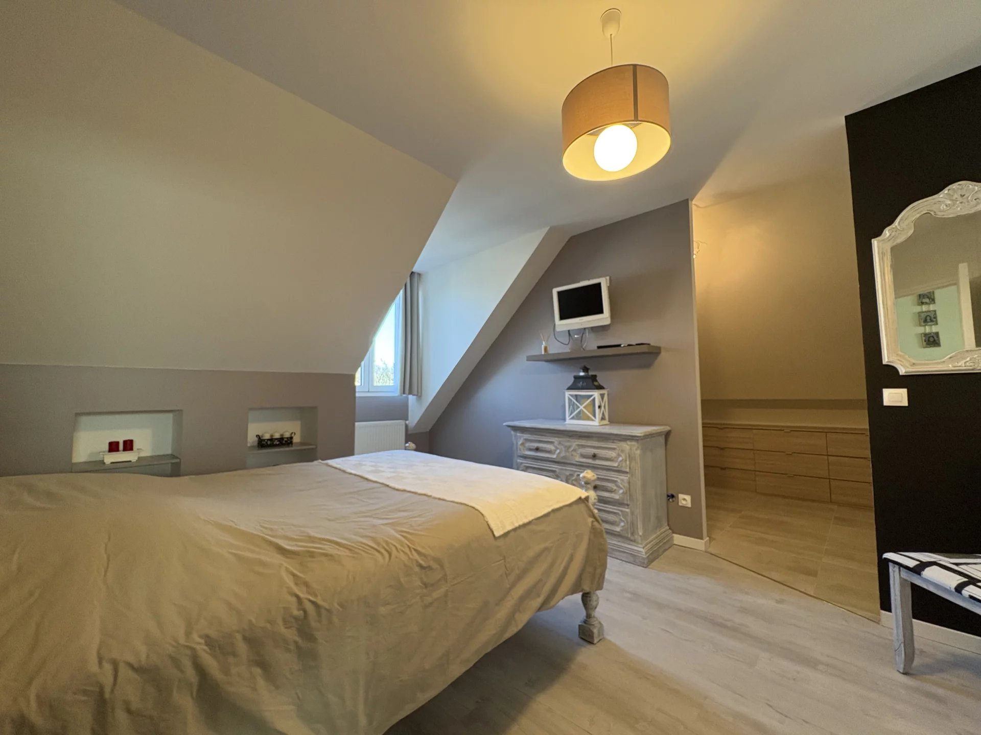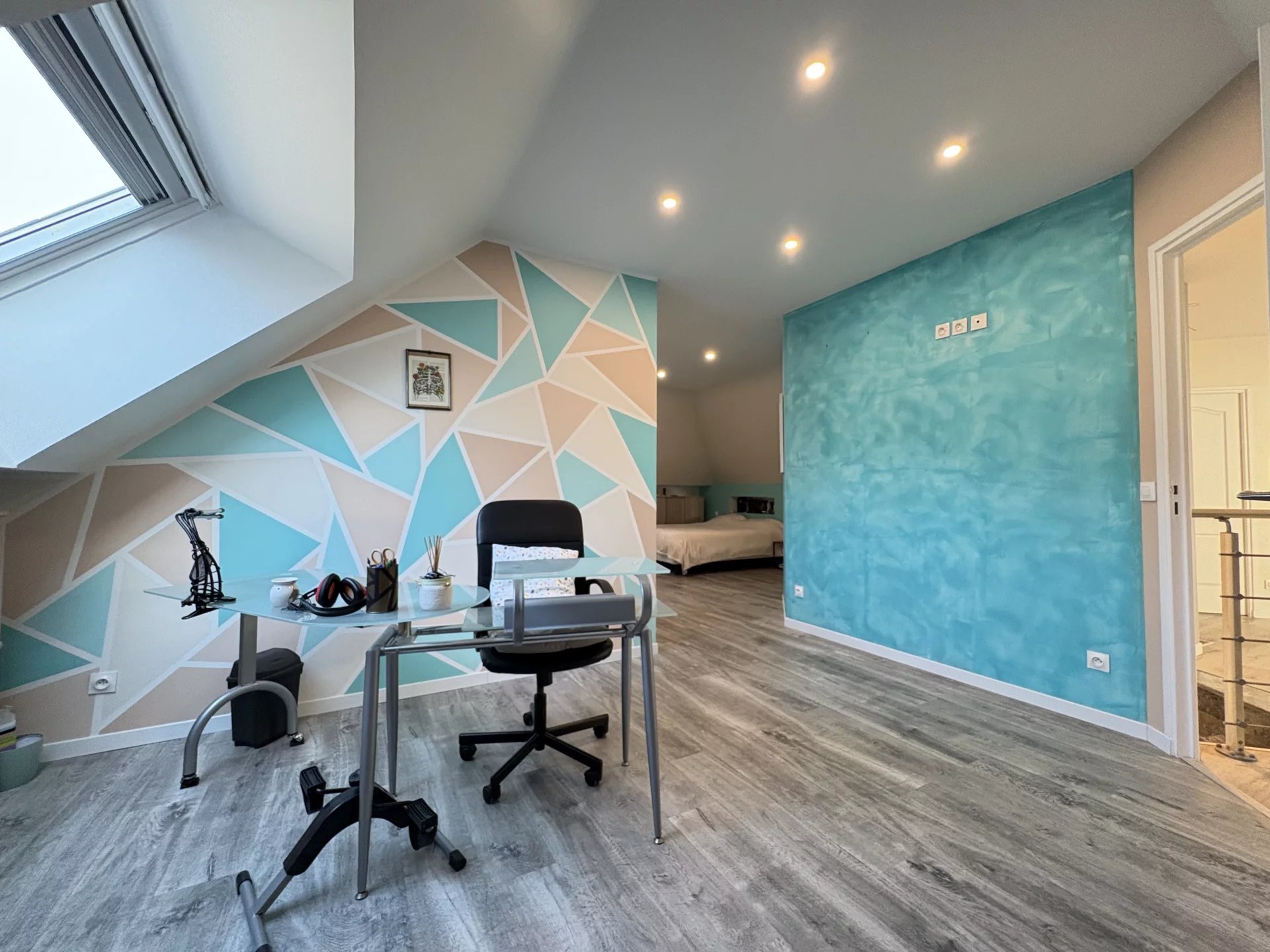 À l'étage, un grand hall pouvant être aménagé en espace détente, salon de lecture ou salle de jeux dessert un WC séparés, quatre chambres dont trois suites avec salle d'eau privative et dressing.