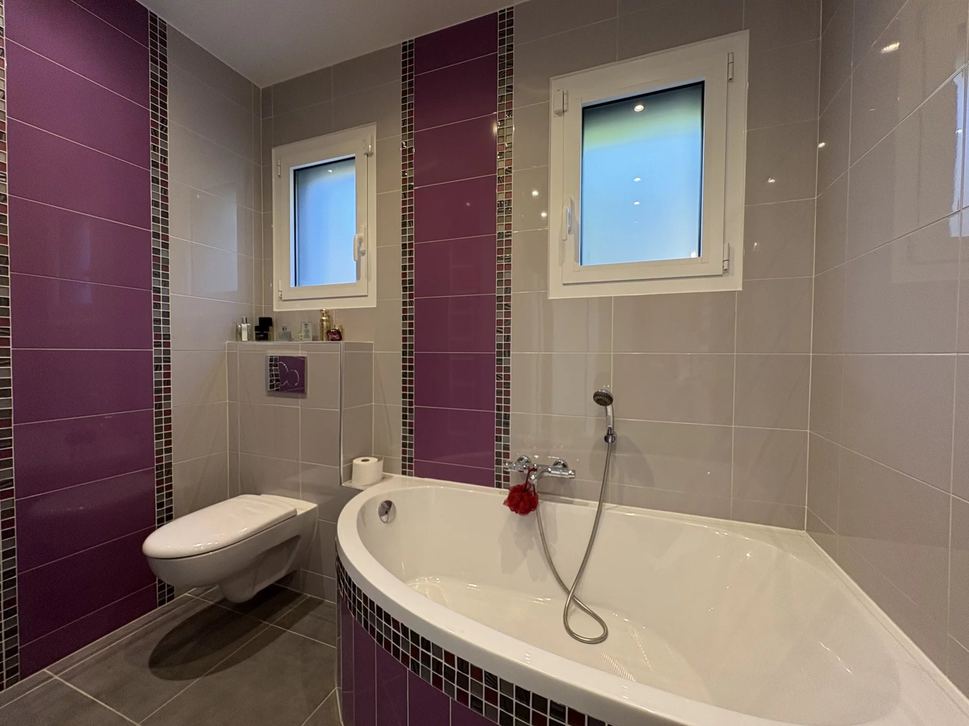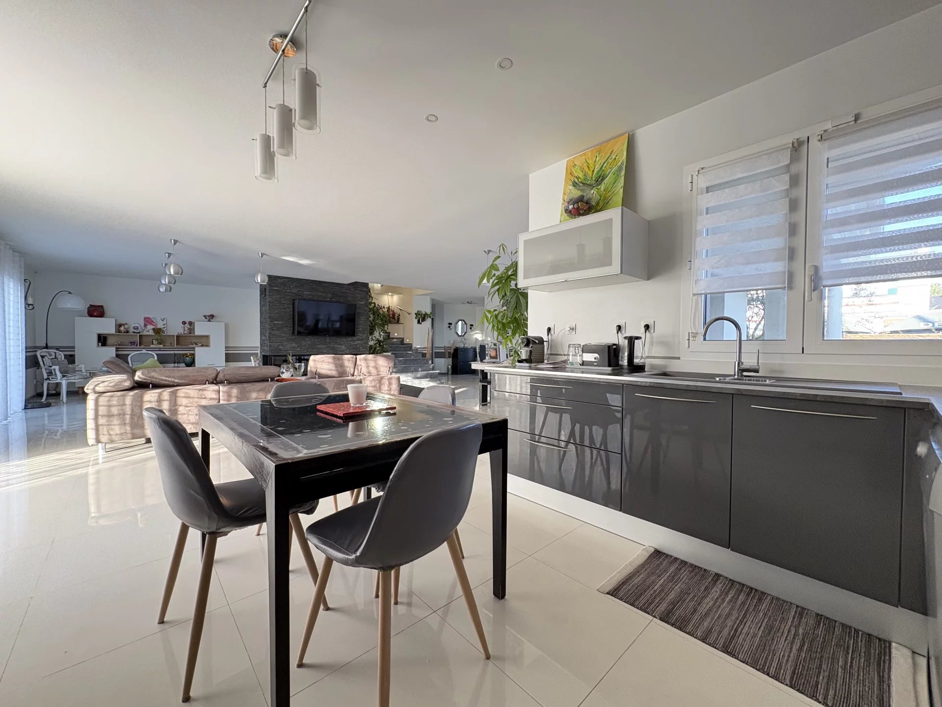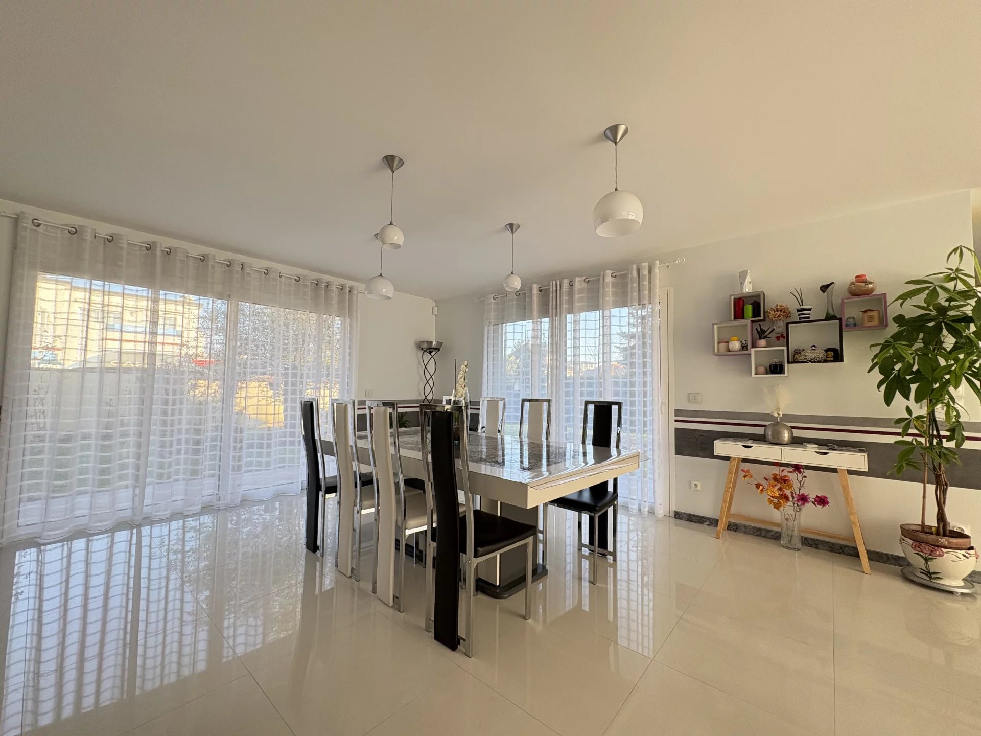 Les atouts de cette maison : toiture en tuiles plates, plancher chauffant, huisseries extérieures en aluminium avec volets roulants centralisés, isolation thermique et phonique, ainsi qu'une pompe à chaleur avec double isolation (intérieure et extérieure).