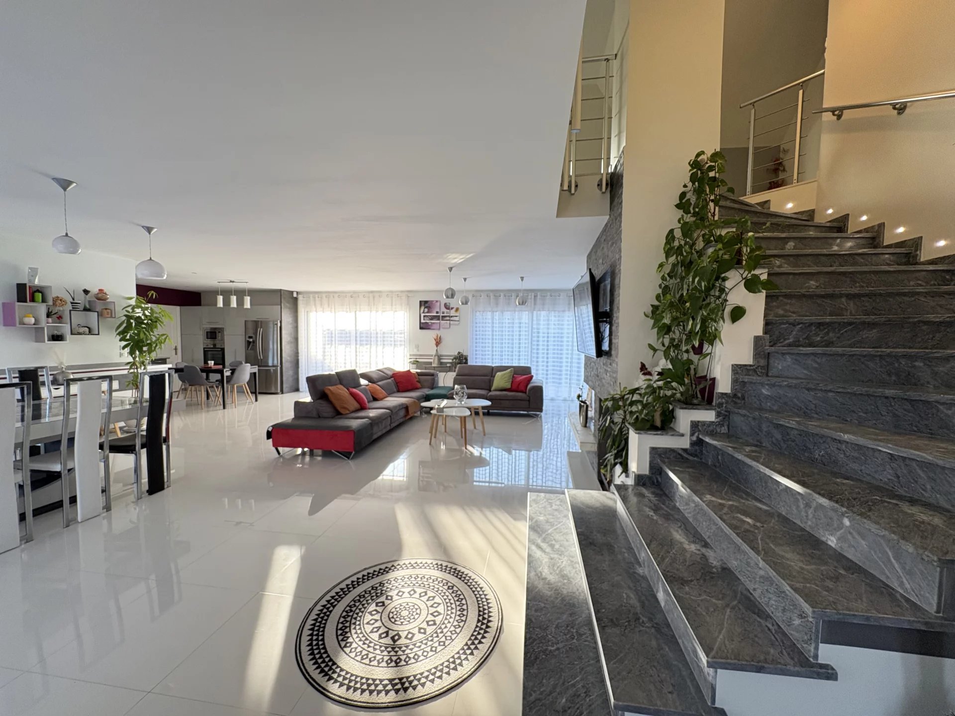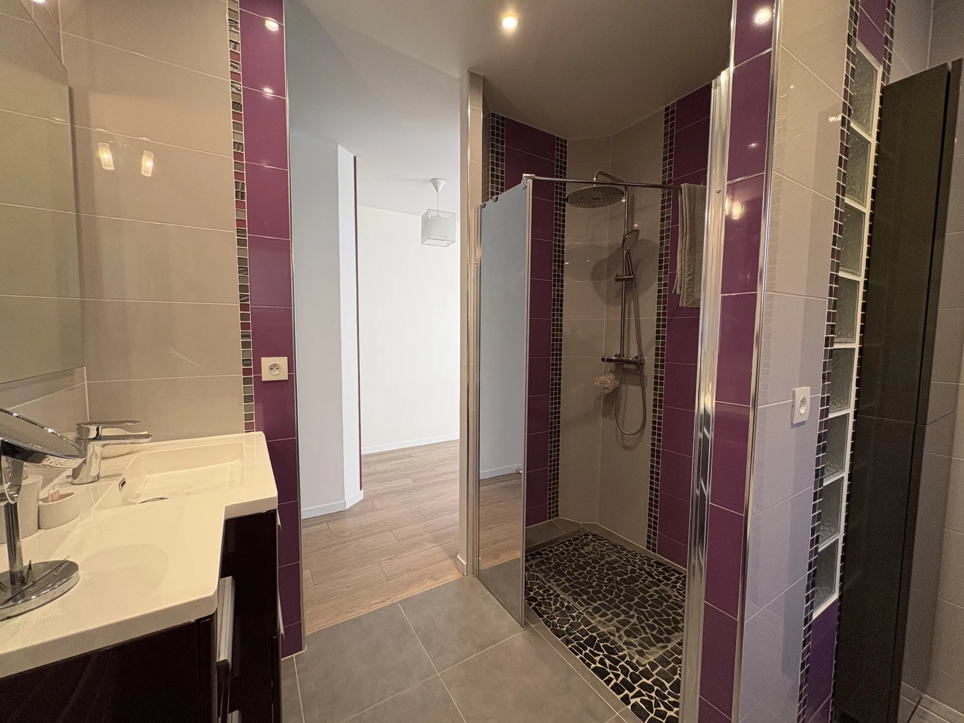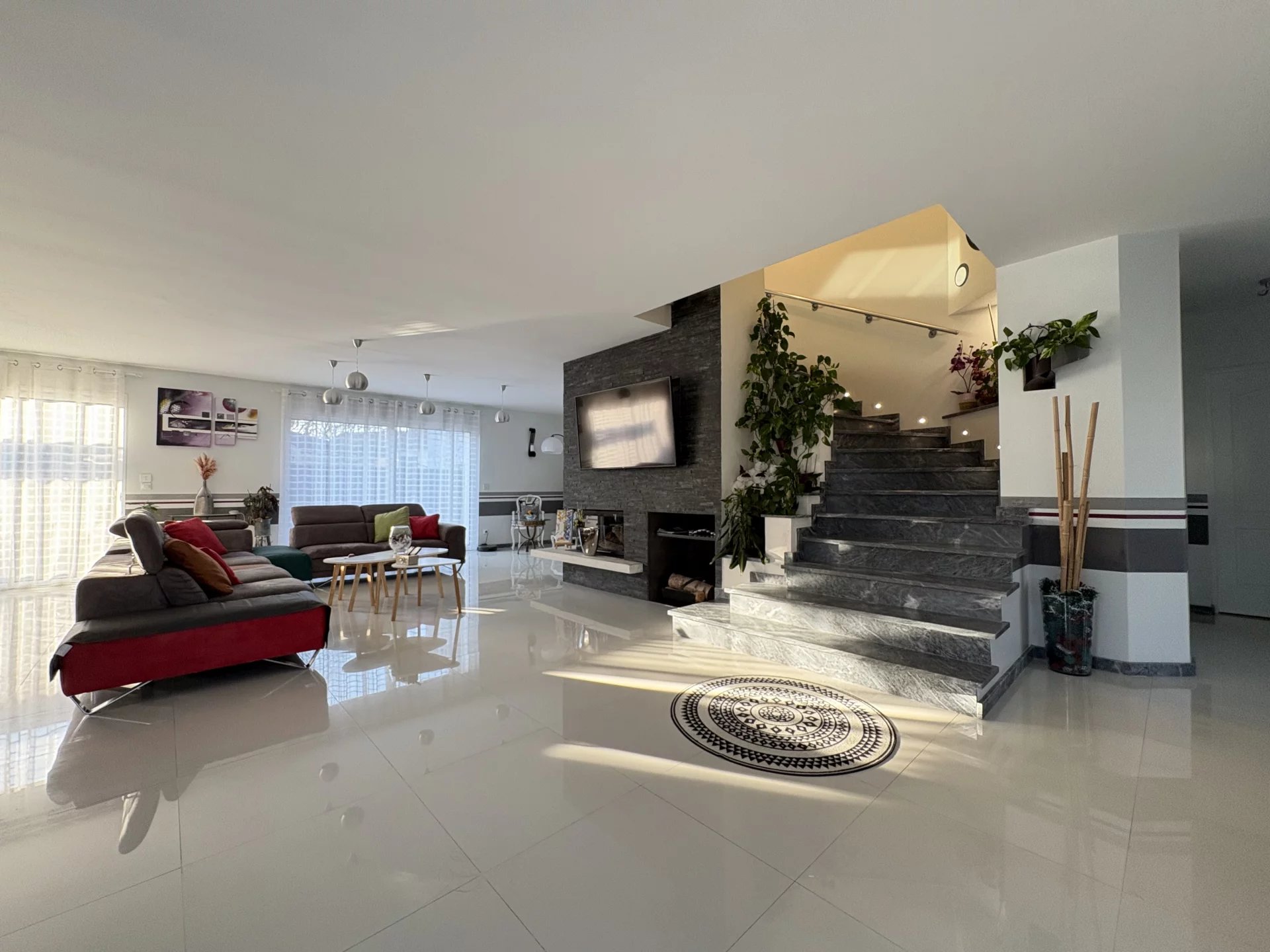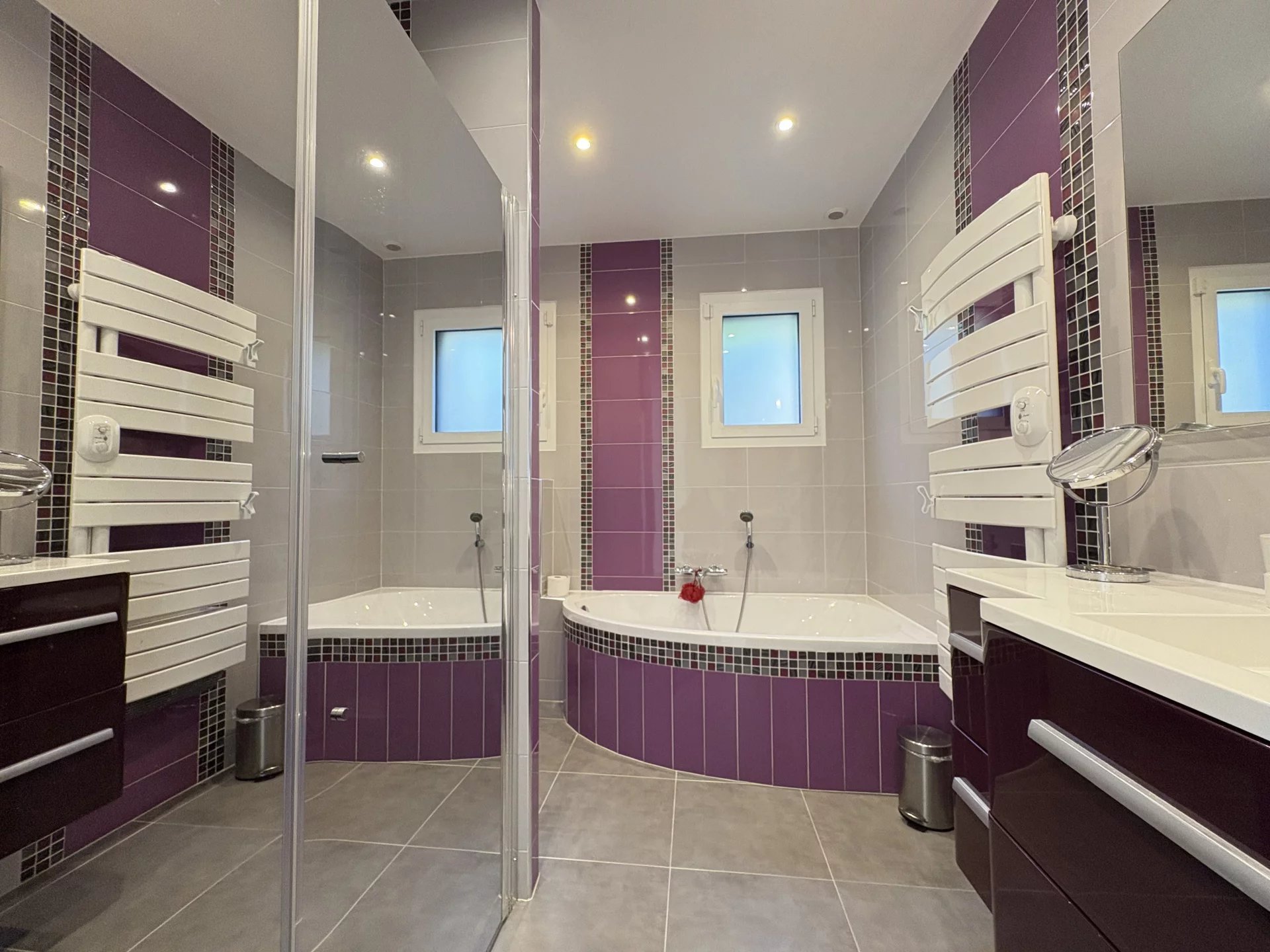 Les atouts de cette maison : toiture en tuiles plates, plancher chauffant, huisseries extérieures en aluminium avec volets roulants centralisés, isolation thermique et phonique, ainsi qu'une pompe à chaleur avec double isolation (intérieure et extérieure).