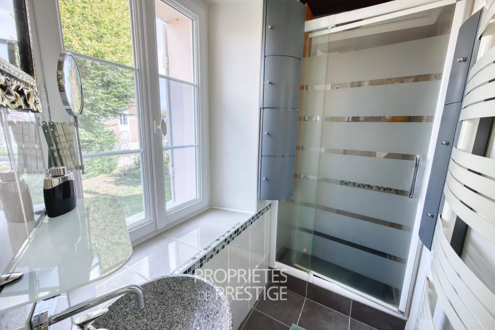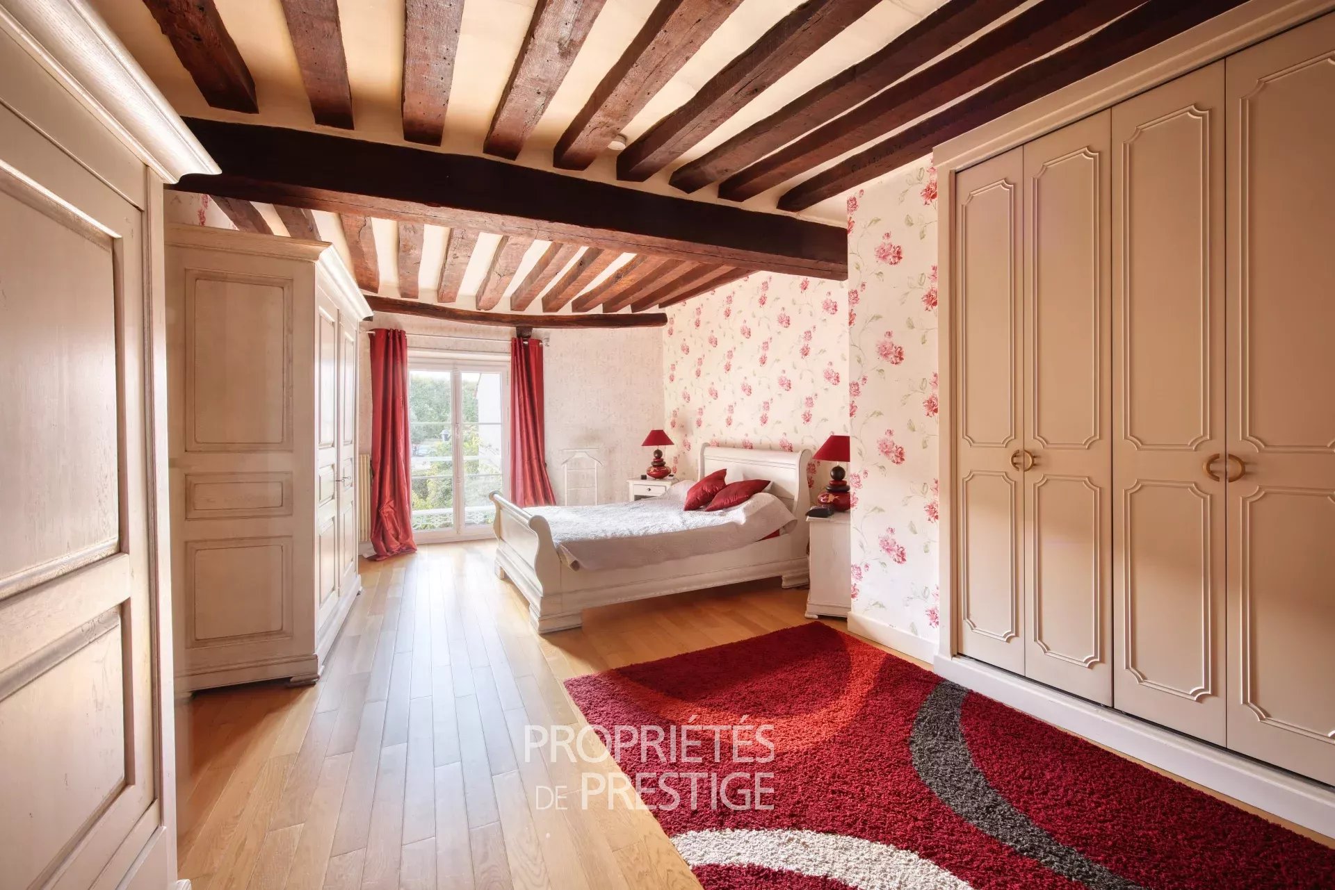 L’aile de la maison comprend, au rez-de-chaussée, une buanderie, une salle de douche avec toilettes, un atelier et un garage ; à l’étage, un palier et une salle de jeux et/ou un grand bureau. Aux étages de la bâtisse principale, un espace parental avec salle de douche, cinq belles chambres, deux salles de bain et un bureau. Les pièces des étages se caractérisent par la présence de belles poutres et structures de charpente apparentes.