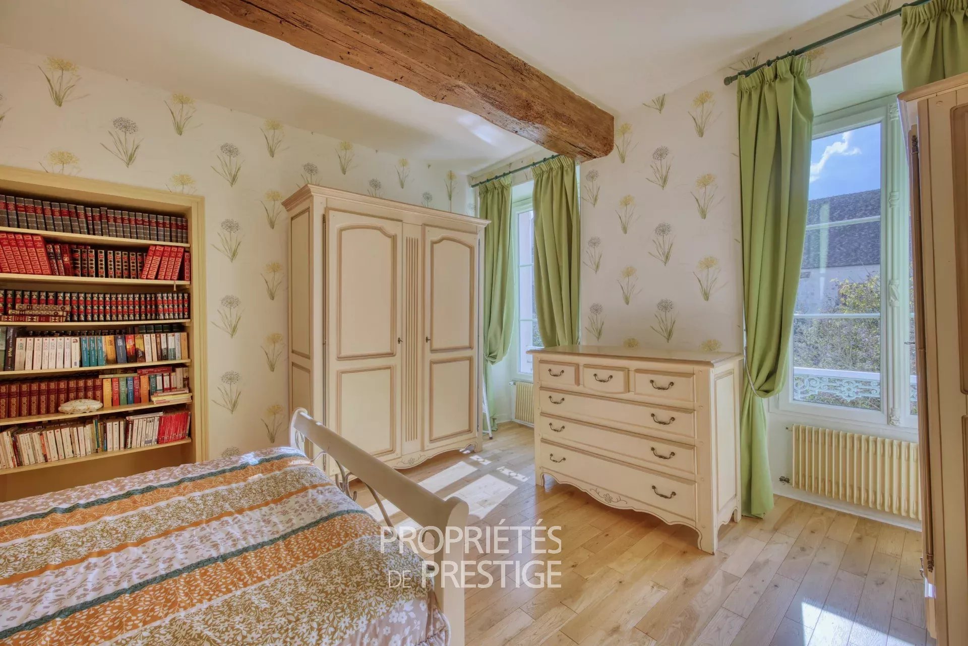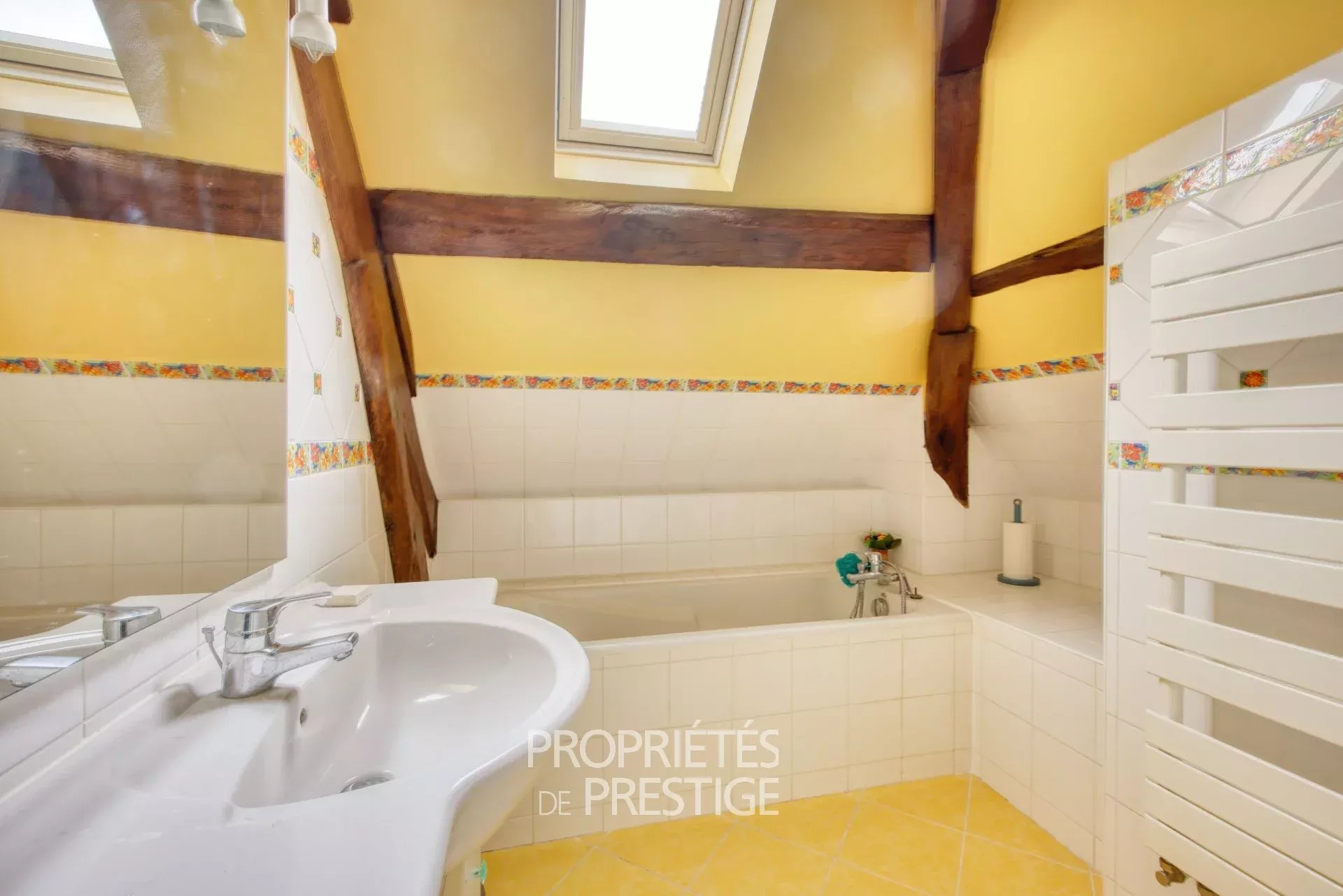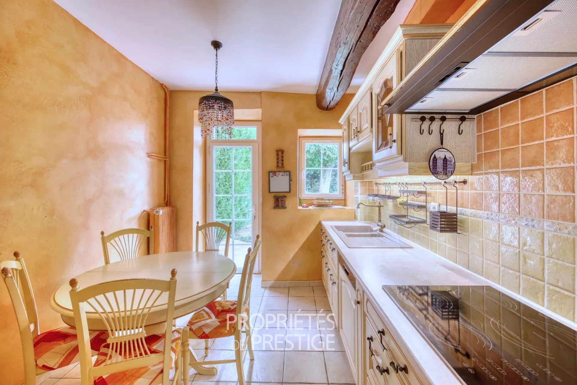 Passée la cour pavée côté rue, on accède à la maison par une entrée qui distribue à la fois le salon avec cheminée et de belles poutres anciennes, la salle à manger très lumineuse avec cheminée, donnant sur la cour et le jardin, ainsi que la cuisine orientée côté jardin.