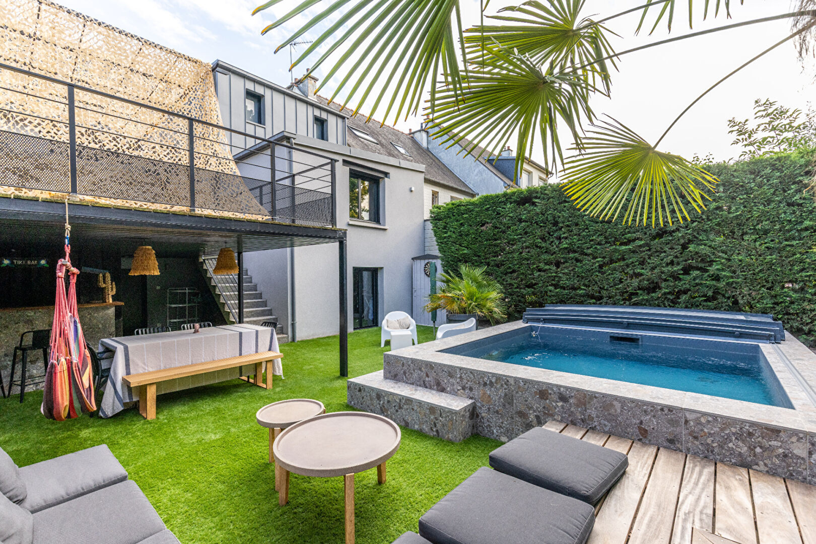 NOUVEAUTÉ A VENDRE CHEZ CABINET BARTH IMMOBILIER - MAISON ENTIÈREMENT RÉNOVÉE AVEC PISCINE ET SAUNA - 7 PIÈCES - 170 M2 - RENNES HENRI FREVILLE Retrouvez nos biens en vidéo sur notre compte Instagram : barth_immobilier Venez poser vos valises dans cette superbe maison des années 50 entièrement rénovée avec goût et modernité pour créer un style contemporain et industriel qui saura vous charmer. Vous bénéficierez d'une localisation idéal au calme au sein d'une impasse et à proximité immédiate du métro Henri Fréville, des commodités (Super U, Lidl, boulangeries...) et des écoles (maternelle, primaire et collège). Cette maison exceptionnelle, entièrement rénovée en 2019, se compose: Au rez-de-chaussée, une grande entrée accueillante avec rangements, dessert une pièce donnant l'accès à une chambre. Elle permet un accès direct au jardin et bénéficie également d'une salle d'eau avec WC et surtout d'un SAUNA !! Idéal pour profiter de ses bienfaits toute l'année tout en étant chez vous. Un garage permettant le stationnement d'une voiture ou bien le stockage de vos affaires est accolé à un espace buanderie donnant lui aussi l'accès à l'espace extérieur. Vous pourrez justement profiter, dans ce jardin très intimiste et paysagé, d'une belle piscine avec son abri haut de gamme, permettant à la fois de chauffer cette dernière et d'y sécurisé son accès vis-à-vis des enfants. Vous y découvrirez également un magnifique salon de jardin où vous pourrez vous prélasser sous le palmier en famille ou avec des amis et profiter d'une cuisine d'été à l'abri. Au premier étage, vous serez accueilli par le double salon/séjour avec cuisine ouverte entièrement aménagée et équipée. Un ensemble très agréable et totalement ouvert donnant une réelle impression de grandeur et d'espace. Le poêle à granulé apporte lui aussi son style à la pièce et bien sûr son côté pratique et agréable. L'accès à une grande terrasse se faisant directement de la cuisine, offre un autre confort non négligeable qui saura autant vous satisfaire vous que vos invités et permettra de profiter du soleil jusqu'à la nuit tombée. Côté pièce de nuit, vous disposerez d'une suite parentale très intimiste et cocooning avec son dressing et sa salle d'eau avec double vasque et des WC séparés. Enfin, au deuxième et dernier niveau, vous serez accueilli par deux chambres. Une de part et d'autre de l'escalier, toutes deux d'une belle surface et profitant, à l'instar de toutes les autres chambres, de leur propre dressing et d'une salle d'eau avec WC. Ce qui distingue cette propriété ? Le fait qu'il n'y ait aucun travaux à prévoir, et la localisation de cette belle maison pleine de charme et de surprise. Aussi, le calme et le chant des oiseaux lorsque vous profiterez des espaces extérieurs. Cela devrait réussir à vous projeter aisément dans cette propriété afin d'y vivre votre plus belle vie de famille. N'HÉSITEZ PLUS ET VENEZ VISITER SANS ATTENDRE ! Contactez votre agence Cabinet BARTH Immobilier pour plus de renseignements sur cette maison en vente à RENNES. Référence : 1804AR (3.17 % honoraires TTC à la charge de l'acquéreur.) Anthony REY (EI) Agent Commercial - Numéro RSAC : 983169905 - Rennes.
