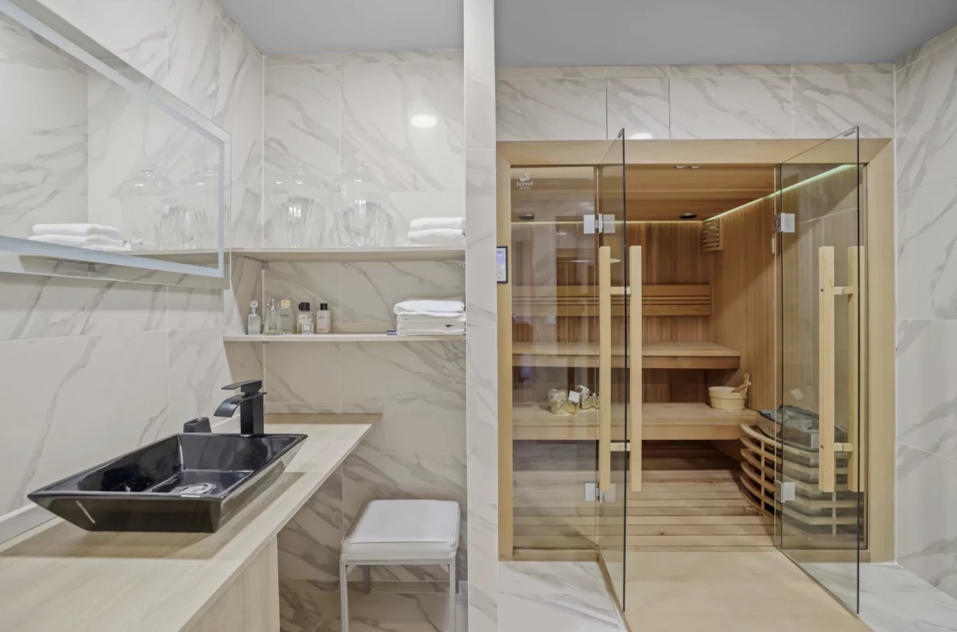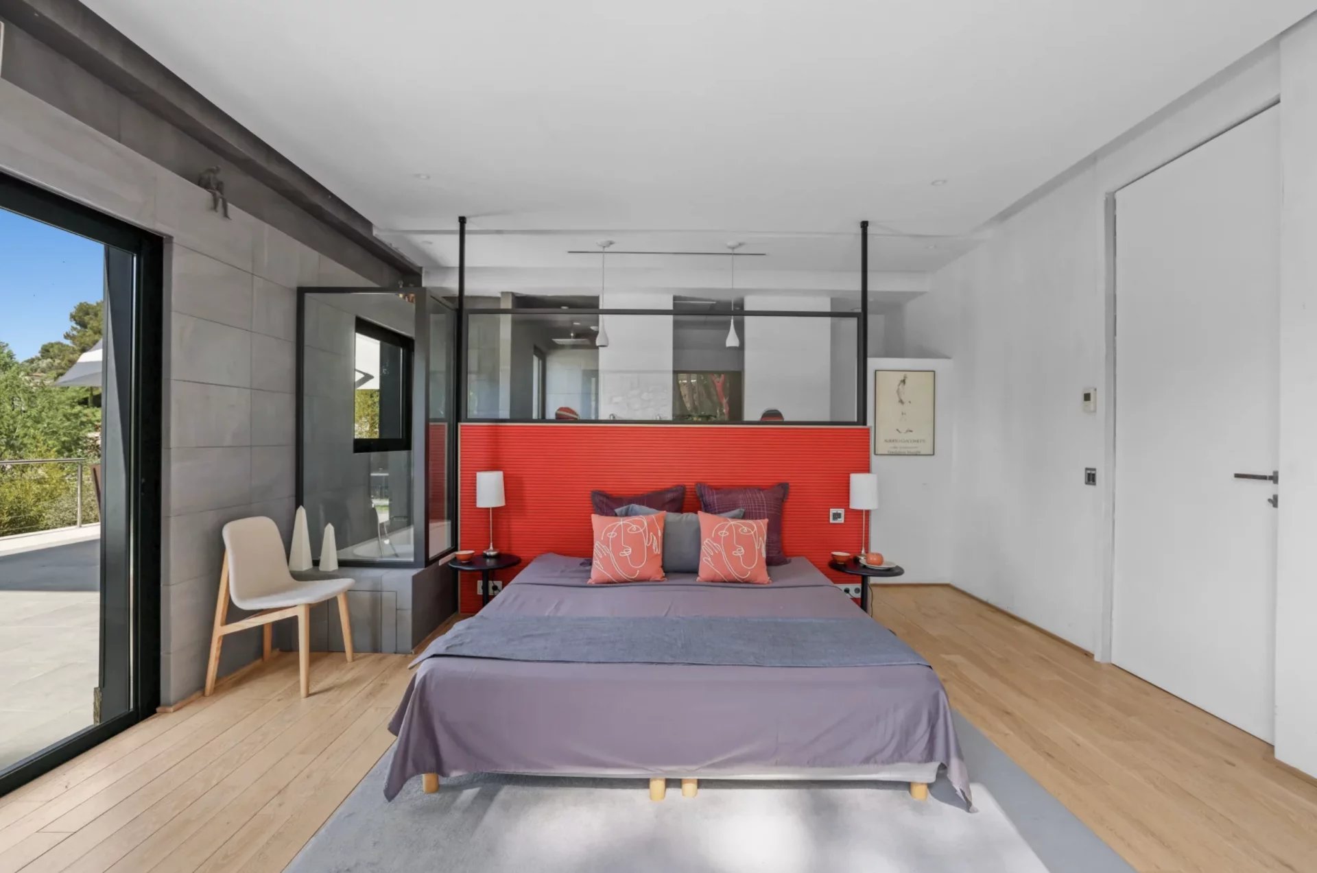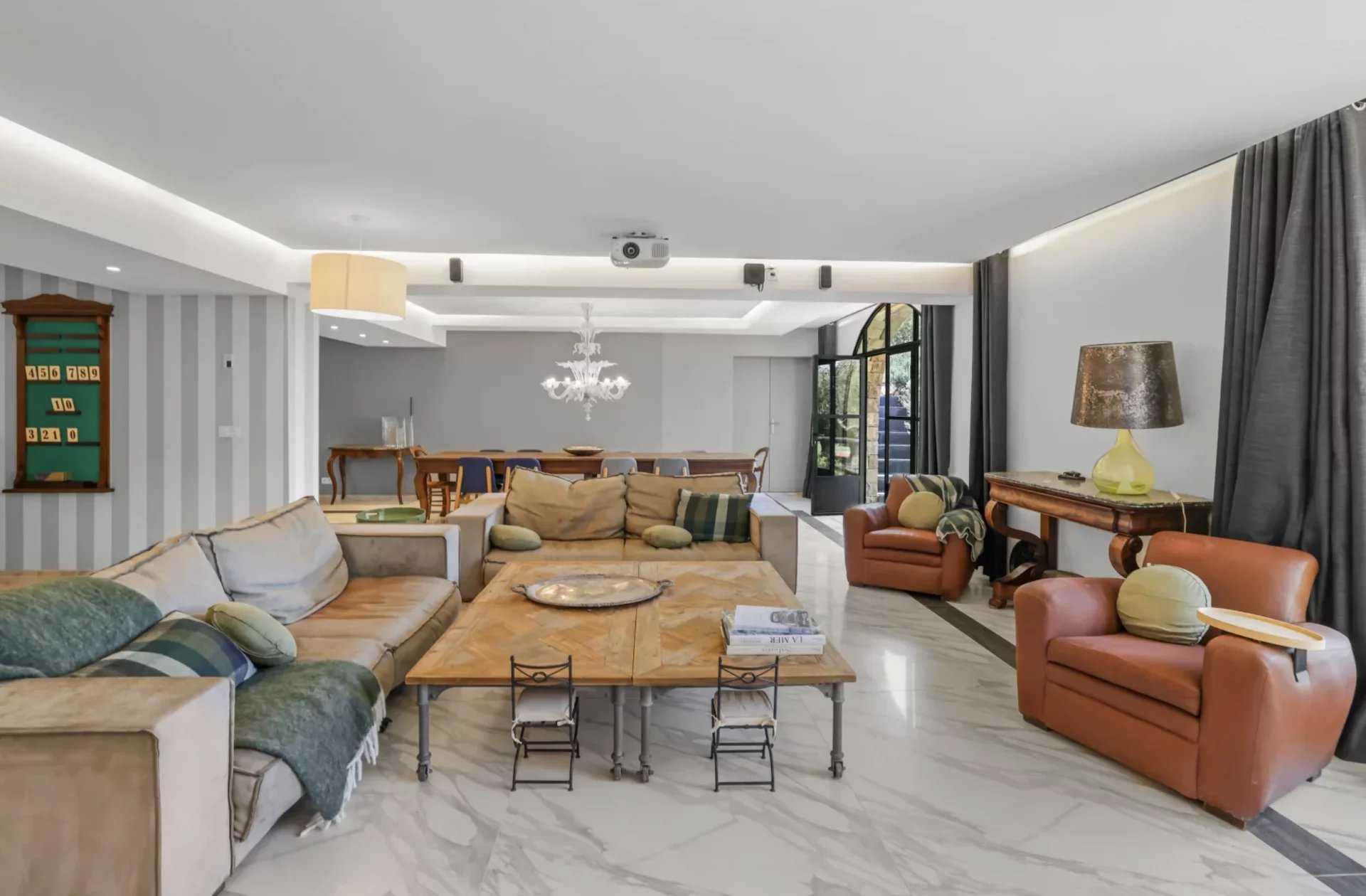 Dès l’entrée, le ton est donné avec un vaste espace de vie cathédrale baigné de lumière grâce à sa verrière motorisée, une cheminée, un espace salle à manger et une cuisine ouverte entièrement équipée, le tout s’ouvrant sur une large terrasse avec espace repas extérieur.