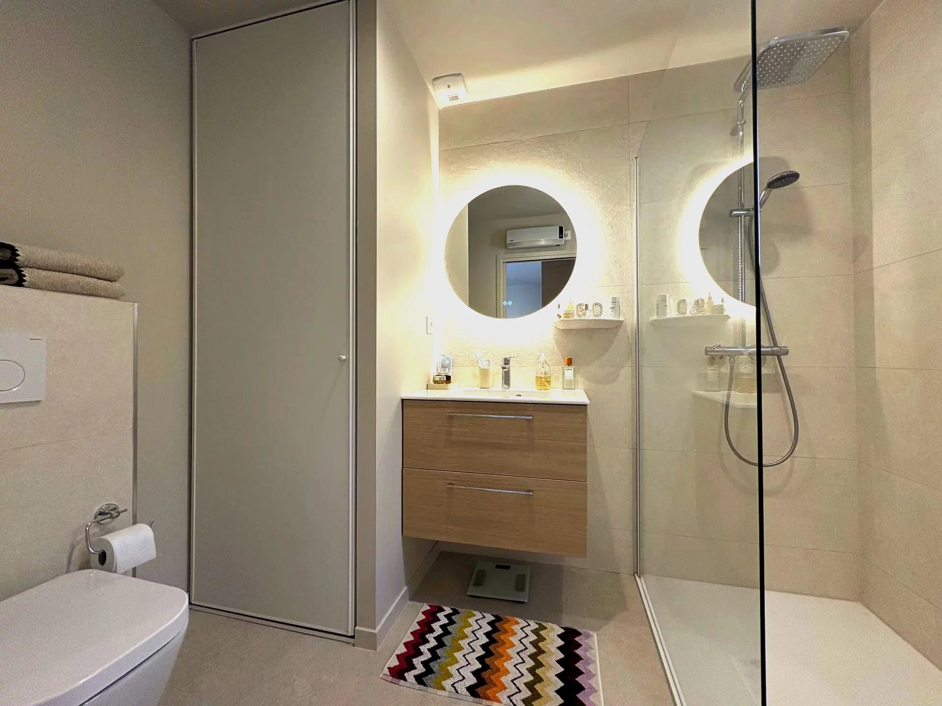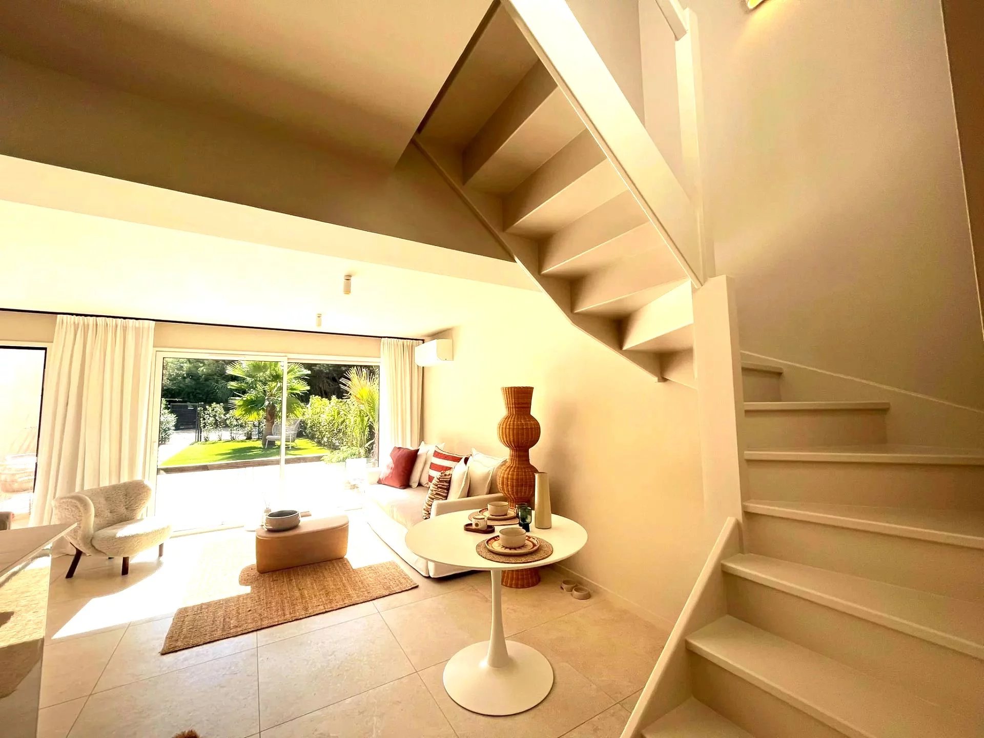 Répartie sur deux niveaux, la maison offre un vaste séjour baigné de lumière avec cuisine entièrement équipée, ouvert sur un jardin paysager de 90 m². L’espace nuit se compose de deux suites confortables avec dressings et salles d’eau modernes, conçues avec des matériaux de qualité et un style raffiné.
