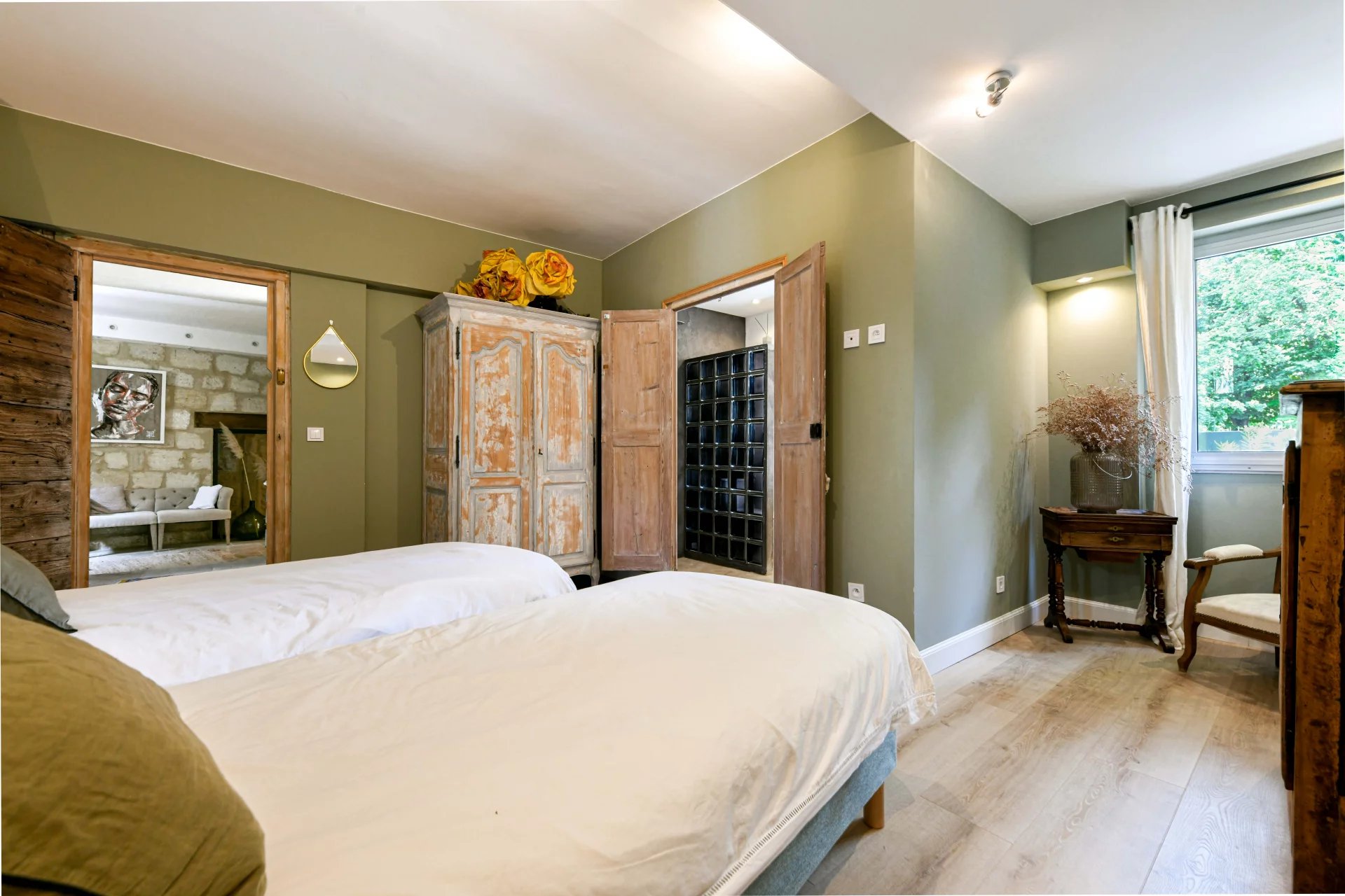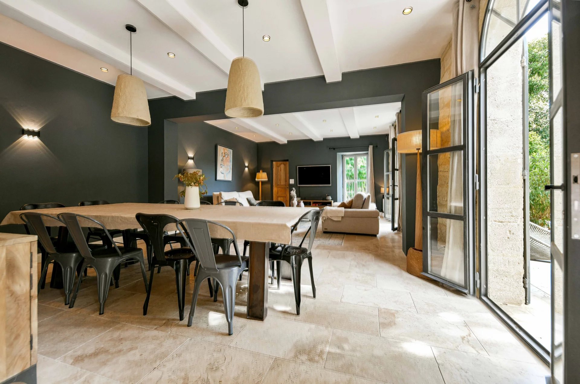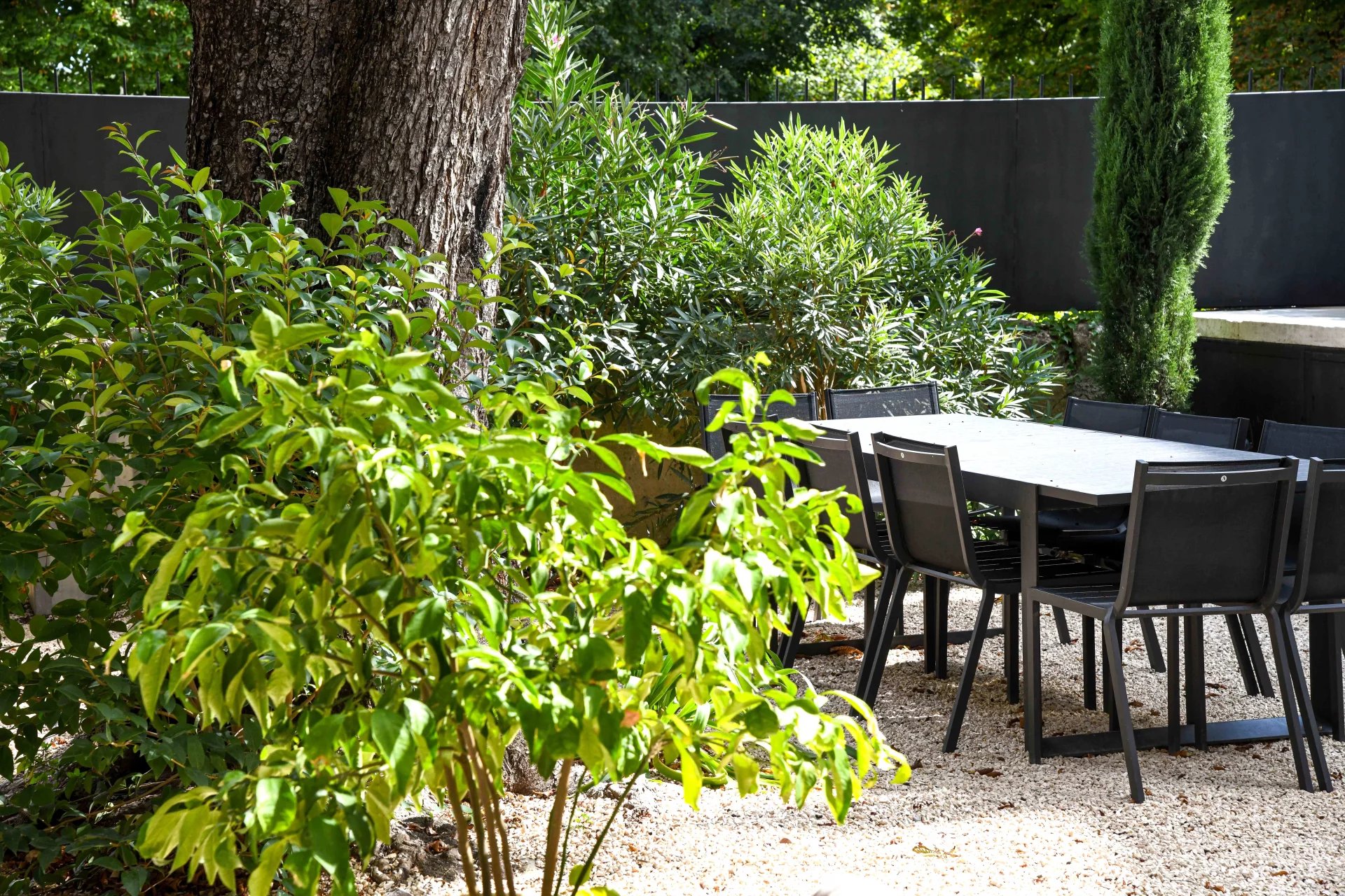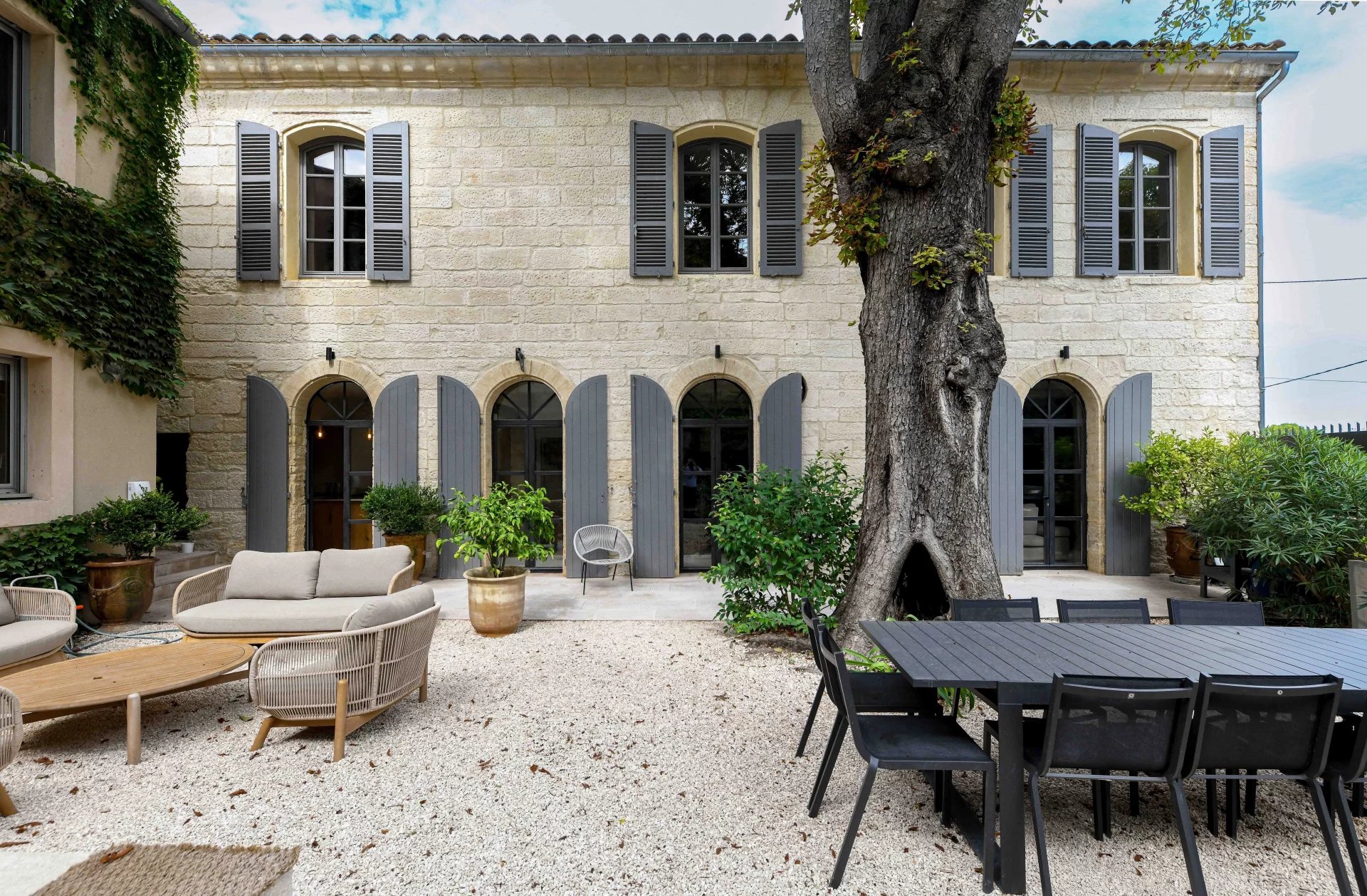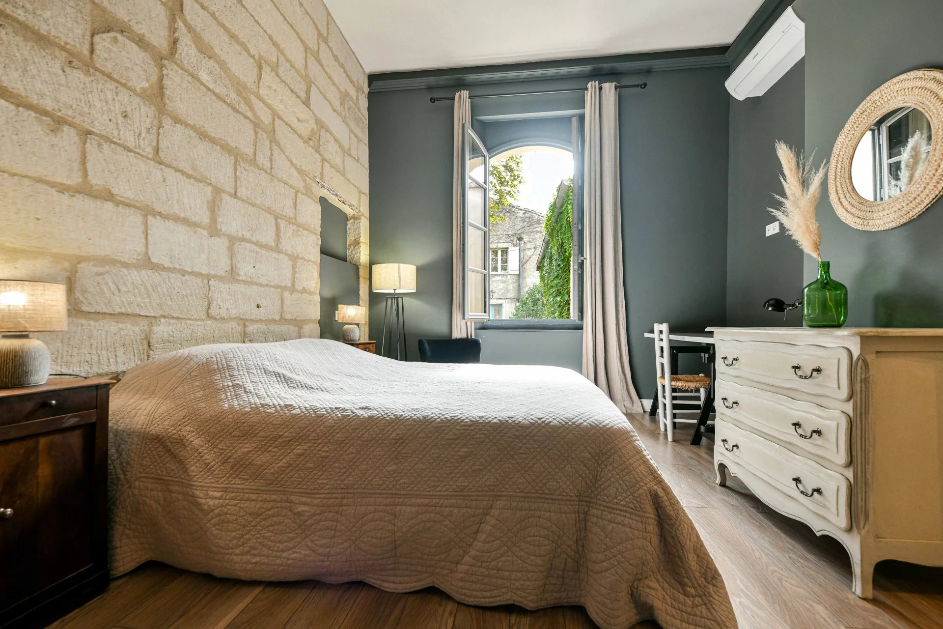 Emplacement unique et rare dans le centre d’Uzès Pièces de réception ouvertes sur le jardin, beaux volumes 7 chambres, 7 salles de bains (dont une suite au rez-de-chaussée) Jardin avec arbre majeur et bassin, belles perspectives sur la bâtisse
