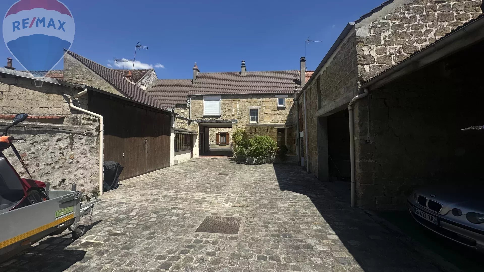Le tout donnant sur une grande cour extérieure en pavé permettant de bénéficier d'un espace détente et d'un garage et de 6 places de parkings dont 4 couvertes.