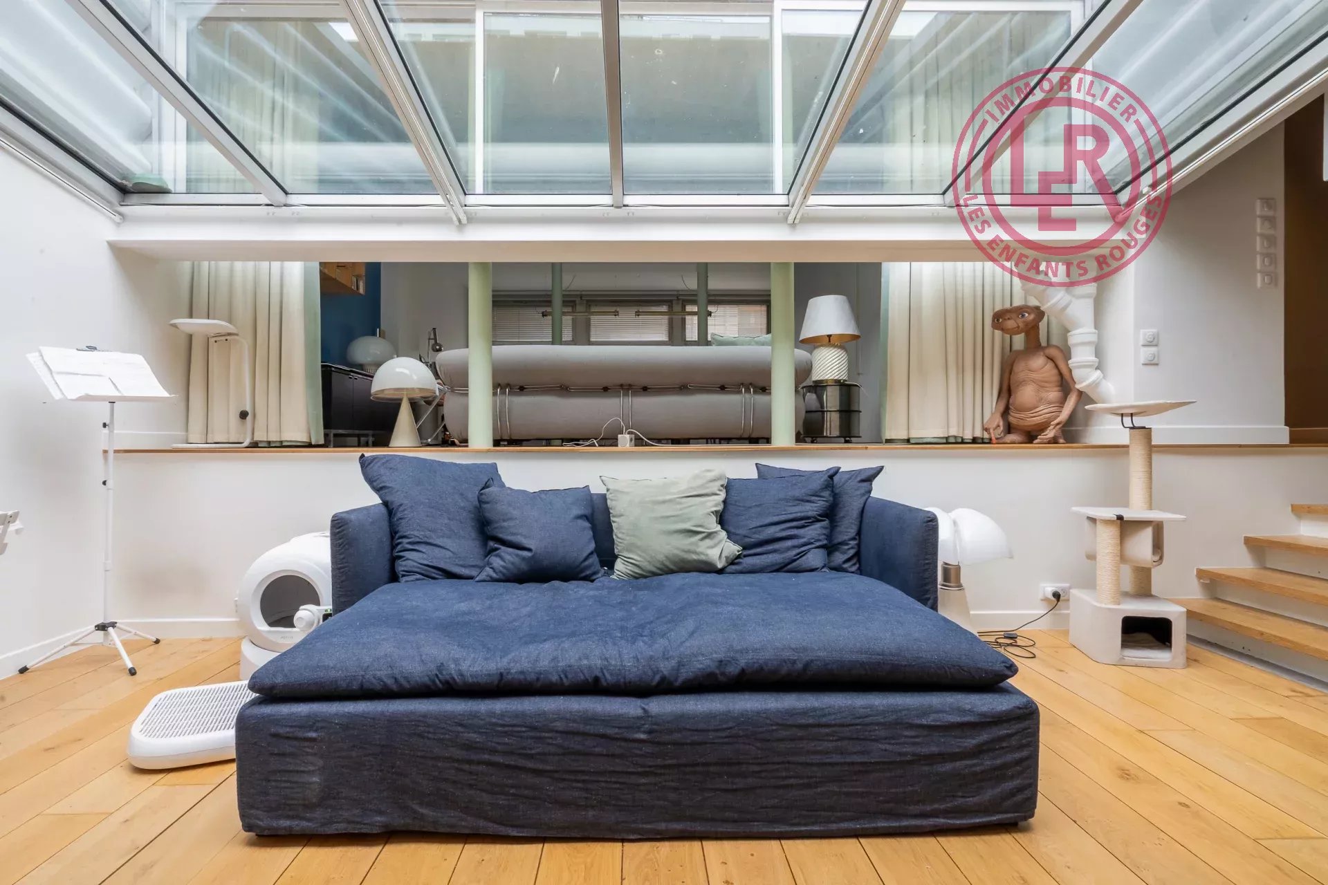 EXCLUSIVITÉ / OFF MARKET. Au rez-de-chaussée sur cour, dans une belle copropriété de 1851 avec gardien, un appartement type Loft de 106,06m2 carrez (110,37m2 au sol) refait par architecte comprenant un grand séjour traversant Sud-Ouest/Nord-Est donnant sur une cuisine-salle à manger, en contrebas et sous une verrière, une chambre de maitre avec salle de bains, une chambre par escalier en demi-étage, de très nombreux rangements, et des toilettes séparées.