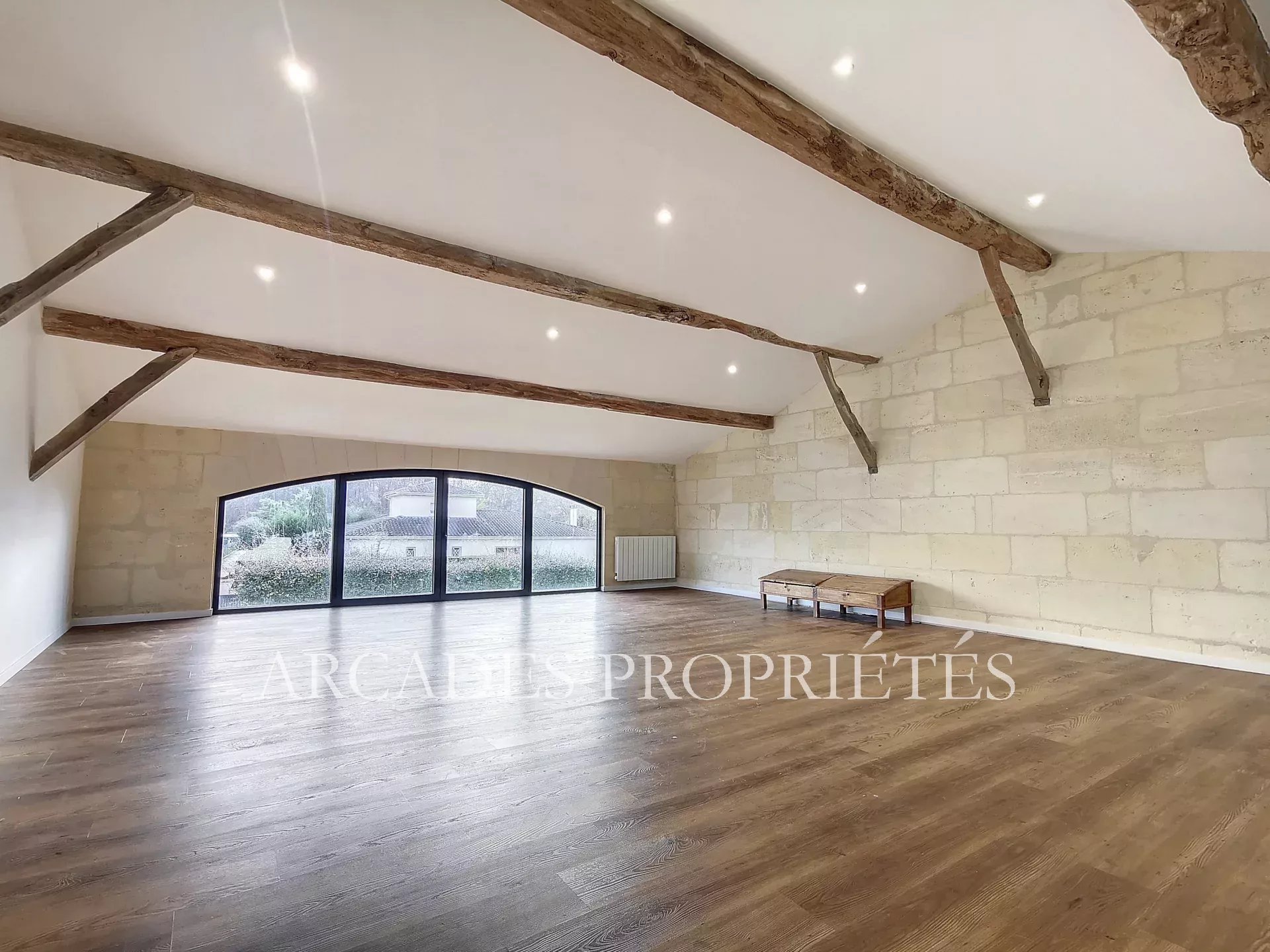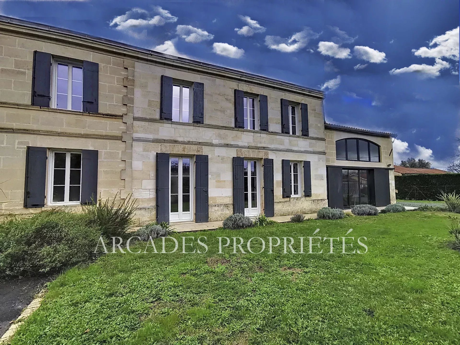 BELLE MAISON EN PIERRE de 440 m² entièrement rénovée en 2015 avec piscine sur 1900 m² de terrain environ . Au rez de chaussée une grande entrée desservant une cuisine aménagée de près de 34 m² , une magnifique pièce de vie donnant sur une terrasse couverte, un espace nuit avec trois chambres une salle d'eau cave à vin. A l'étage, cinq chambres, une salle de bains . Attenant à la maison, un vaste espace bureau de plus de 130 m² sur deux niveaux . Une piscine, un garage , un atelier complètent cette belle maison aux nombreuses possibilités. A mi chemin entre Bordeaux et Libourne, située dans un secteur résidentiel proche de toutes les commodités.