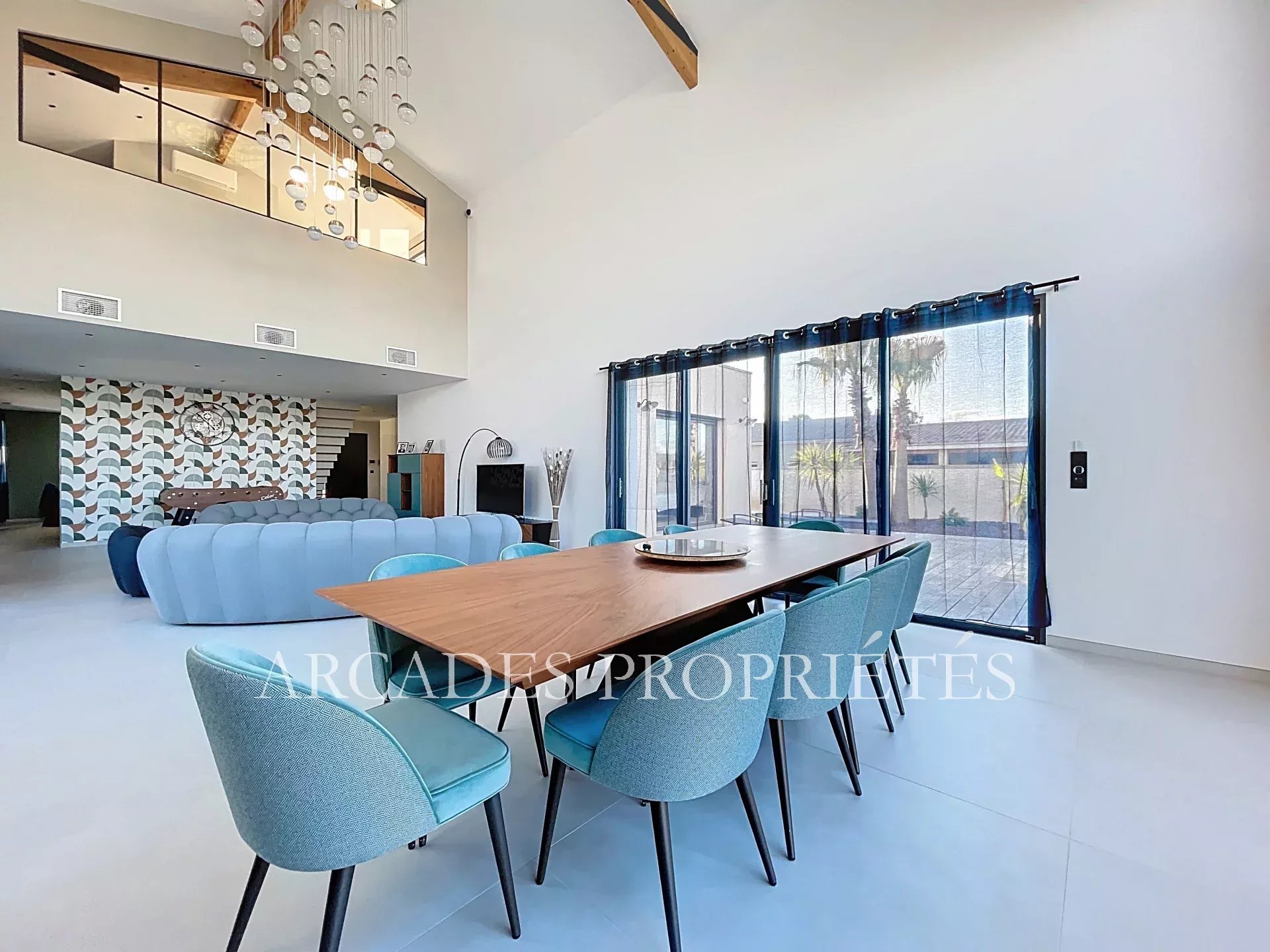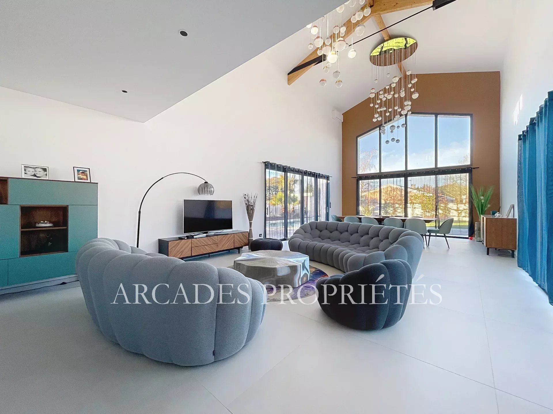 Maison moderne et contemporaine. Luxe, lumière et confort à proximité du Golf. Dans un secteur prisé, cette superbe maison moderne et contemporaine, achevée en 2023, allie design raffiné, volumes généreux et prestations haut de gamme, offrant un cadre de vie exceptionnel pour toute la famille. Le rez-de-chaussée dévoile un élégant espace de vie de plus de 110 m², baigné de lumière grâce à sa très grande hauteur sous plafond, comprenant entrée, salon, salle à manger et cuisine ouverte. Une suite parentale avec dressing et salle d’eau, offrant un accès direct à la piscine, ainsi qu’une deuxième chambre avec salle d’eau, un bureau, une buanderie et un cellier indépendant, complètent ce niveau avec raffinement. À l’étage, une salle de jeux ou de détente et deux autres chambres, chacune avec sa salle de bain ou salle d’eau privative, offrent un espace nuit confortable et modulable pour toute la famille. À l’extérieur, sur un terrain de 1 500 m², vous découvrirez un grand garage double, un carport de plus de 30 m², une cuisine d’été et un espace de rangement, parfaitement intégrés à l’ensemble. La piscine au sel, carrelée et chauffée, avec son local technique séparé, complète ce cadre de vie idyllique, idéal pour profiter pleinement des beaux jours. Conçue avec des matériaux de qualité et répondant aux dernières normes de construction, cette maison dispose de plancher chauffant et climatisation, garantissant confort et modernité en toute saison. Proche de toutes les commodités et du Golf, cette propriété constitue un bien rare sur le secteur, alliant l’élégance contemporaine, le confort et la sérénité. Un véritable coup de cœur pour une vie familiale raffinée, dans un cadre lumineux et sécurisé. ARCADES PROPRIÉTÉS.