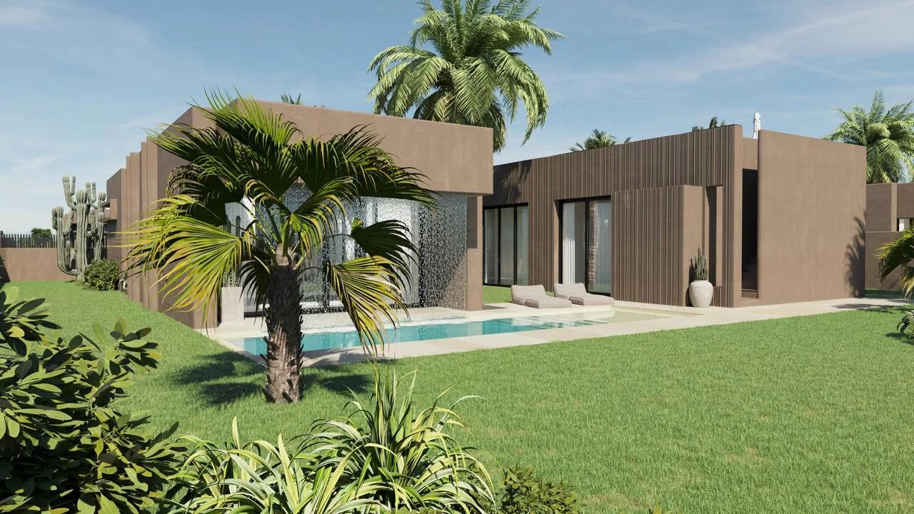 À 13 km sur la route de l’Ourika, face aux montagnes de l’Atlas, la Villa AFRA s’implante comme un havre de paix contemporain, où douceur des lignes et matériaux nobles composent un art de vivre épuré. Le plain-pied s’ouvre largement sur le jardin et la piscine, dans un dialogue permanent entre intérieur et extérieur, avec un rooftop panoramique pour profiter des fins de journée sur l’Atlas. Dès l’entrée, le regard file vers la piscine plein sud et le jardin paysager, composant une véritable oasis privée. Le séjour principal, intégrant salon, salle à manger et cuisine ouverte, se déploie autour du patio central, cœur végétal de la villa, qui insuffle lumière et fraîcheur toute la journée. Grâce à de larges baies vitrées à galandage, l’intérieur et l’extérieur se confondent dans une continuité harmonieuse; La Villa AFRA comprend trois suites, chacune pensée comme un cocon. La suite parentale avec accès direct sur la piscine, grande salle de bain avec baignoire, douche à l’italienne, double vasque et dressing aménagé. Les suites 2 et 3, toutes deux équipées de salle de douche privative et placards intégrés, orientées vers le patio ou le jardin. Le confort se vit au quotidien : menuiseries aluminium noir RAL 9005 et double vitrage de sécurité pour de grandes baies performantes, isolation renforcée (murs R≈3,15, plafonds R≈5–7,5), climatisation gainable réversible multi-zone pilotée par domotique (écran tactile et smartphone), et pré-équipement solaire en toiture pour maîtriser ses consommations. La cuisine est livrée équipée (BOSCH ou équivalent) four, plaques induction, hotte et les menuiseries intégrées mêlent finitions noyer et teintes naturelles pour une ambiance chaleureuse et intemporelle. Dehors, place aux plaisirs simples : piscine privée aux lignes longues (plage immergée, cascade, LED) avec option chauffage par pompe à chaleur, jardin paysager et rooftop personnalisable d’environ 100 m² pour les soirées étoilées. Les chiffres qui comptent: -Parcelle : env. 1190 m2 • Rooftop : ≈110 m² -Surface bâtie : ≈364.5 m² (dont ≈ 295 m² hors terrasses) -Piscine : ≈10 × 3,10 m, prof. ≈1,50 m, plage immergée On aime: -Le patio central, source de lumière naturelle au cœur de la villa. -Le confort technique (isolation, double vitrage, clim gainable, domotique, pré-solaire). -Le rooftop personnalisable avec vue Atlas et la piscine aux finitions soignées. -Le plan fluide et parfaitement fonctionnel, tout en plain-pied. -Le calme du domaine et la qualité des finitions. -Une pièce de vie de 98 m2 tournée vers la piscine