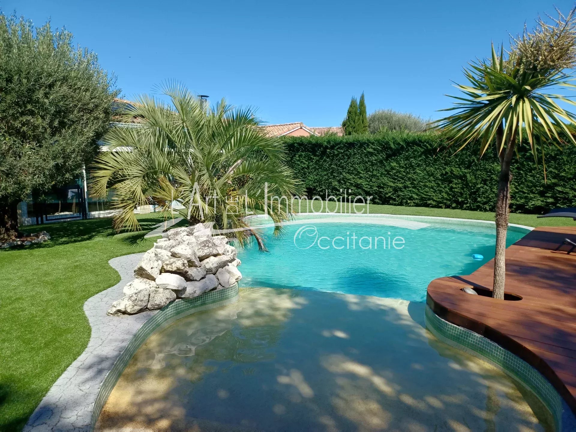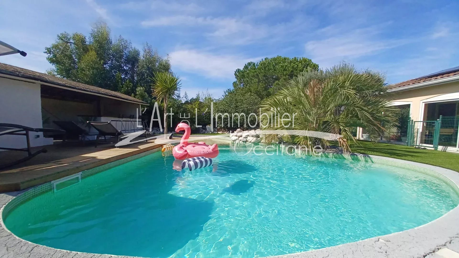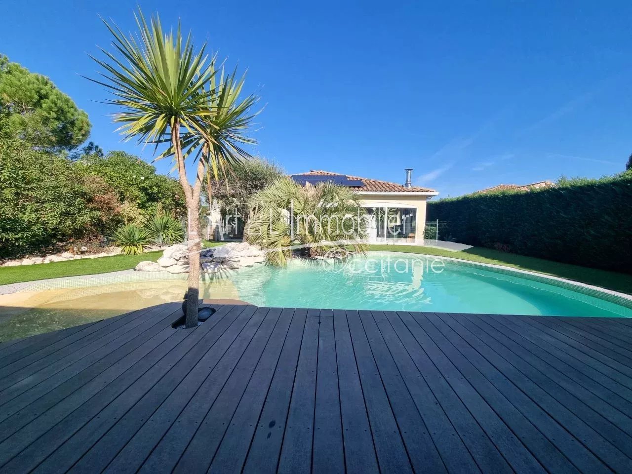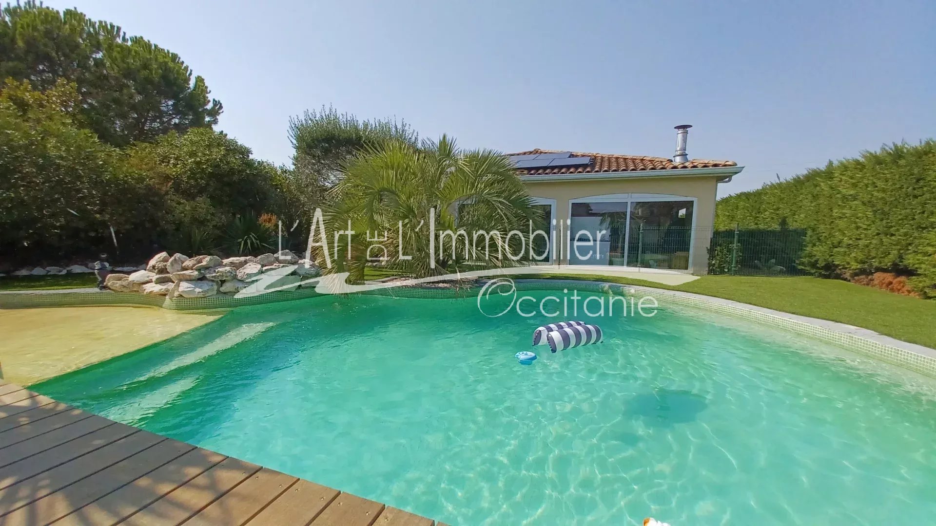 Belle maison de plain pieds, de type 7. Son intérieur vous propose son entrée/dégagement, placard, toilettes. Séjour-poêle bois/Cuisine équipée/us, 5 chambres dont 1 parentale équipée de son dressing et sa salle d'eau, bureau. Buanderie, cellier. Véranda chauffée par un poêle à bois, contemporain, ouverte sur le jardin et piscine. Garage, dépendance. Panneaux photovoltaïques. L'ensemble édifié sur un terrain clos de 1245 m².