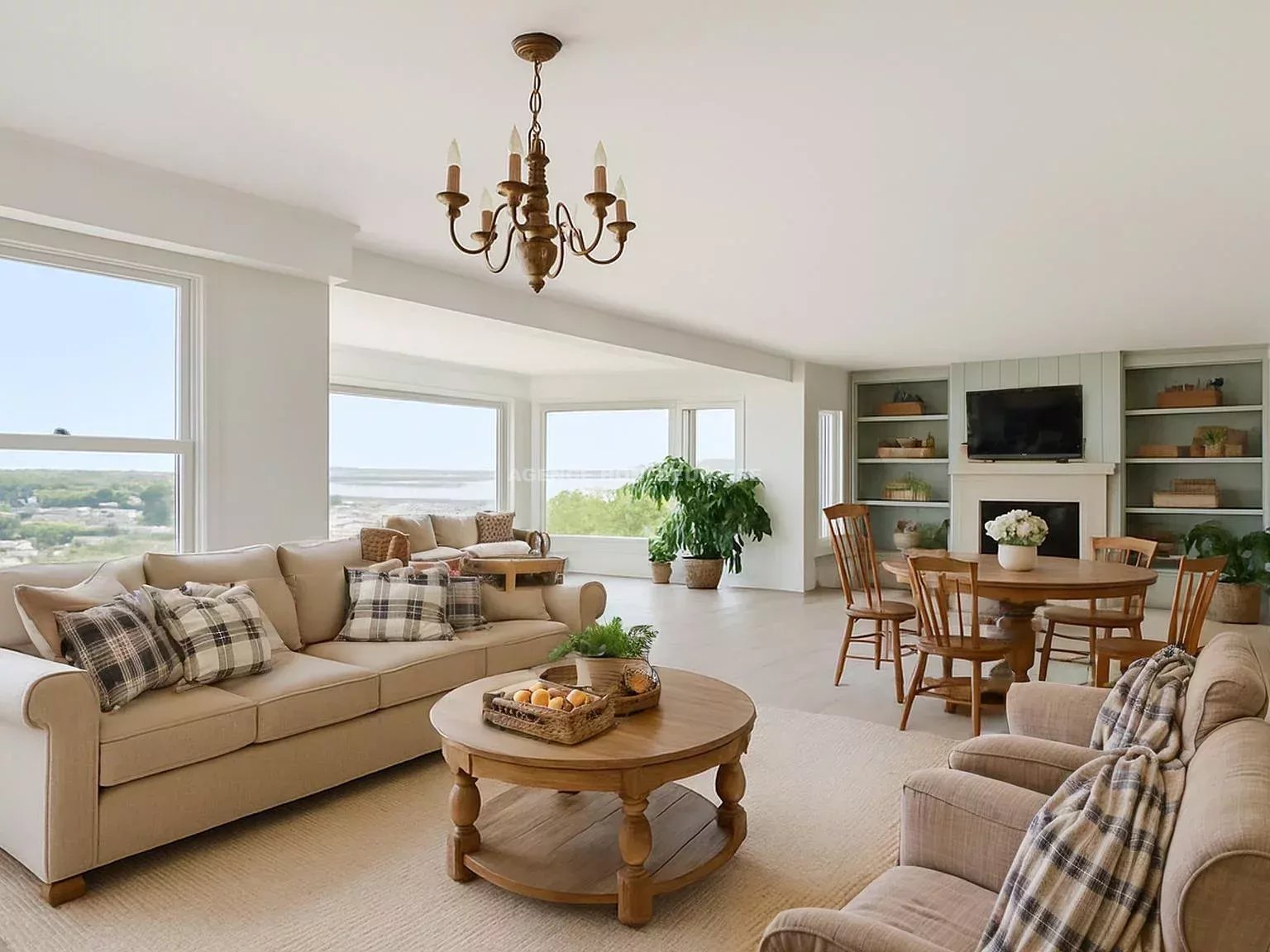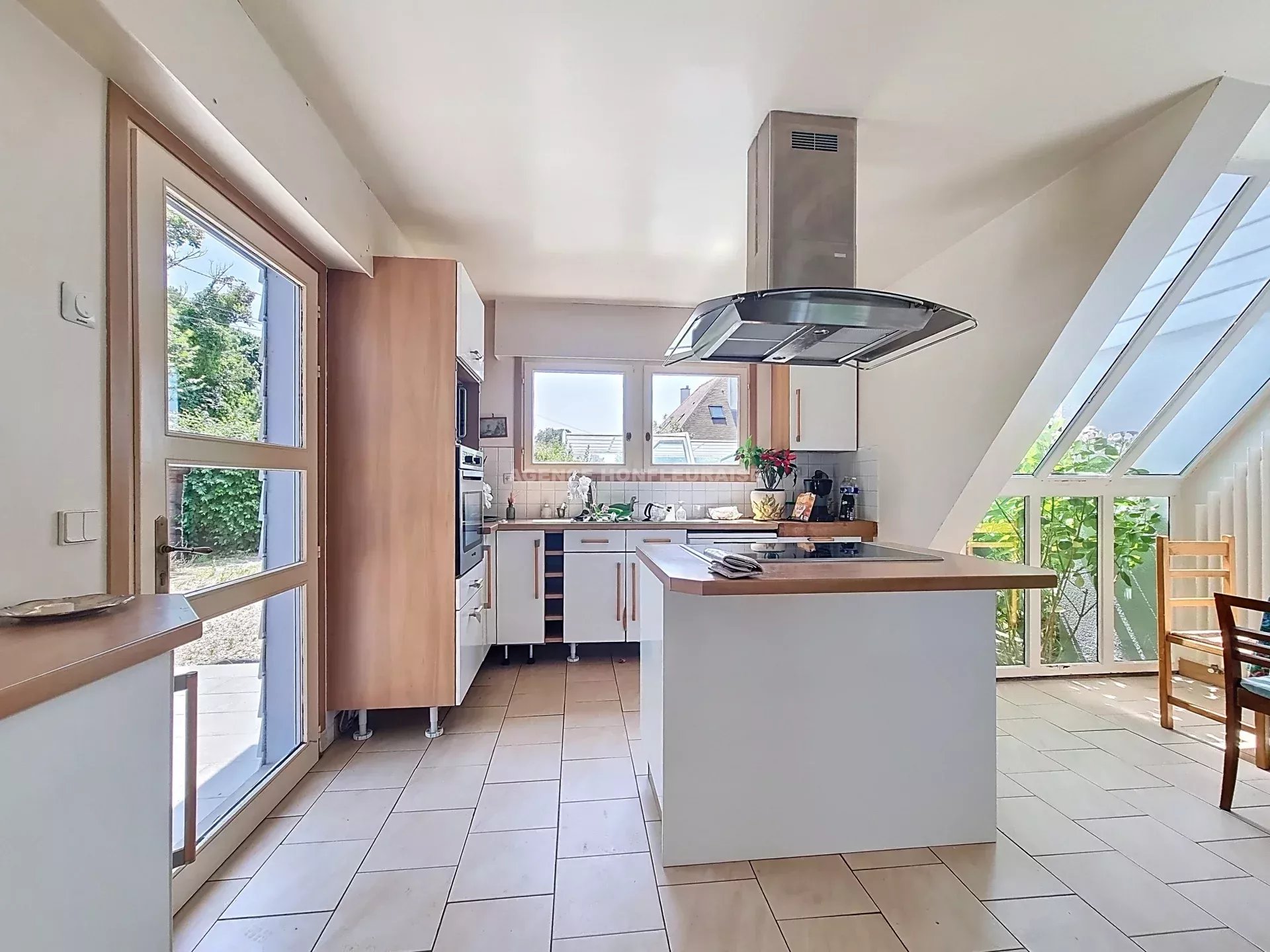 Au rez-de-chaussée : entrée, cuisine aménagée, bureau, très belle pièce de vie (65 m²) avec cheminée, bow-window orientée vers l’estuaire, vestiaire, toilettes ;