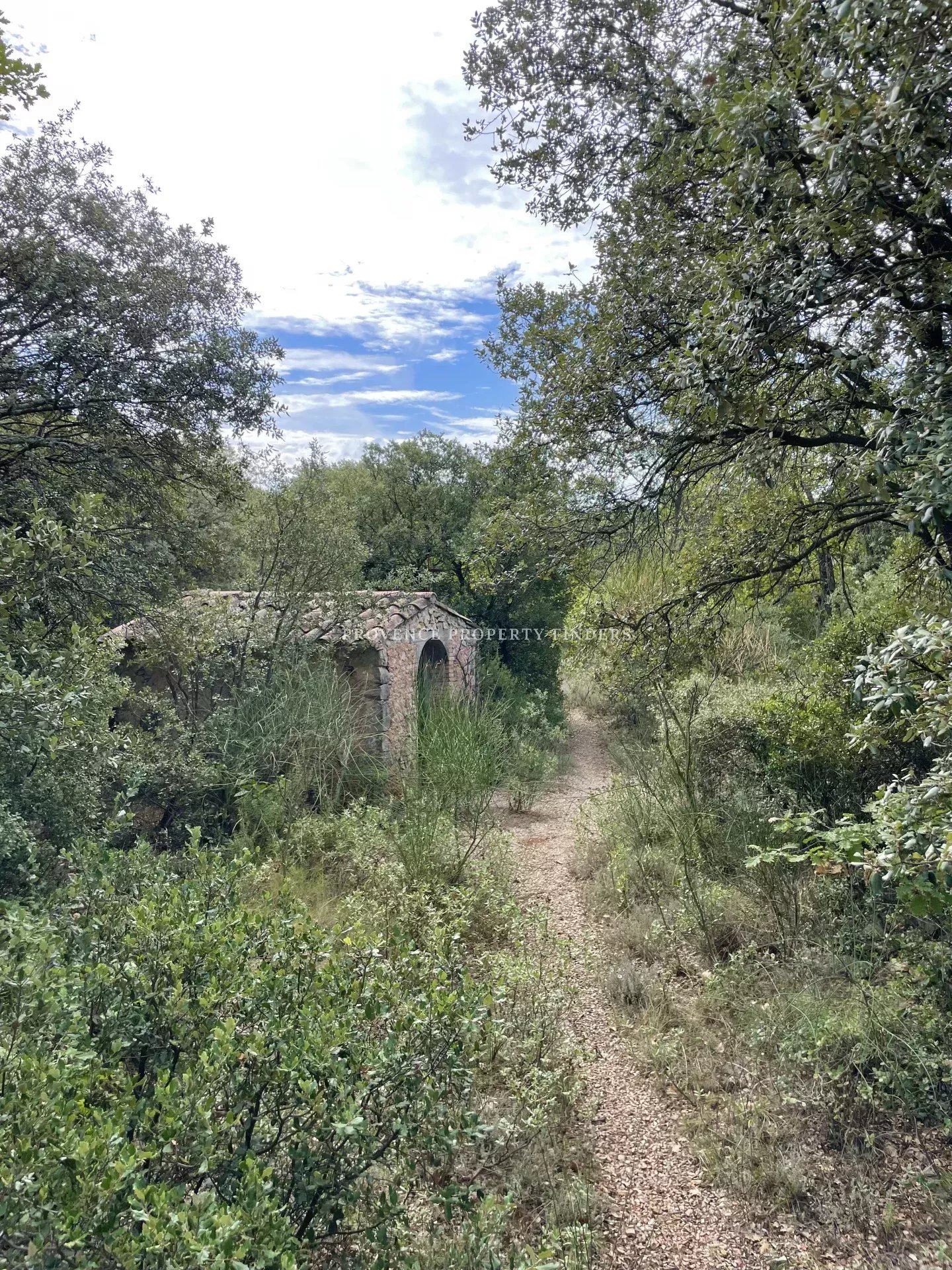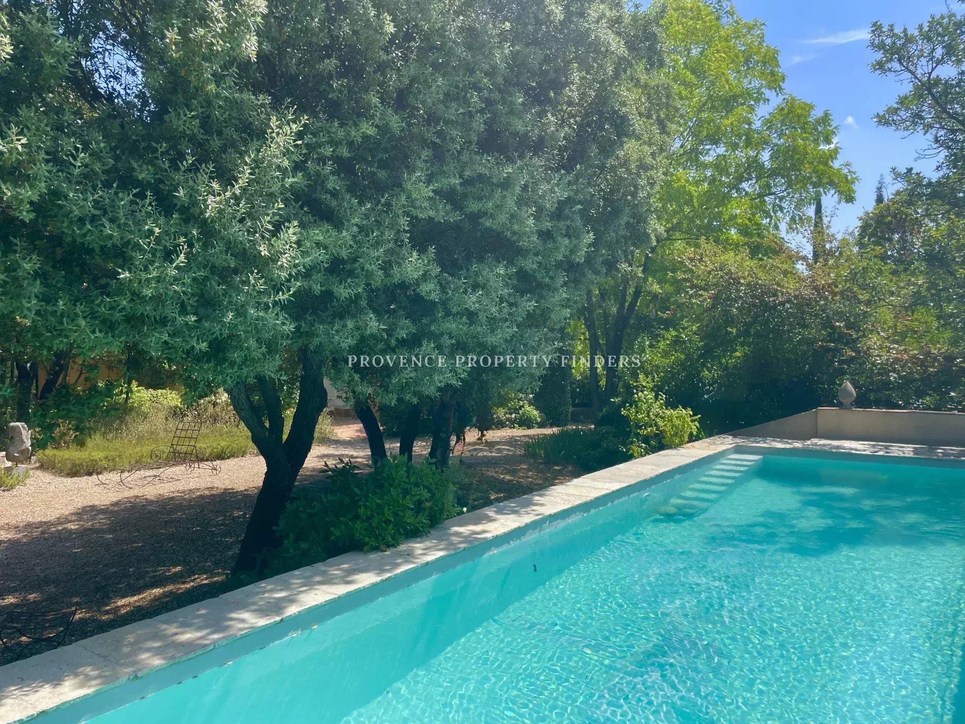 Le terrain de plus de 2 hectares offre une intimité totale, avec une grande terrasse, une belle piscine au sel, et des sentiers privés parmi la végétation provençale.