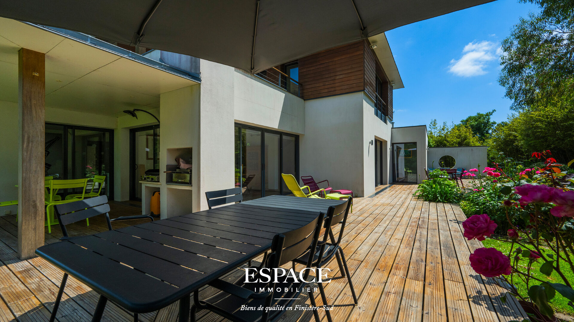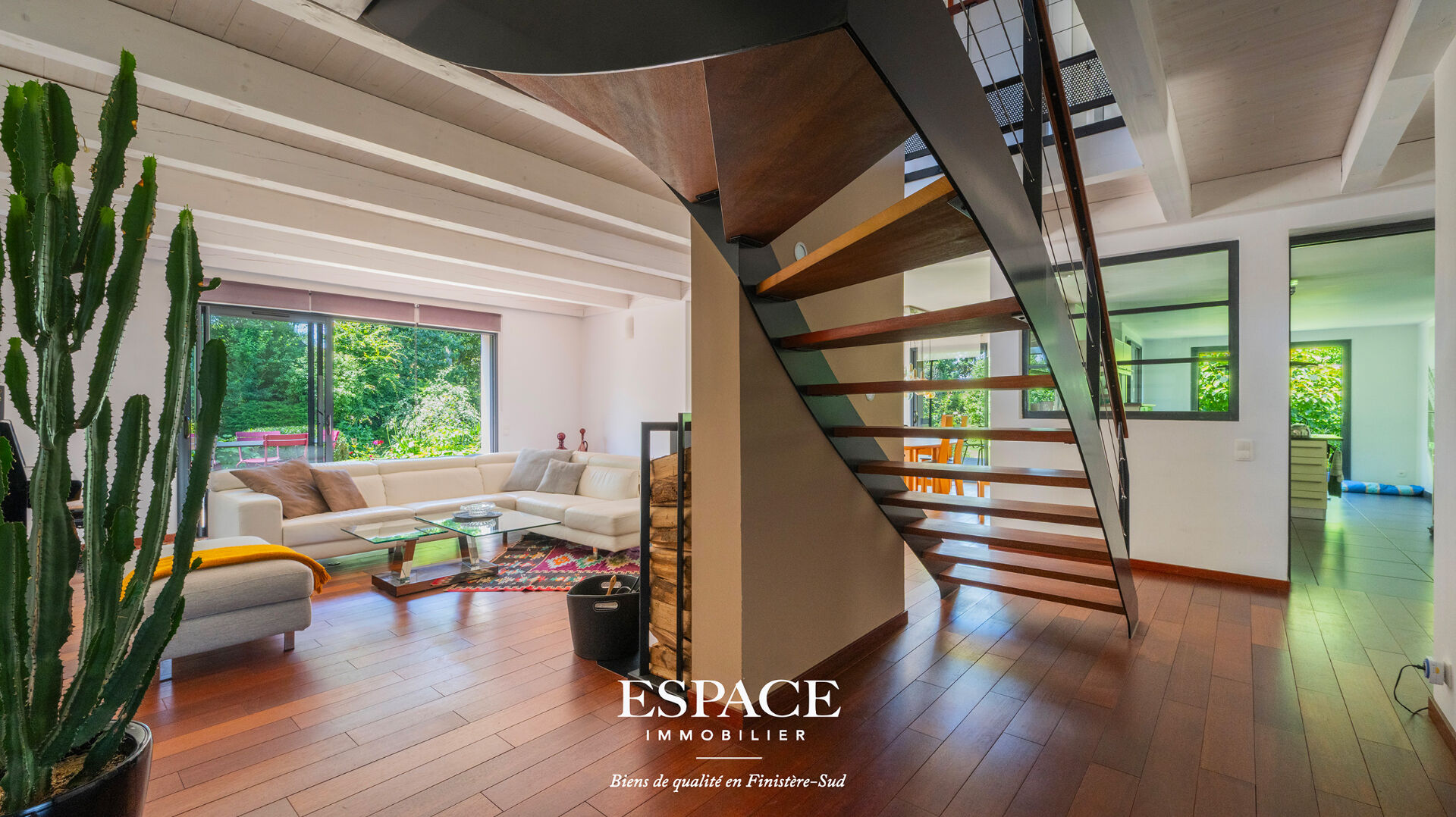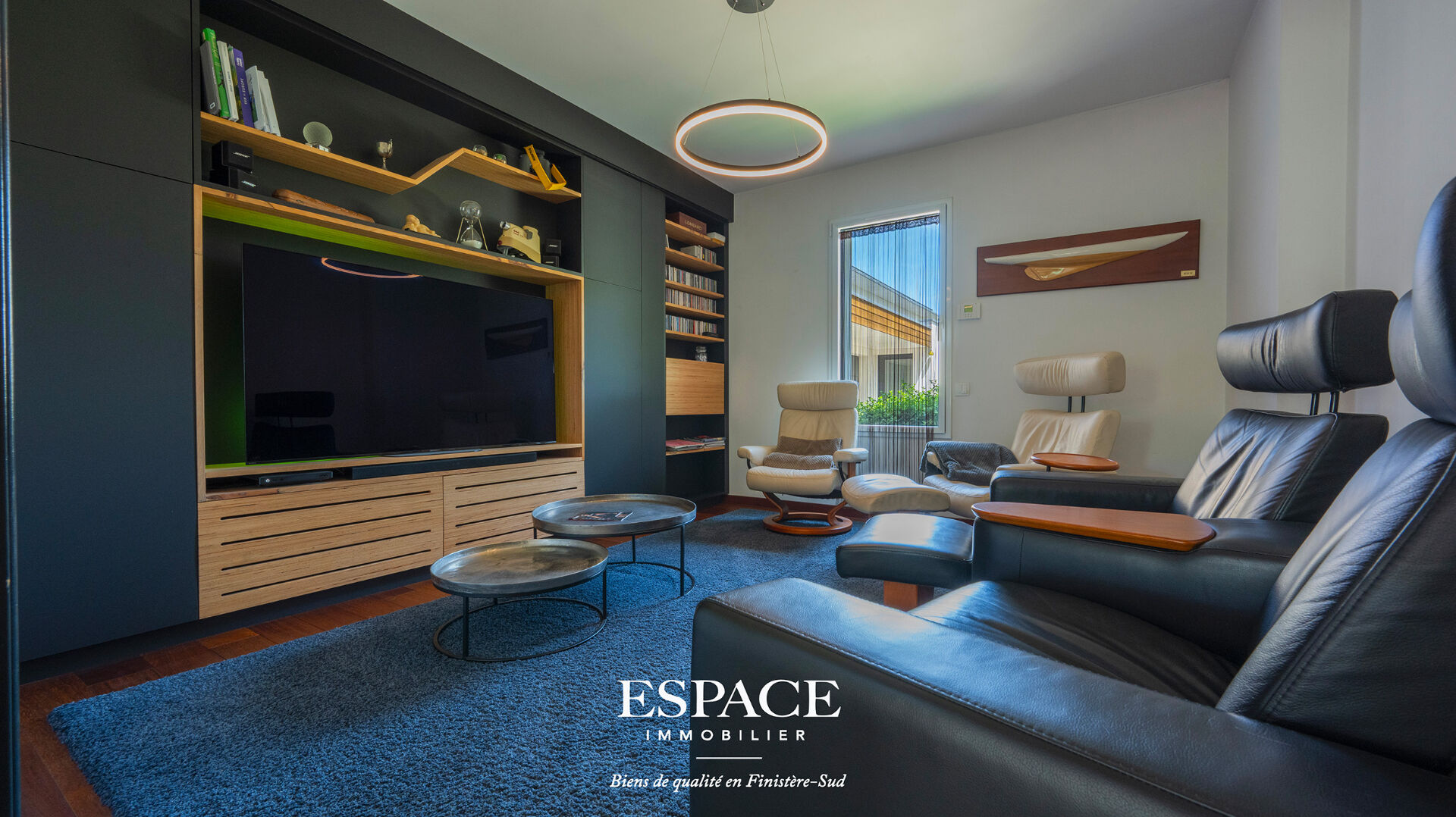 Trégunc aux portes de Concarneau, sublime maison d'architecte aux lignes audacieuses à seulement 2 kms des plages et des commerces, construite en 2009, offrant 327 m² habitables sur un terrain arboré de 2 665 m², au calme et sans vis-à-vis. Le rez-de-chaussée se compose d'une entrée d'un vaste salon-séjour lumineux avec poêle à bois, d'une cuisine ouverte avec arrière-cuisine, deux chambres dont une avec une suite parentale, dressing et salle d'eau, ainsi que d'un espace bien-être comprenant une salle de sport, un jacuzzi et une salle d'eau. A l'étage, vous trouverez deux autres chambres, un bureau, une salle d'eau et une terrasse pour profiter des extérieurs. Un T2 indépendant de 40 m² complète l'ensemble, idéal pour du locatif, une activité professionnelle, ou pour recevoir en toute autonomie. La maison est également équipée de panneaux solaires, alliant confort modernité et performance énergétique. Cuve de récupération d'eau de pluie enterrée de 10 000 l sur réseau secondaire. Un bien rare, spacieux et parfaitement situé, idéal pour une vie entre terre et mer. Pour visiter ou pour obtenir plus d'informations sur l'achat de cette maison contacter l' agence immobilière Espace Immobilier à Concarneau au 02.98.51.00.00 ou rejoignez-nous sur notre site internet www.ei-concarneau.com. Les informations sur les risques auxquels ce bien est exposé sont disponibles sur le site Géorisques [www.georisques.gouv.fr](http://www.georisques.gouv.fr). (3.60 % honoraires TTC à la charge de l'acquéreur.) Maryline ALVAREZ (EI) Agent Commercial - Numéro RSAC : ADC29032025000000020 - .