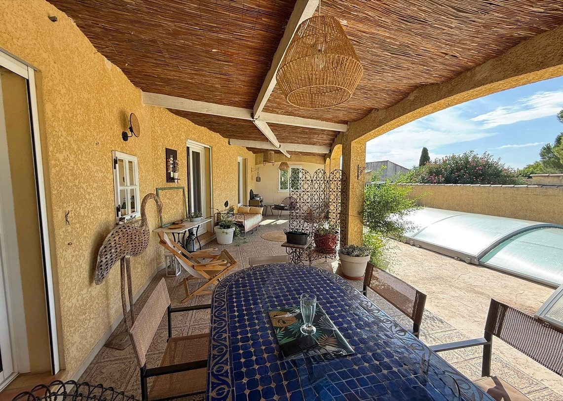 A VENDRE - SAINT-GERVASY Maison de 1997, plain-pied, 130 m2 habitable composée d'une entrée desservant un salon-séjour avec une cuisine ouverte meublée et équipée, trois chambres avec placards, une salle de bains et un WC. Nous retrouvons également une buanderie ainsi qu'un coin studio avec chambre et une salle d'eau avec un WC. Le tout avec garage et une belle piscine couverte sur une parcelle de 1021 m2. Taxe foncière : 1 817 euros Vous souhaitez organiser une visite ? Contactez-nous dès à présent par téléphone au 04 66 75 03 19 ou par mail : agence@bonheuralacle.fr